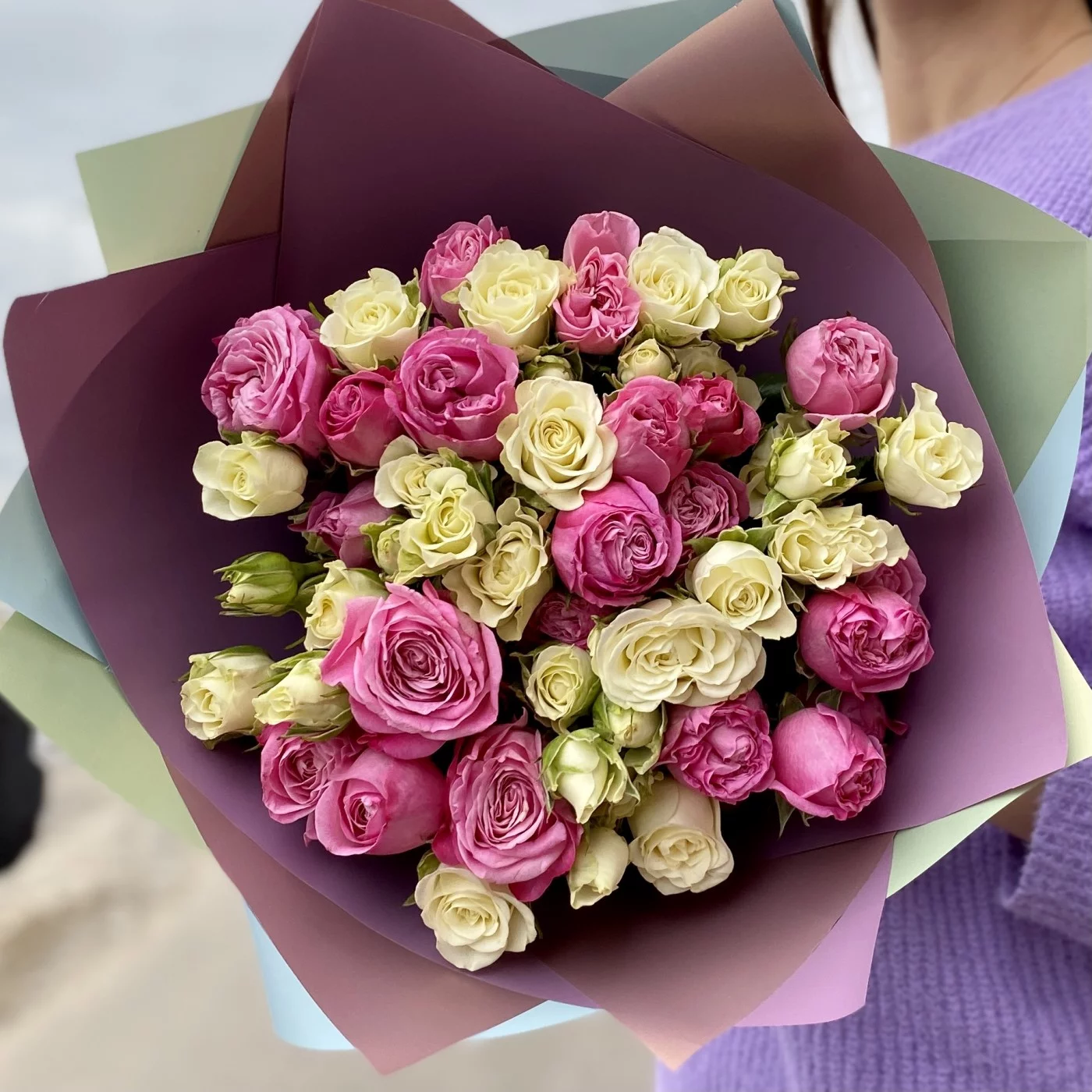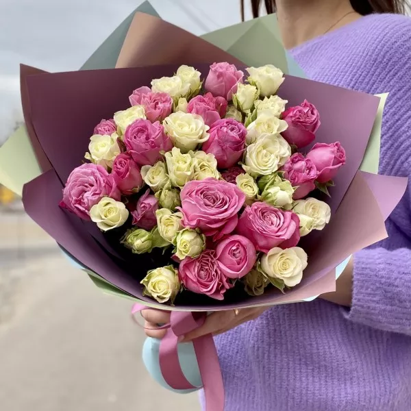 Нежный букет пионовидных роз сорта Леди Бомбастик и кустовых белых роз. Приятный комплимент на любое событие. Подарите пионовидные розы маме, жене или деловому партнеру.
