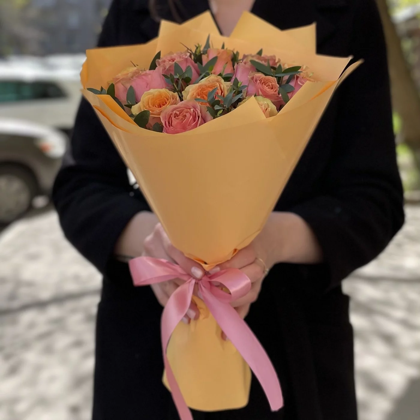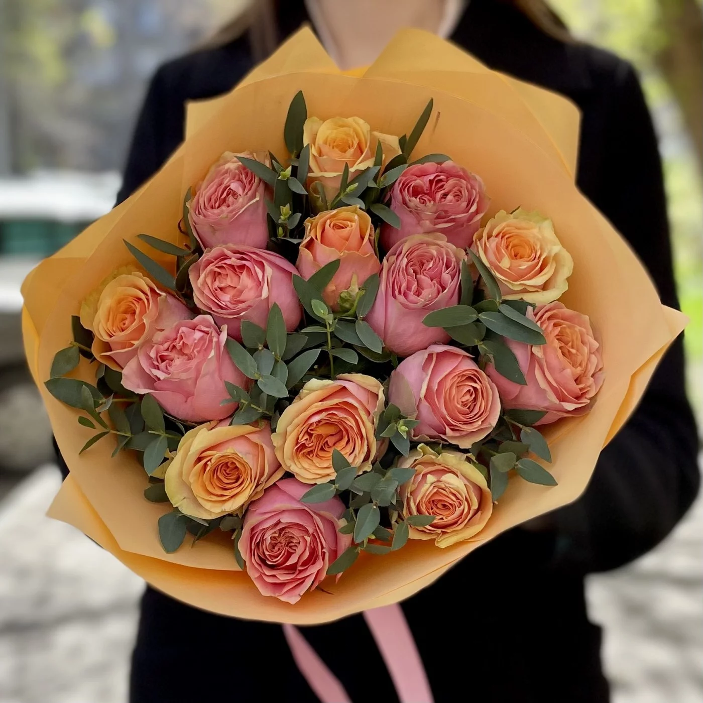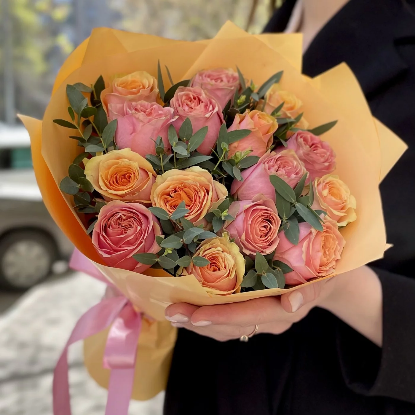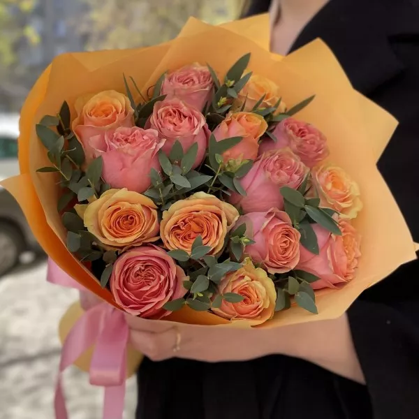 Яркий букет из пионовидных роз напоминающих сочное манго. Такой можно преподнести на день рождения или взять с собой на свидание. Роза имеет красивое раскрытие бутона и необычный цвет. В состав букета входит ароматный эвкалипт.