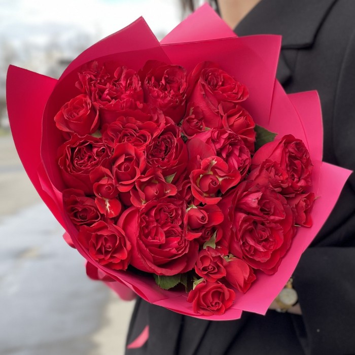 Букет малиново-красных пионовидных роз сорта Рауж Рояль с красными кустовыми розами. Прекрасный подарок на любое мероприятие.