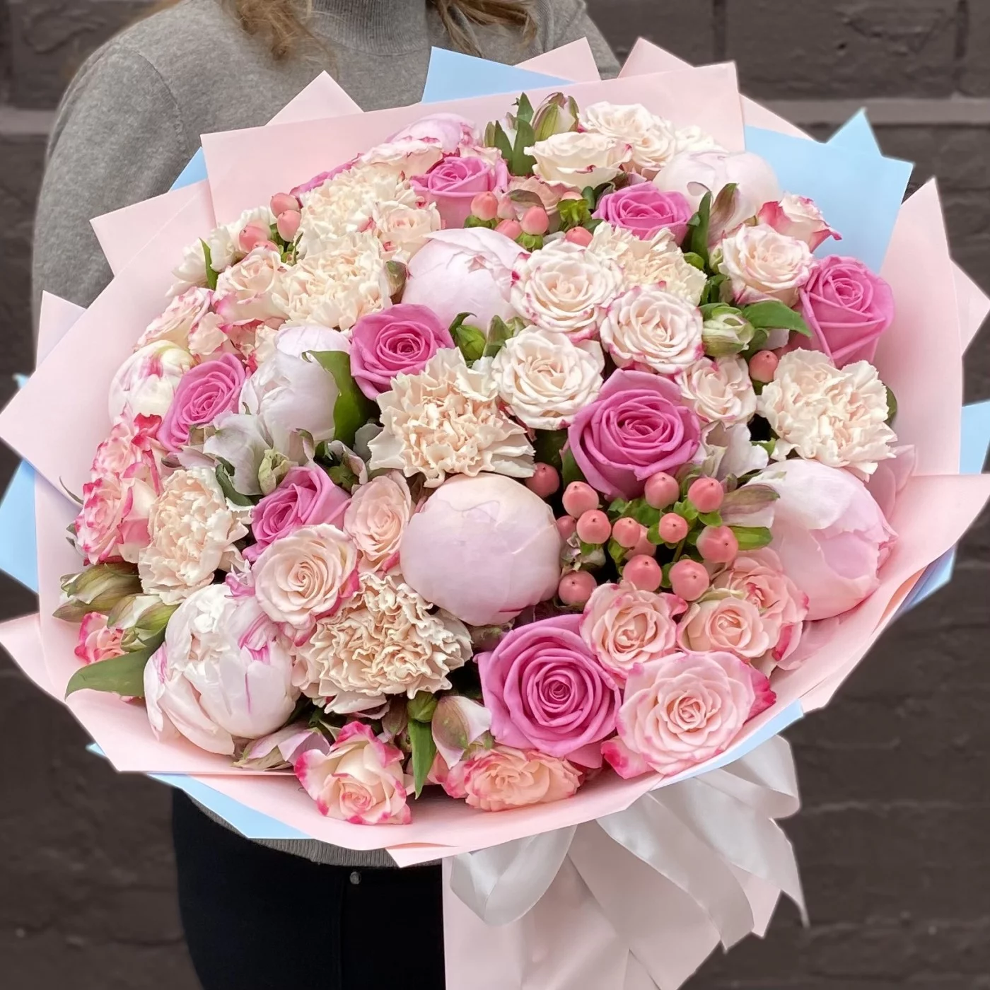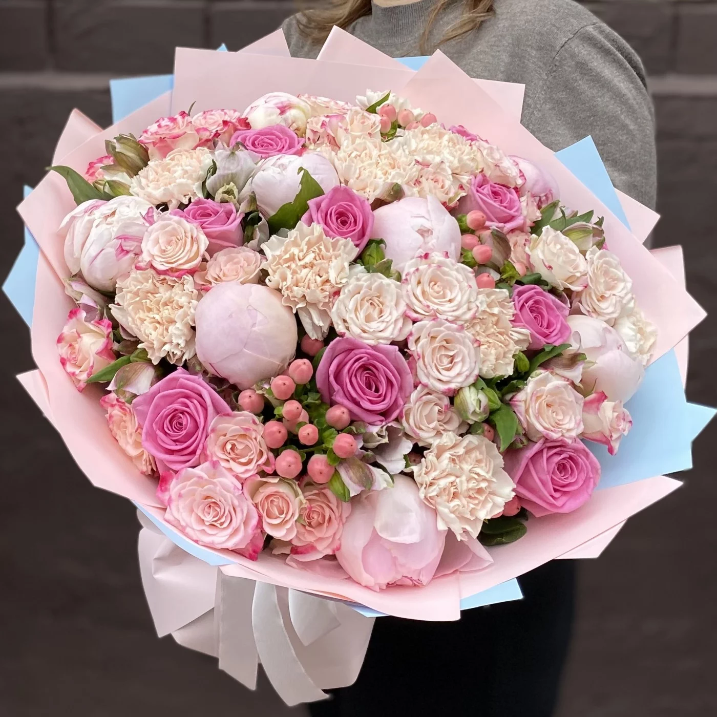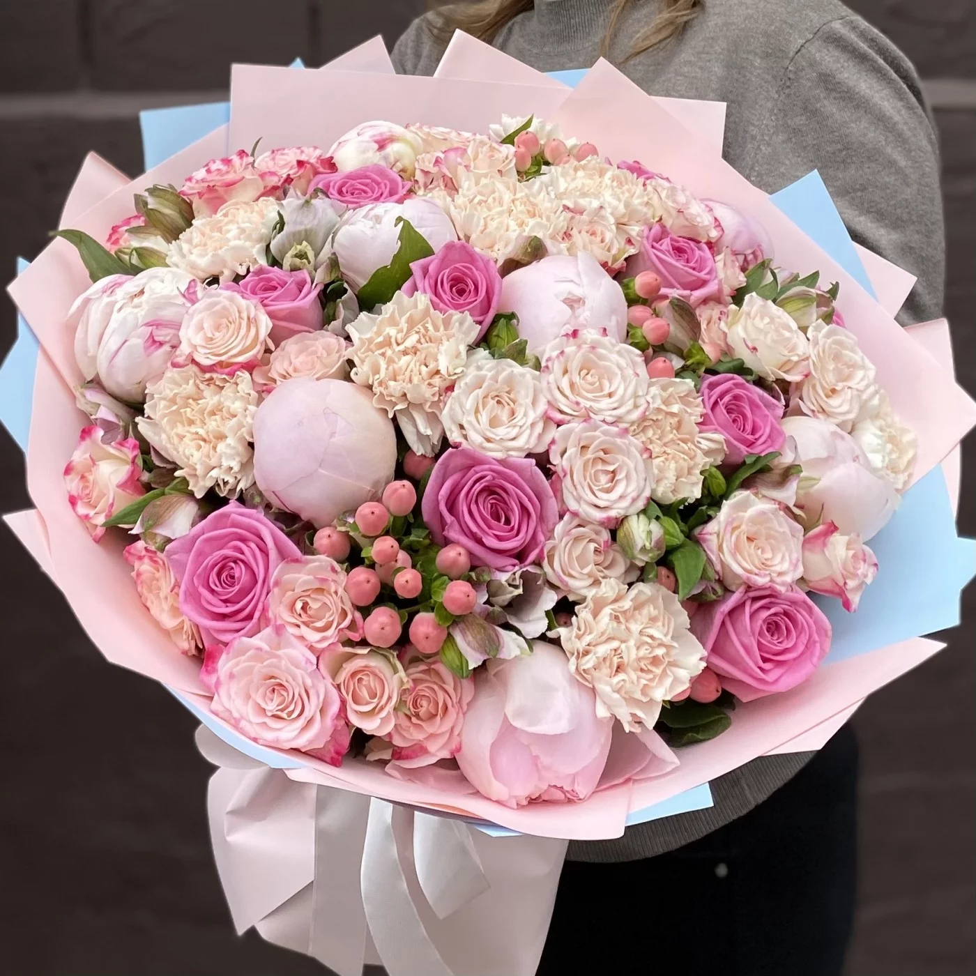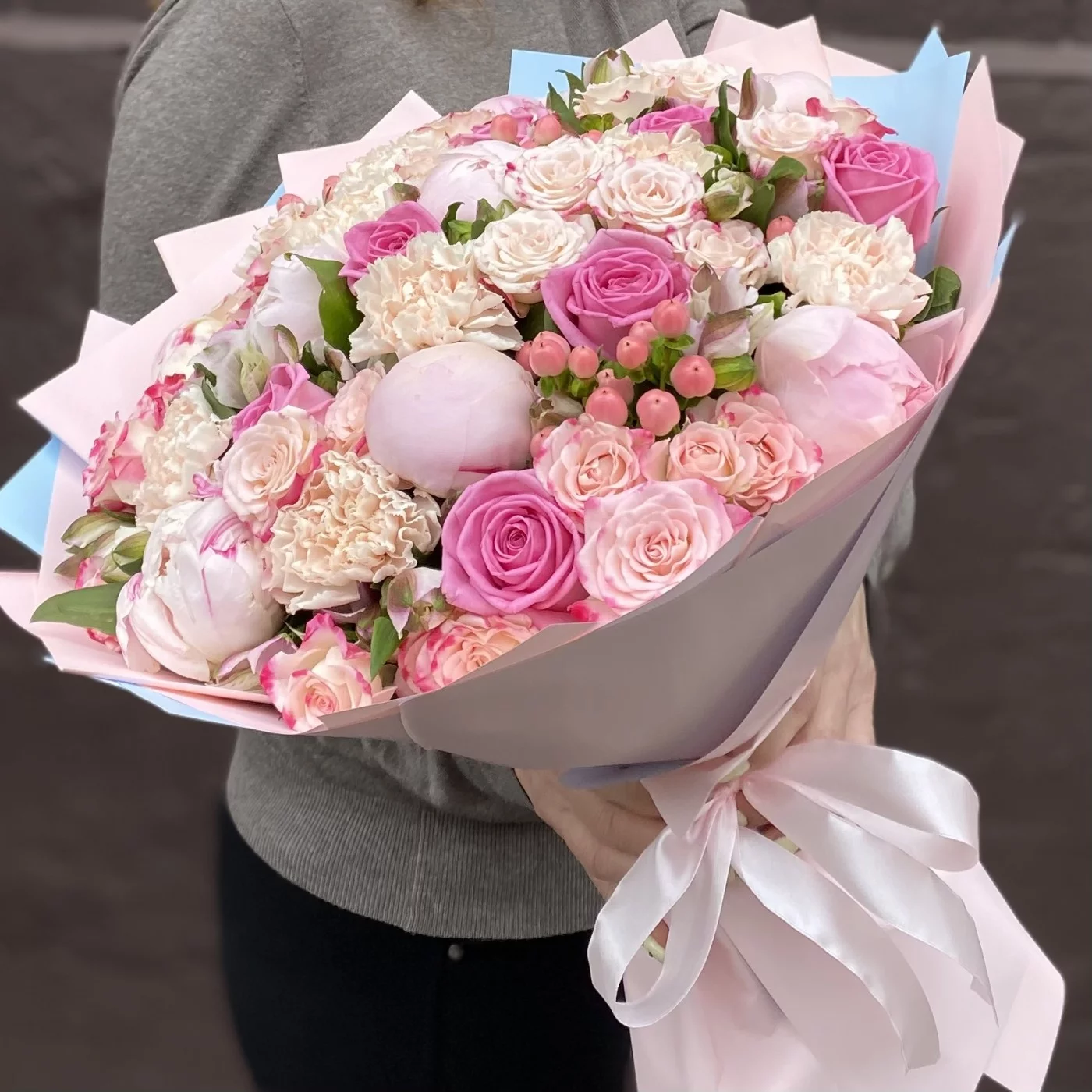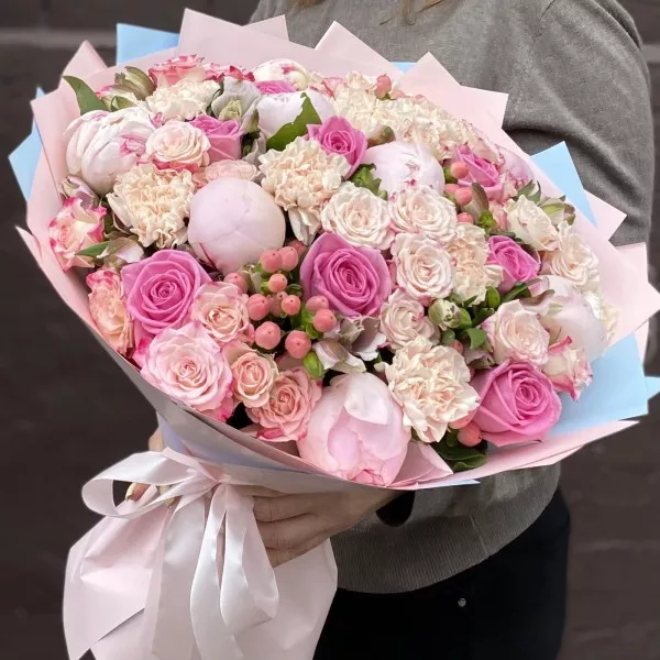 Нежный букет с ароматными пионами сорта Фестива и розами станет отличным признанием в любви для вашей избранницы.