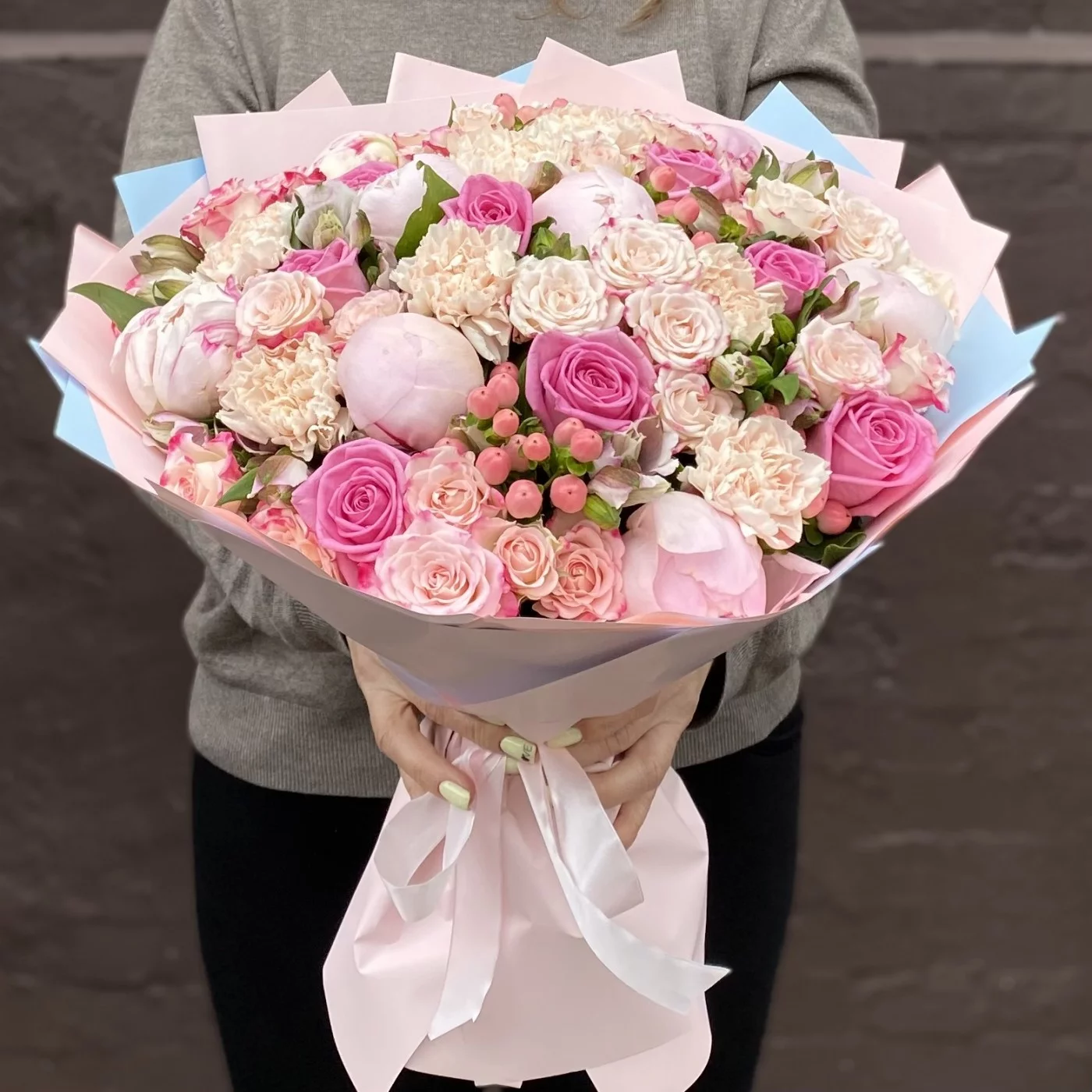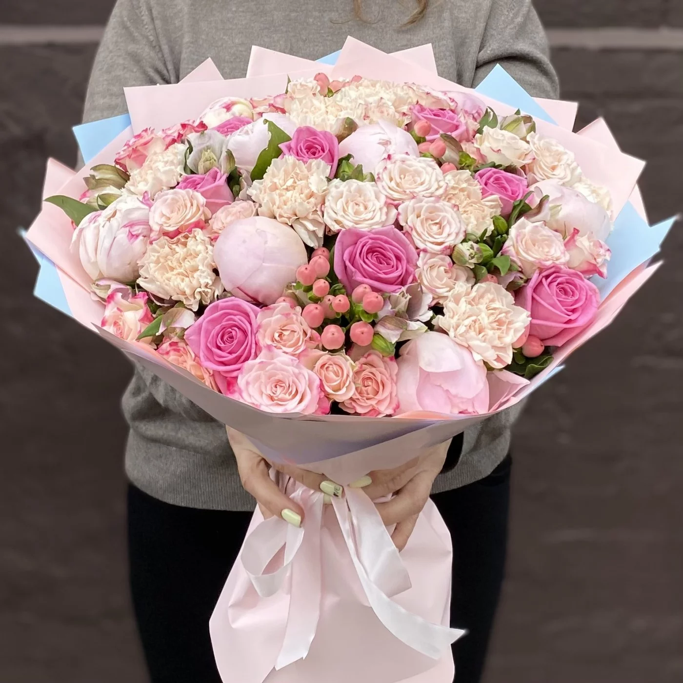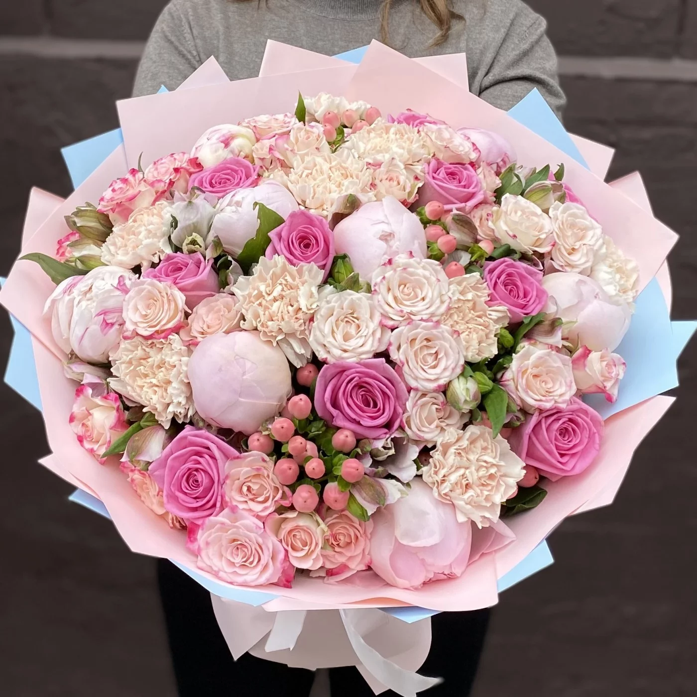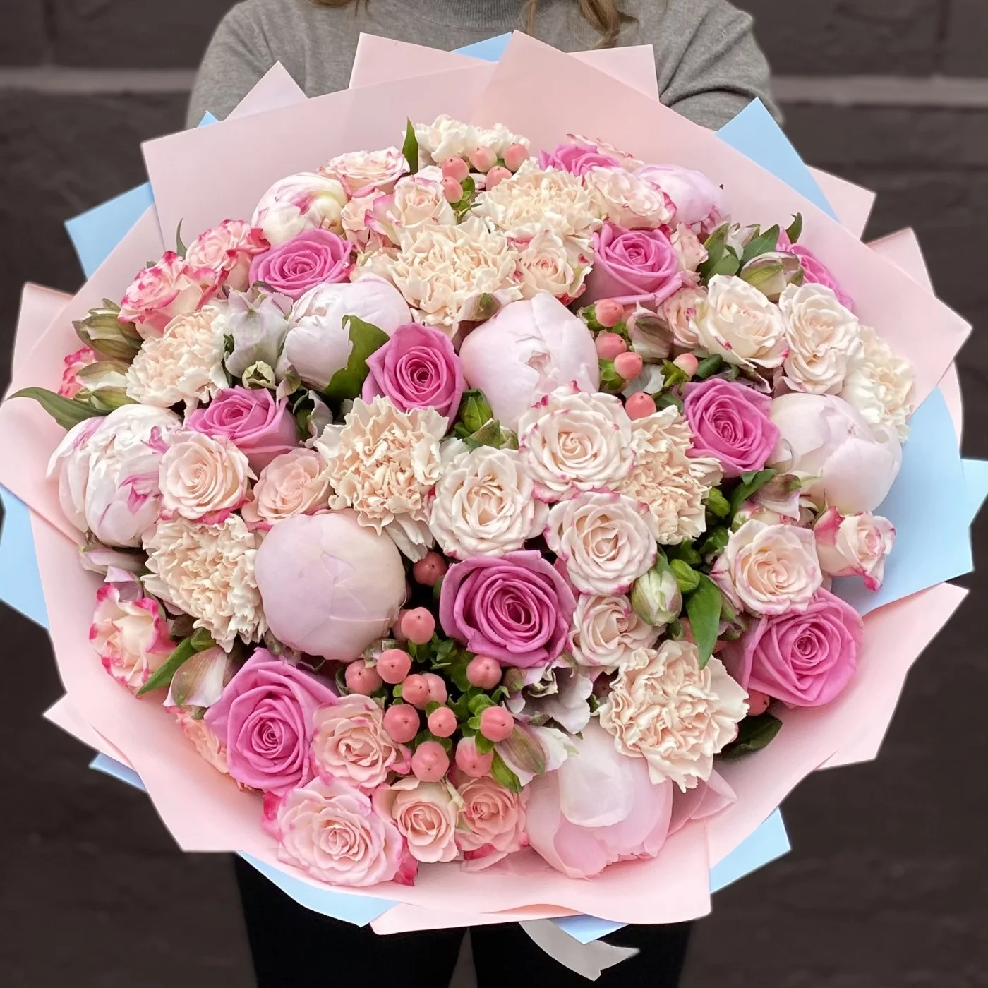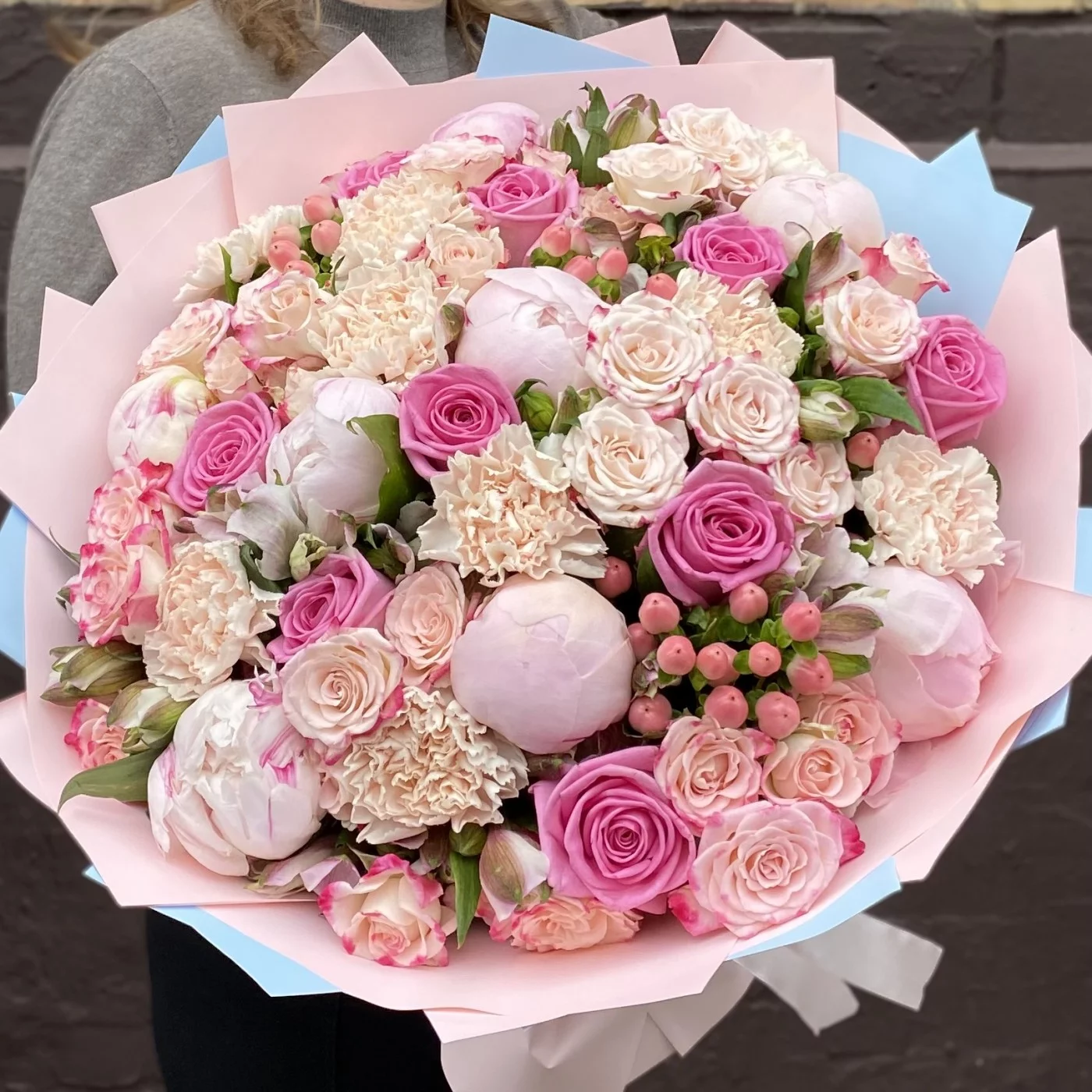 Нежный букет с ароматными пионами сорта Фестива и розами станет отличным признанием в любви для вашей избранницы.