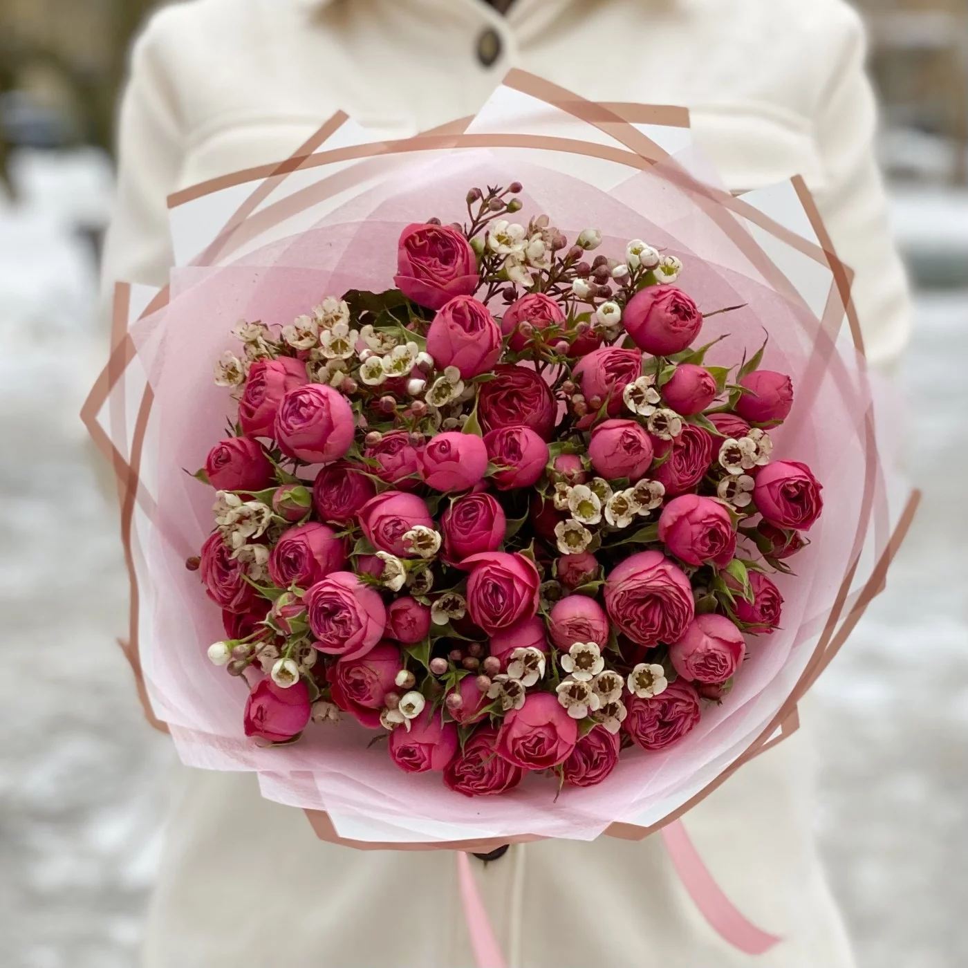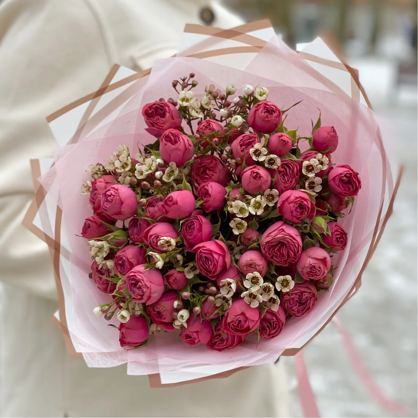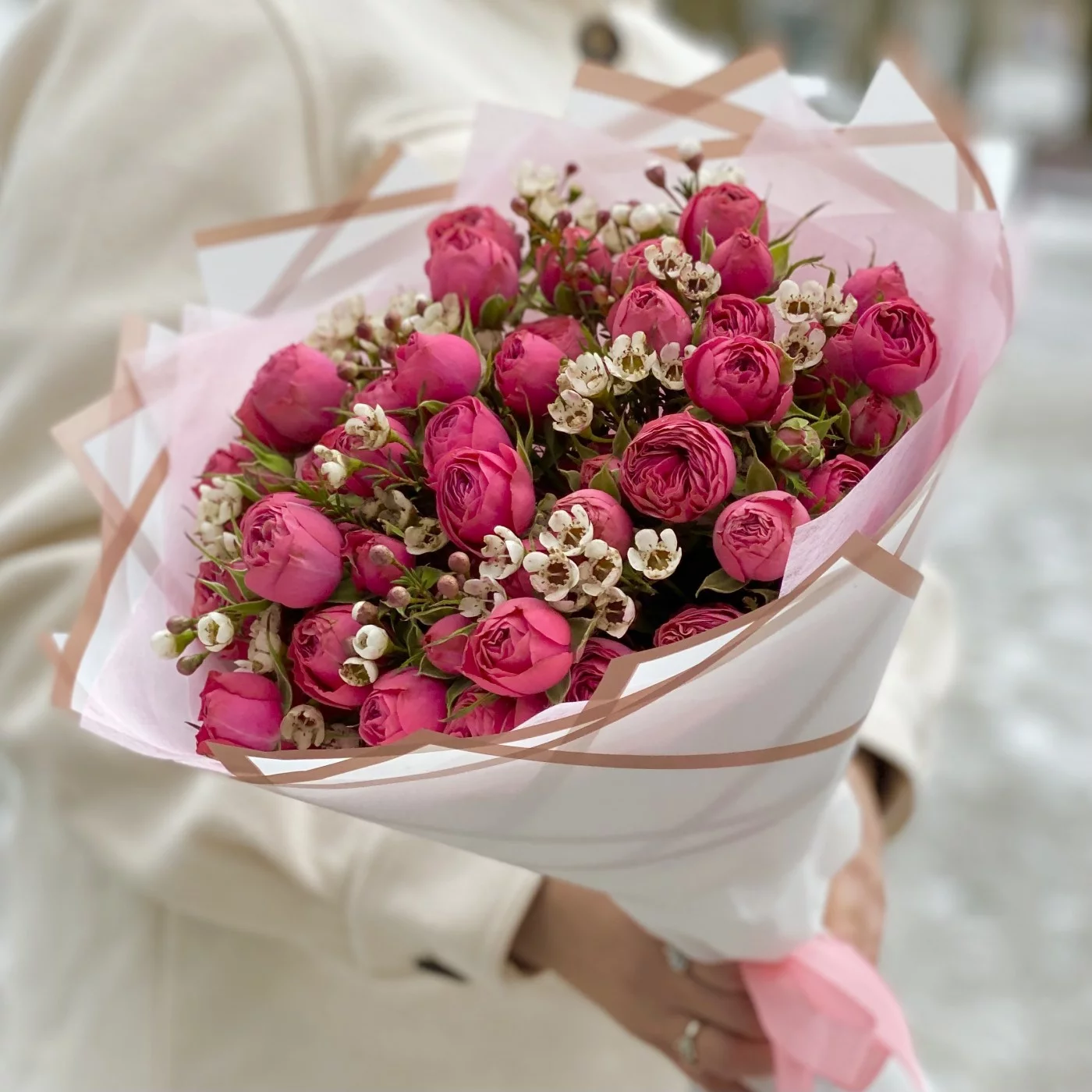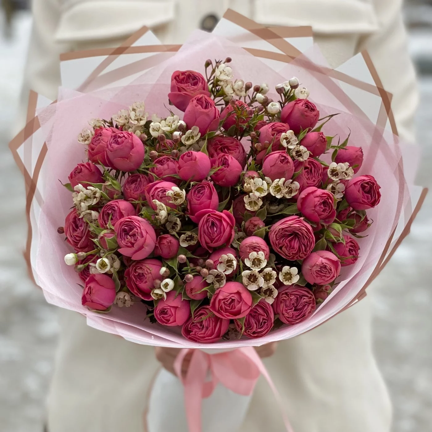 Букет пионовидных роз Гранд Трендсеттер с ваксфлауэром