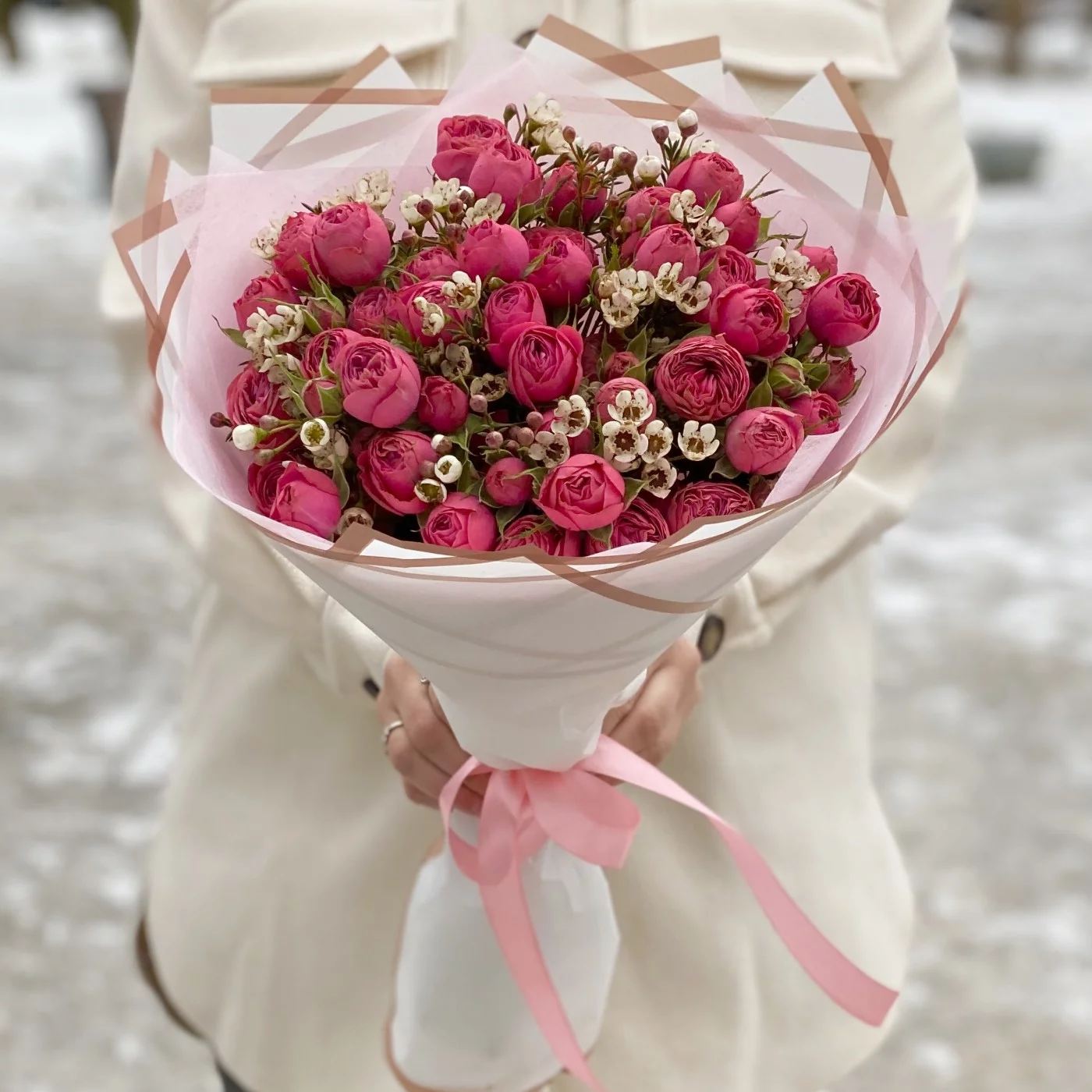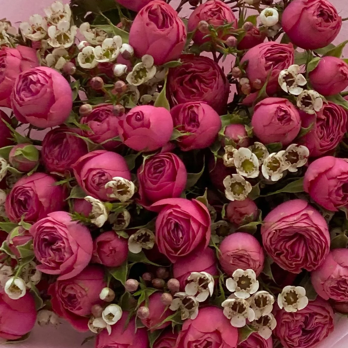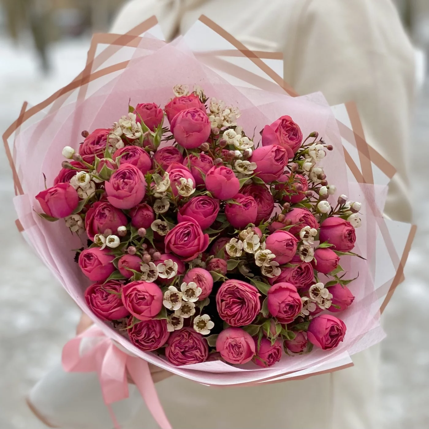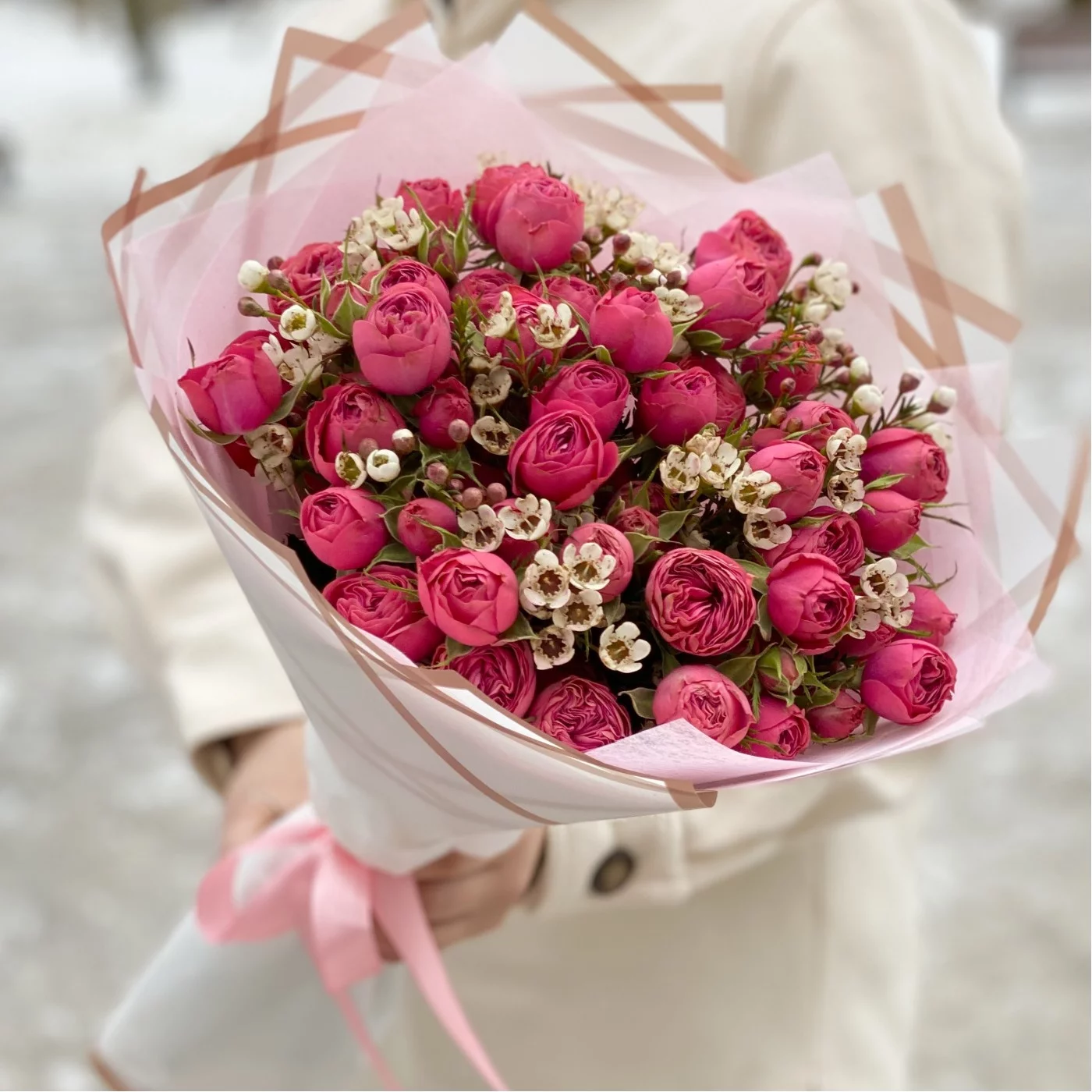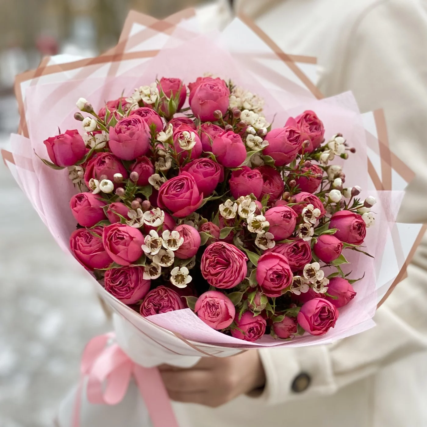 Букет пионовидных роз Гранд Трендсеттер с ваксфлауэром