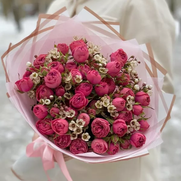 Букет малиновых пионовидных роз с ароматным ваксфлауэром подарит хорошее настроение и порадует своей изысканностью.