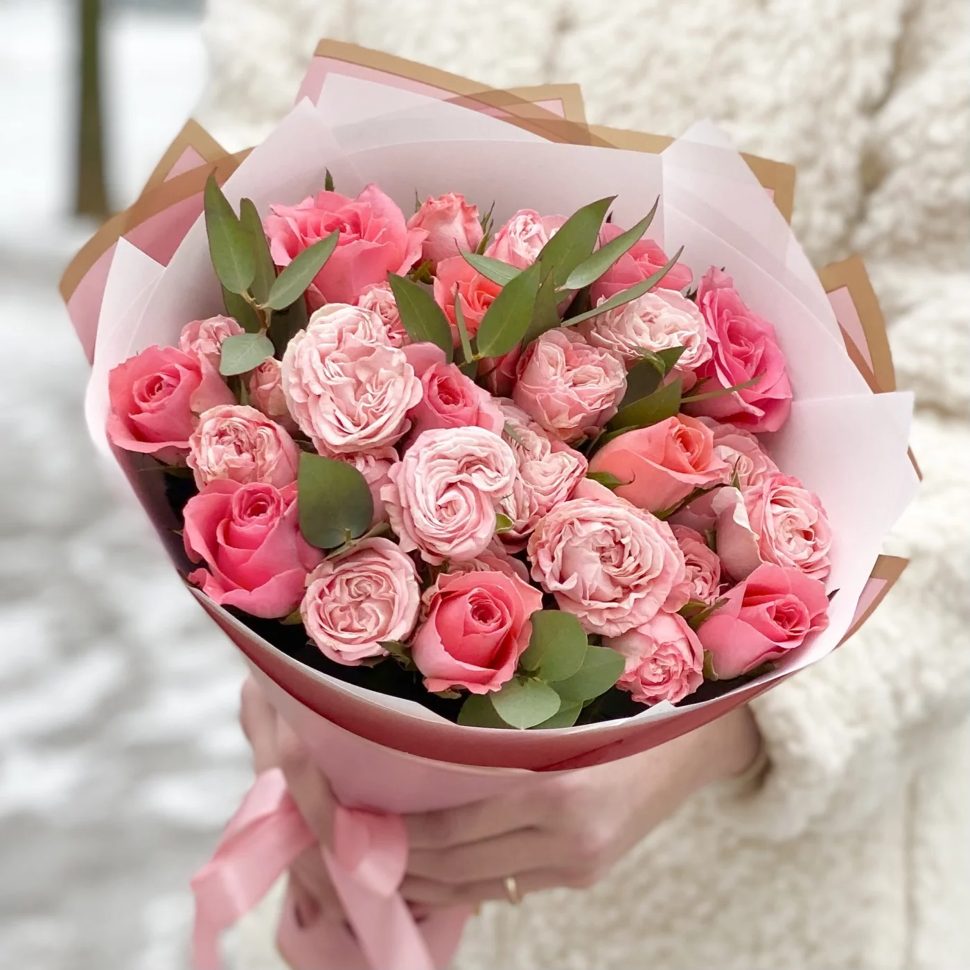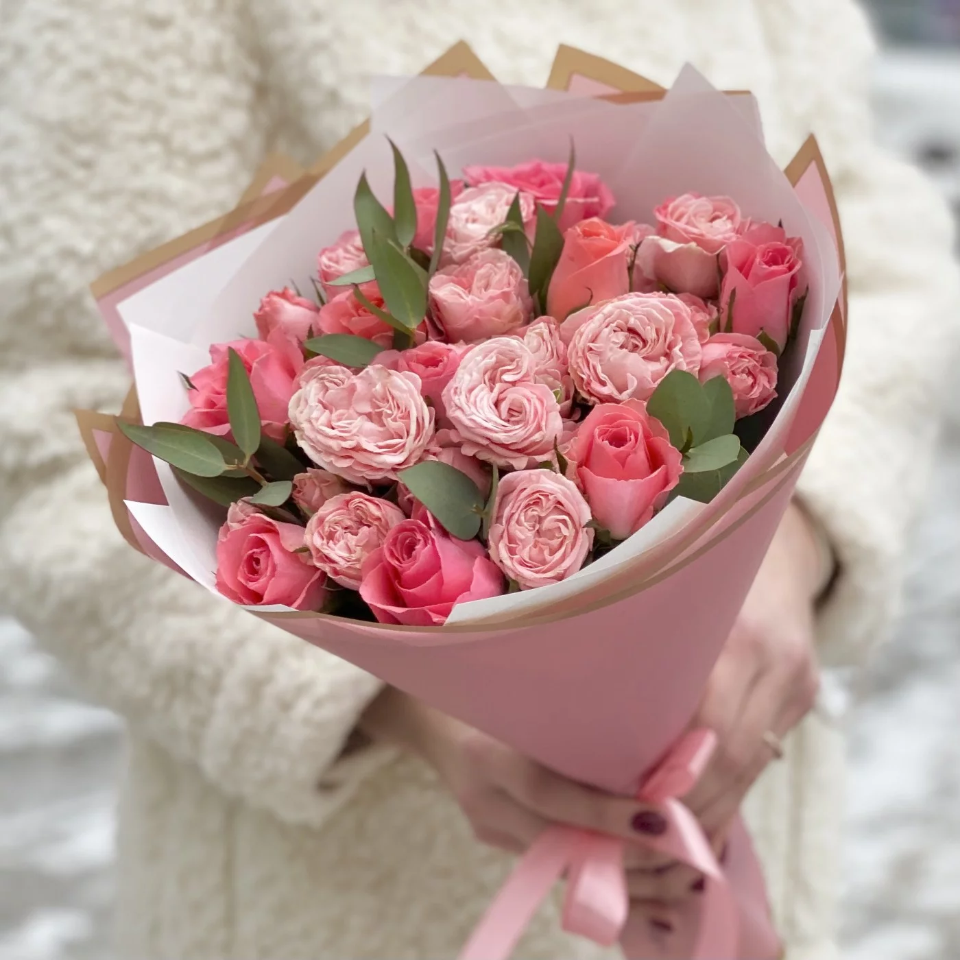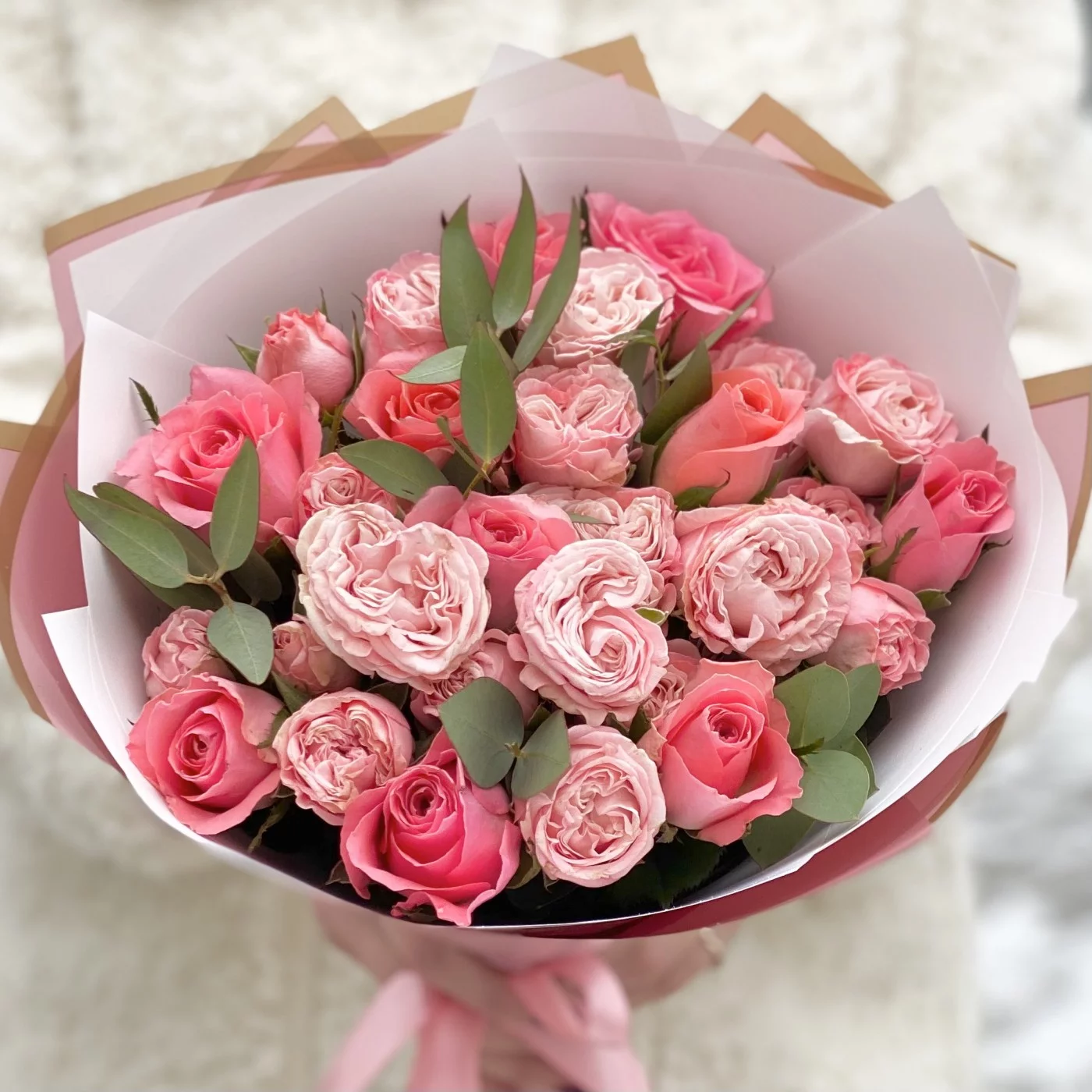Букет пионовидных роз Мадам бомбастик и Эйс пинк
