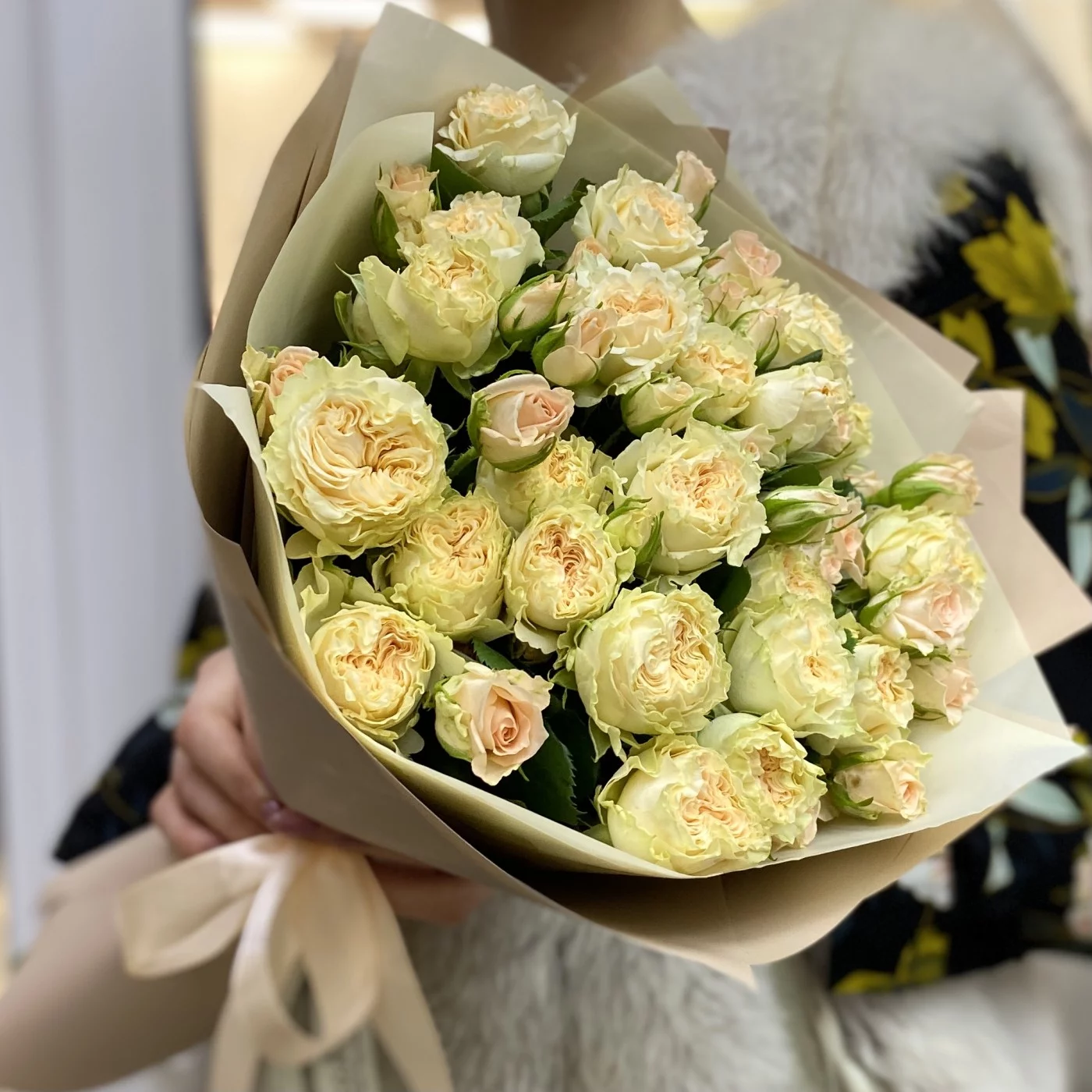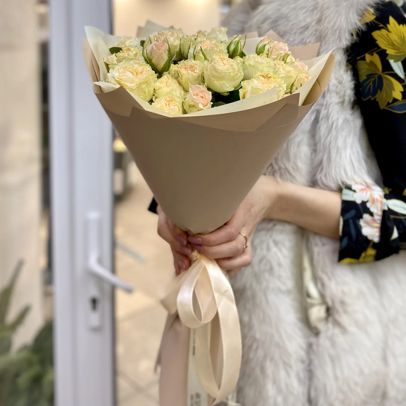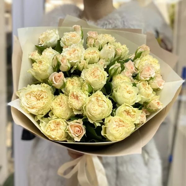 Букет из кустовых пионовидных роз сорта Саммер-роз и Свит Сара. Эта роза имеет очень красивый, ажурный и плотный бутон. Прекрасный букет на любое событие.