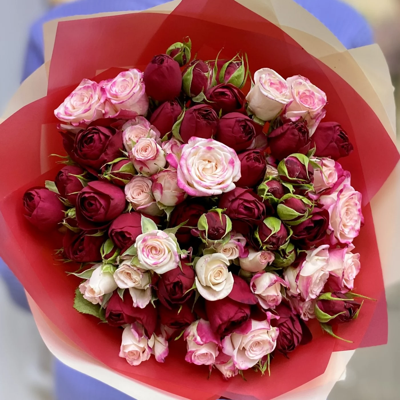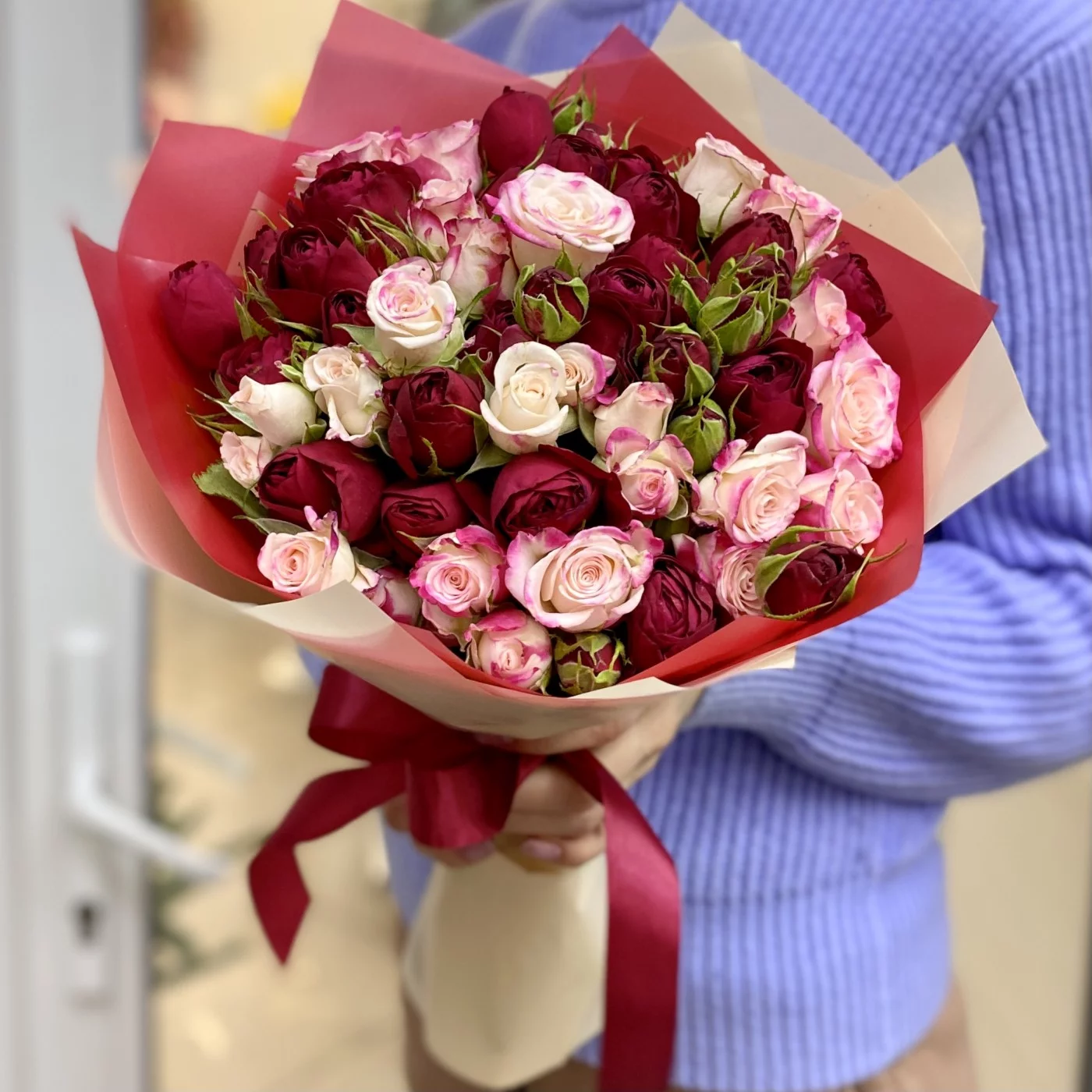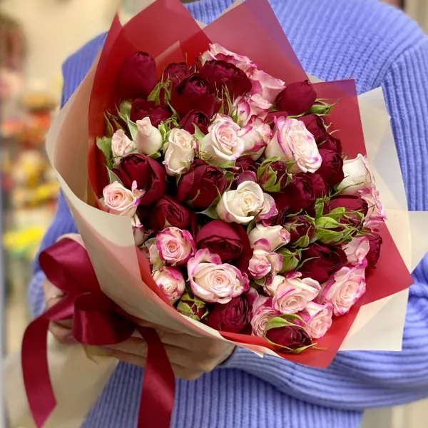 Букет из кустовых и пионовиднах роз. Такой небольшой букет можно преподнести в качестве благодарности или знака внимания. Также такой букет можно взять с собой на свидание, этот букет точно должен понравиться вашей второй половинке.
