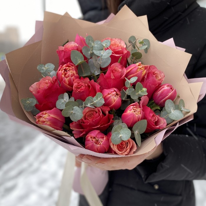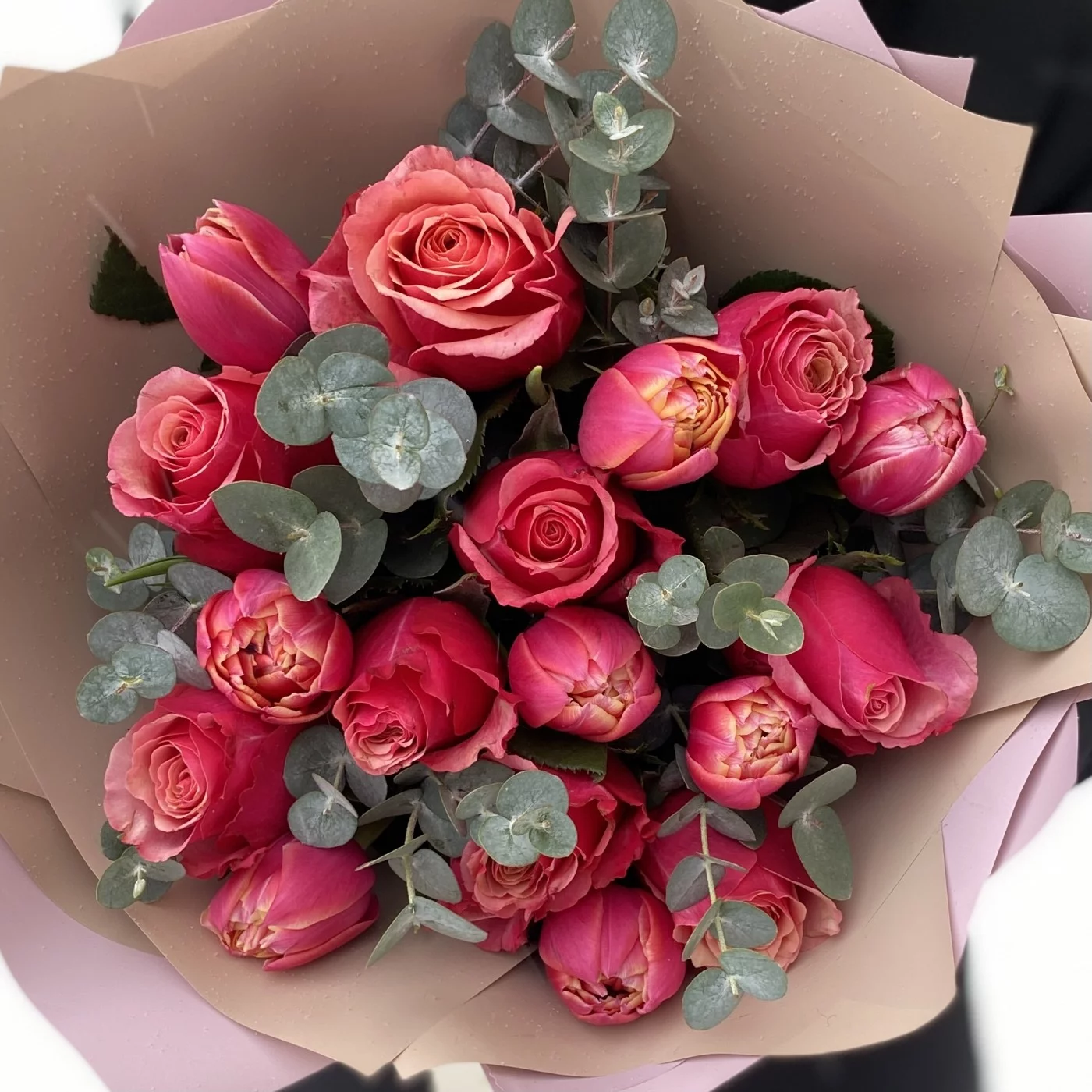 Букет из роз сорта Помпиду с пионовидными тюльпанами Колумбус. Красивый и праздничный букет на любое событие. Розы и тюльпаны имеют одинаковую расцветку от малинового до кремового. Тюльпаны махровые и при роспуске становятся крупными и ароматными.
