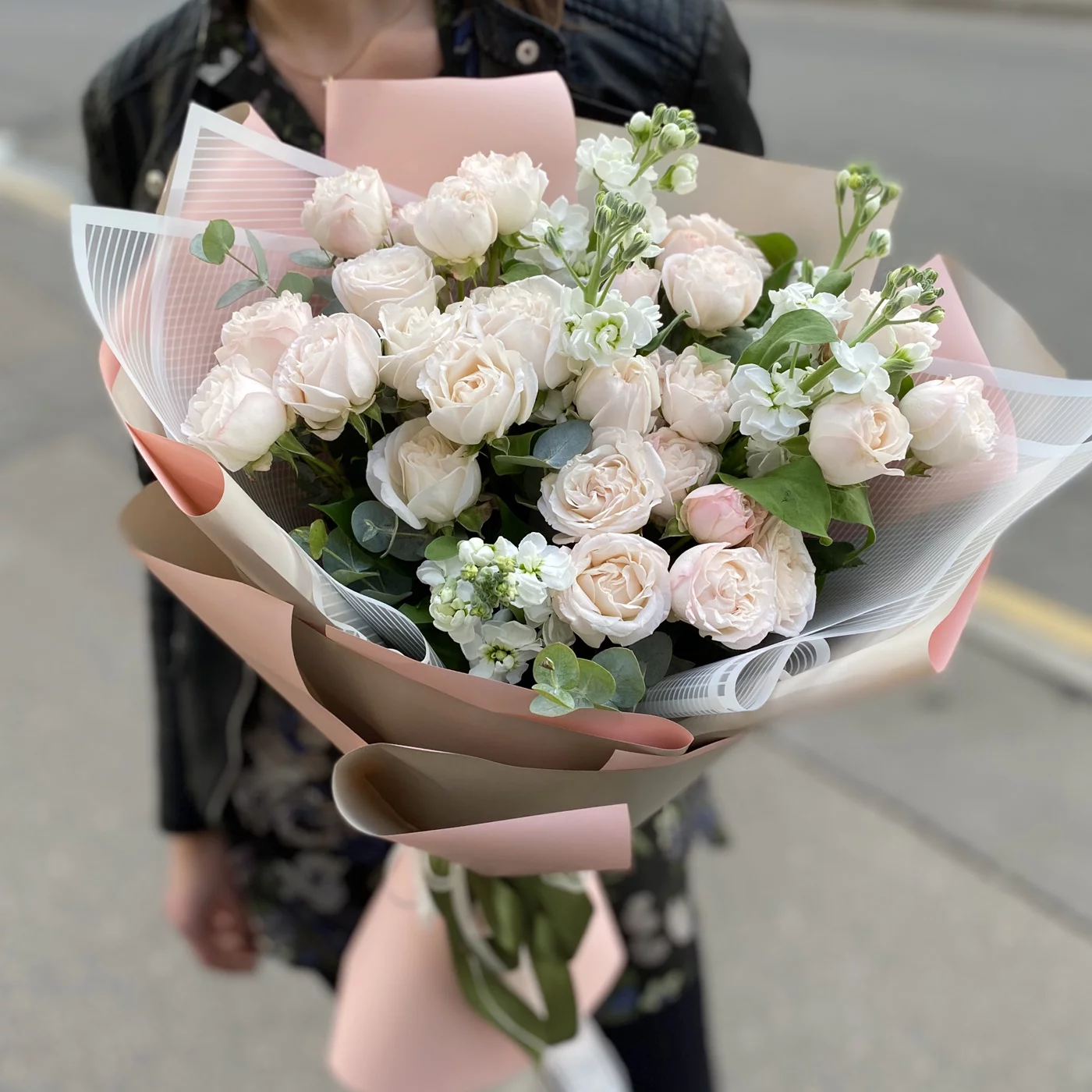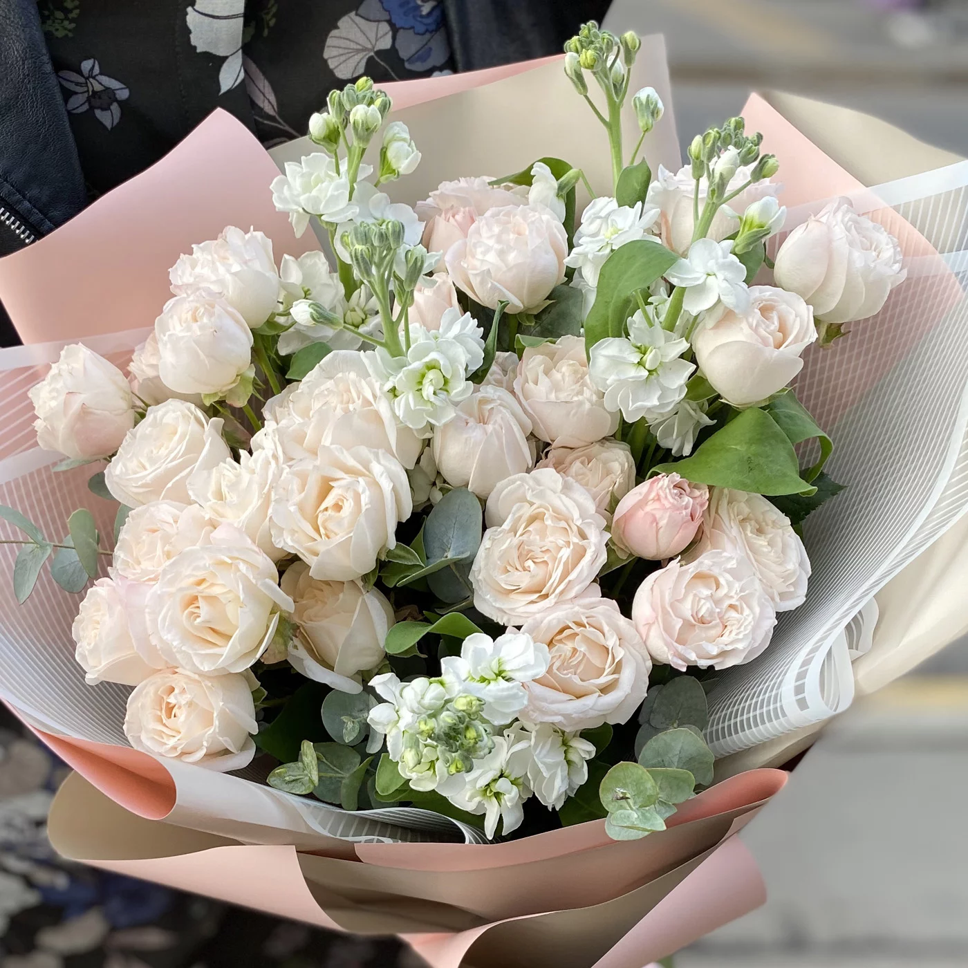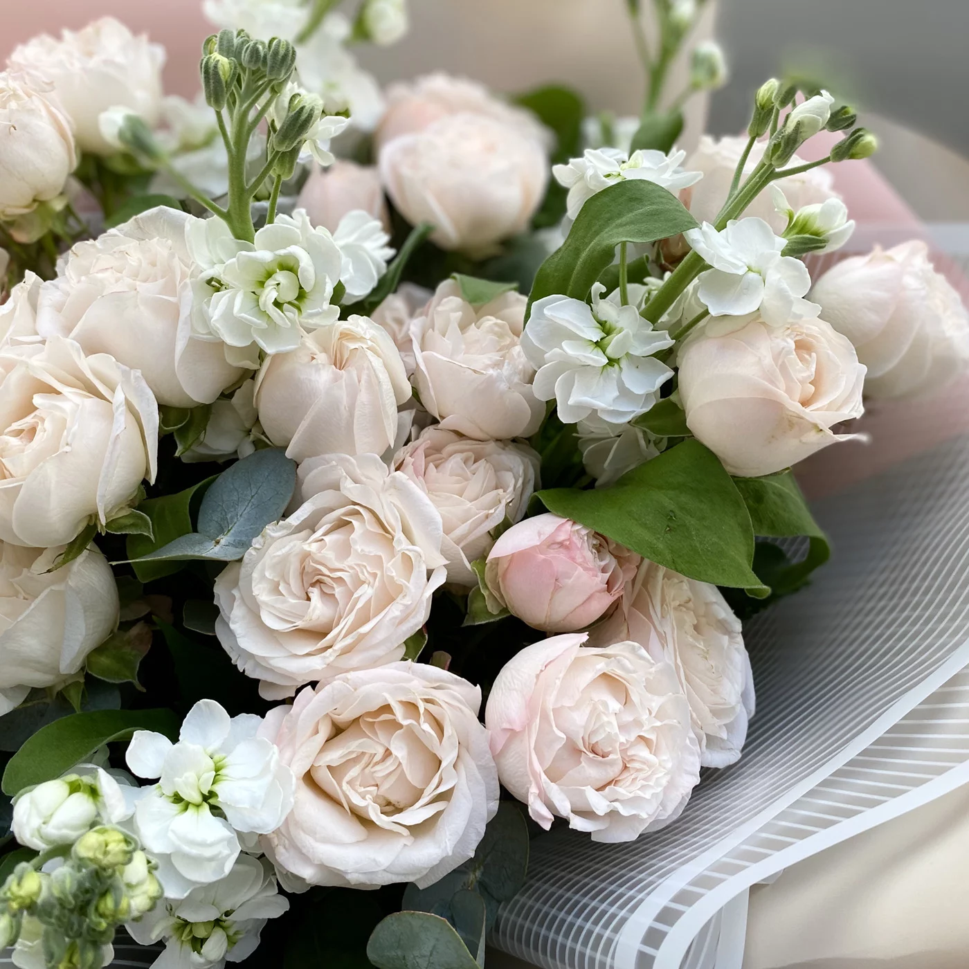 Воздушный, стильный букет из пионовидных роз, ароматной маттиолы и нежного эвкалипта порадует получателя в качестве дополнения к подарку на день рождения, свадьбу. Букет собран с любовью флористами ROZA4U.