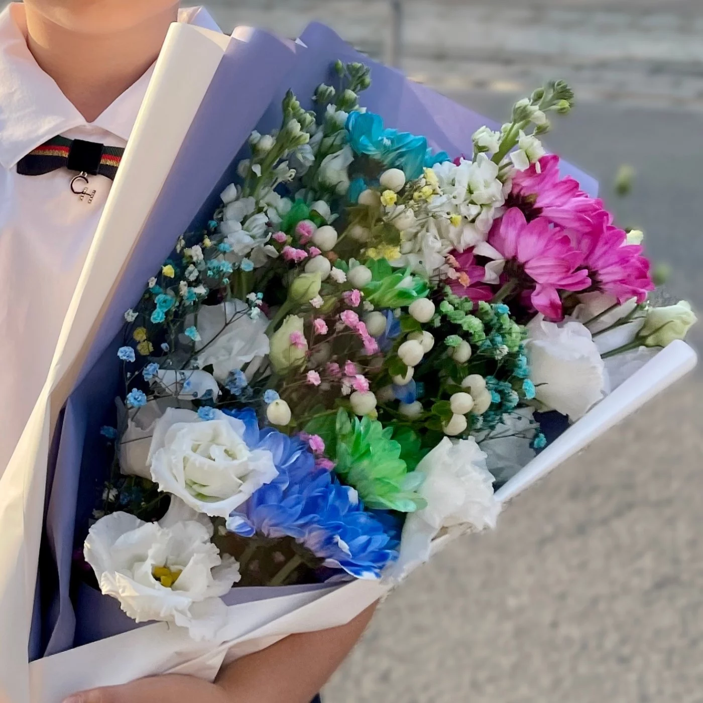 Милый и необычный букет вызовет восторг у вашего ребенка! Воздушная гипсофила и хризантемы переливаются всеми цветами радуги, а ягоды гиперикума добавляют букету особый шарм. Букет очень легкий поэтому его сможет торжественно нести даже первокласник или выпускник детского садика.