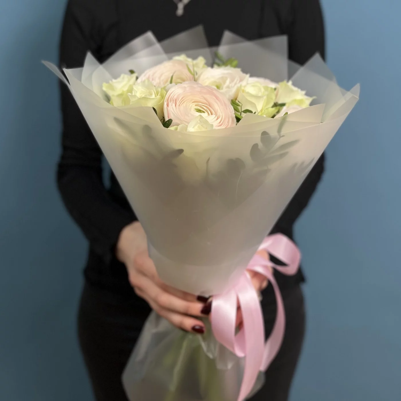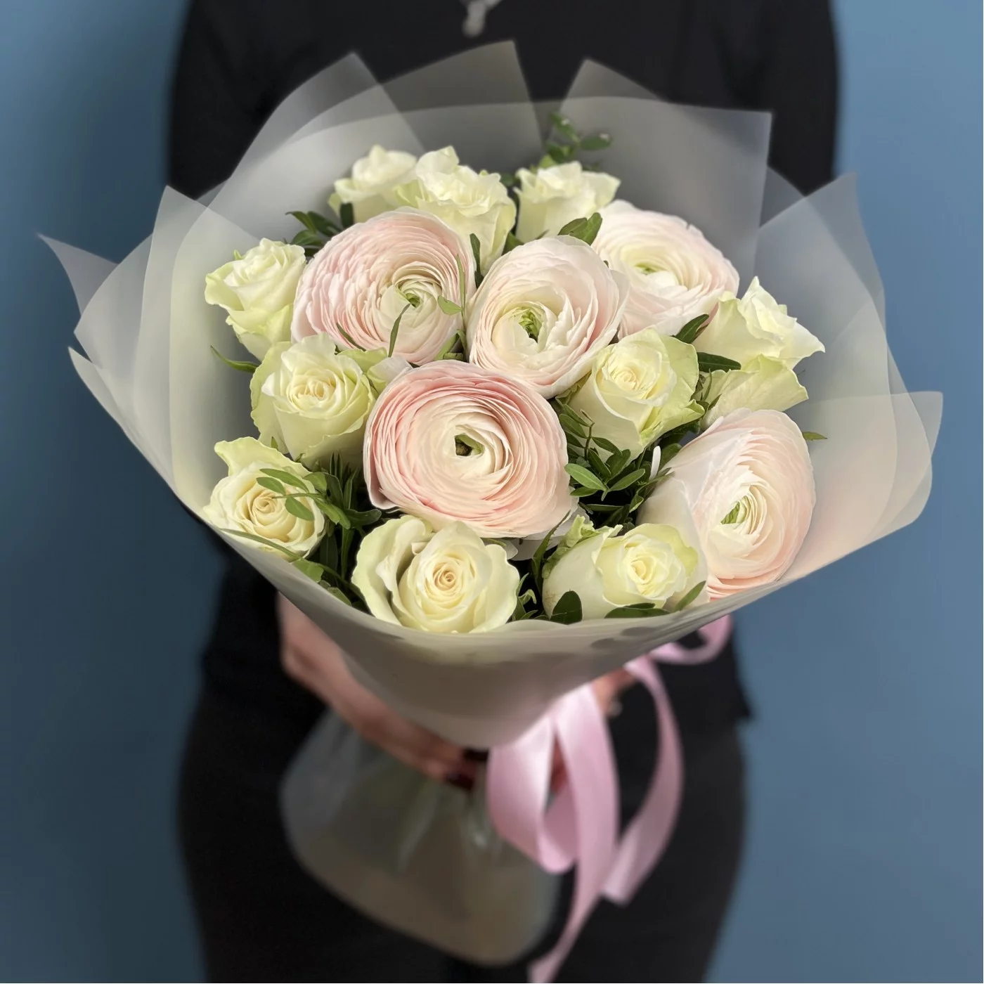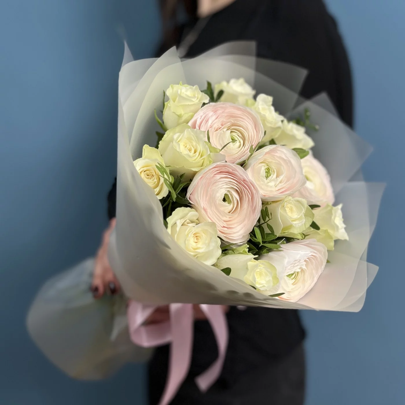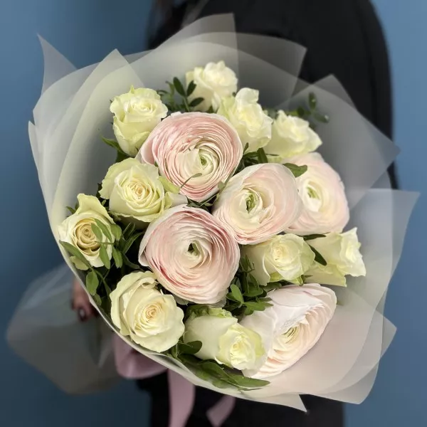 Ранункулюсы Ханой в пастельных оттенках создают атмосферу нежности и очарования, в то время как белые розы символизируют чистоту и искренность. Это сочетание передает глубокие чувства и эмоции.