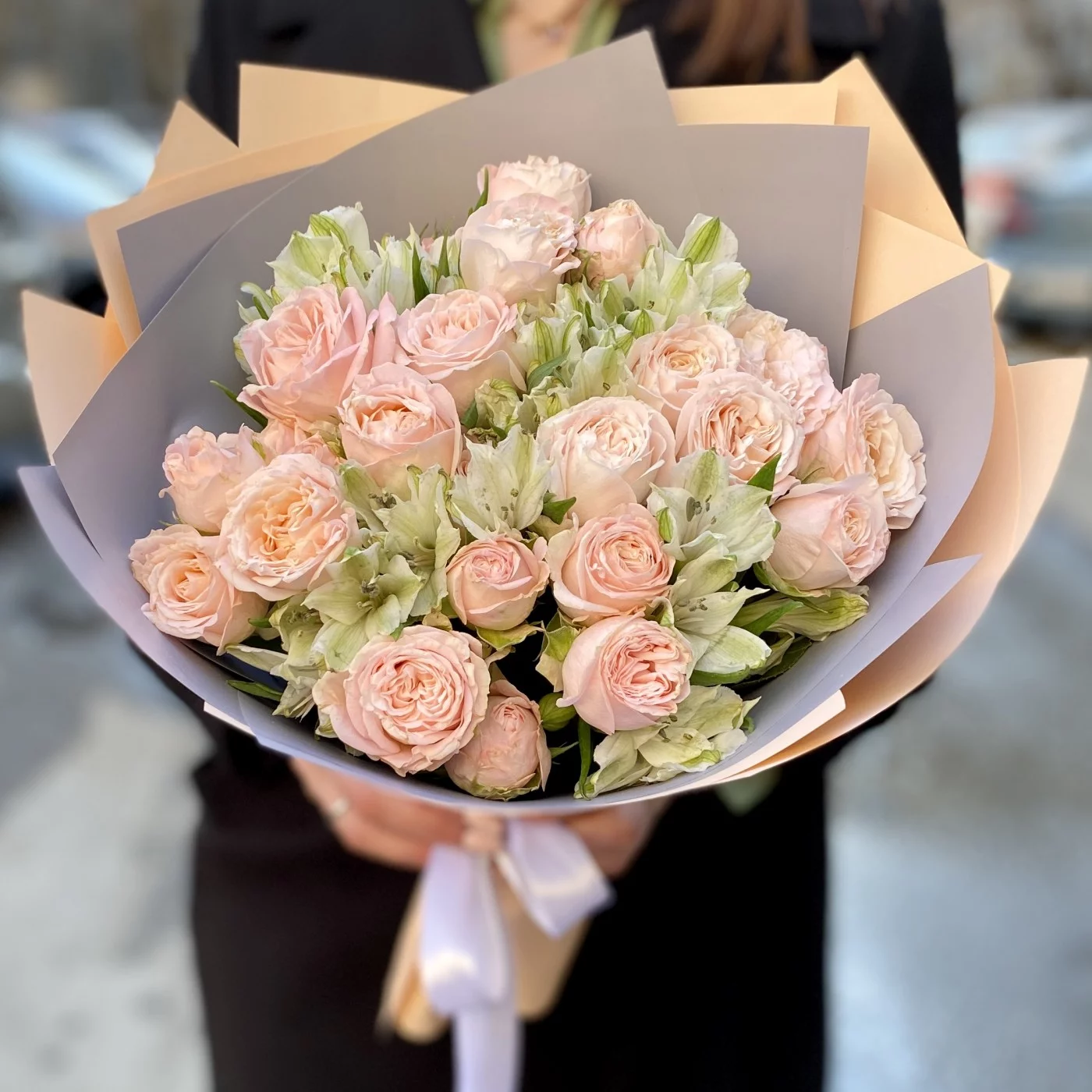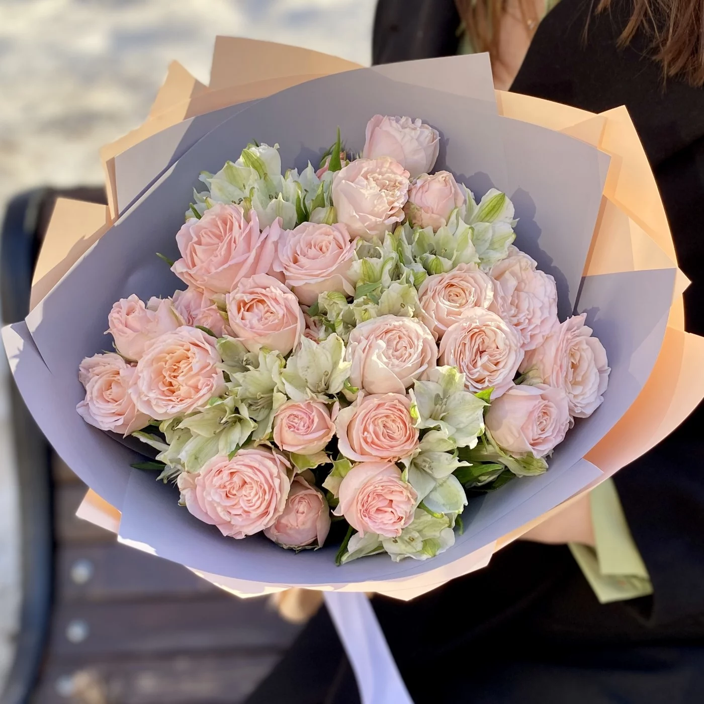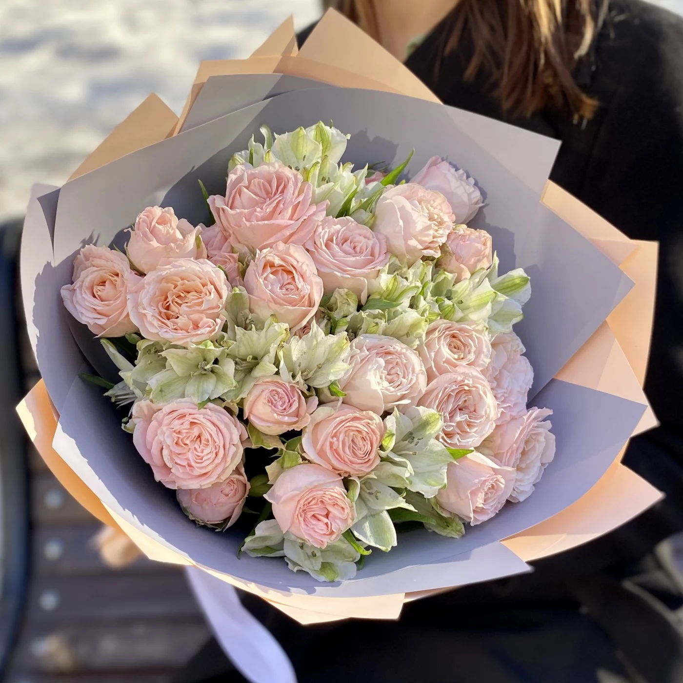 Нежный и романтичный букет кустовых пионовидных роз сорта Бомбастик и белых альстромерий. Прекрасный подарок на любое событие.
