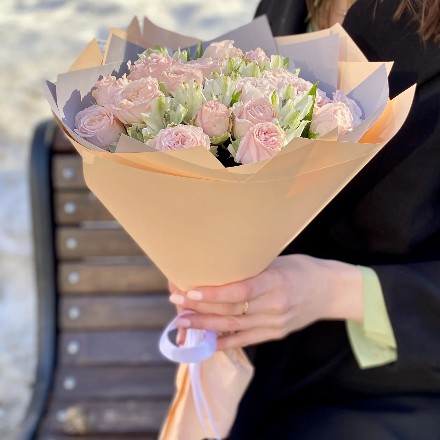 Букет пионовидных роз Бомбастик и альстромерий