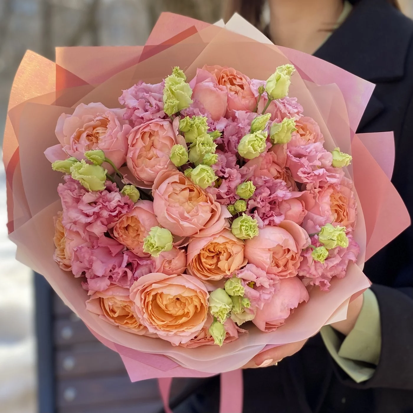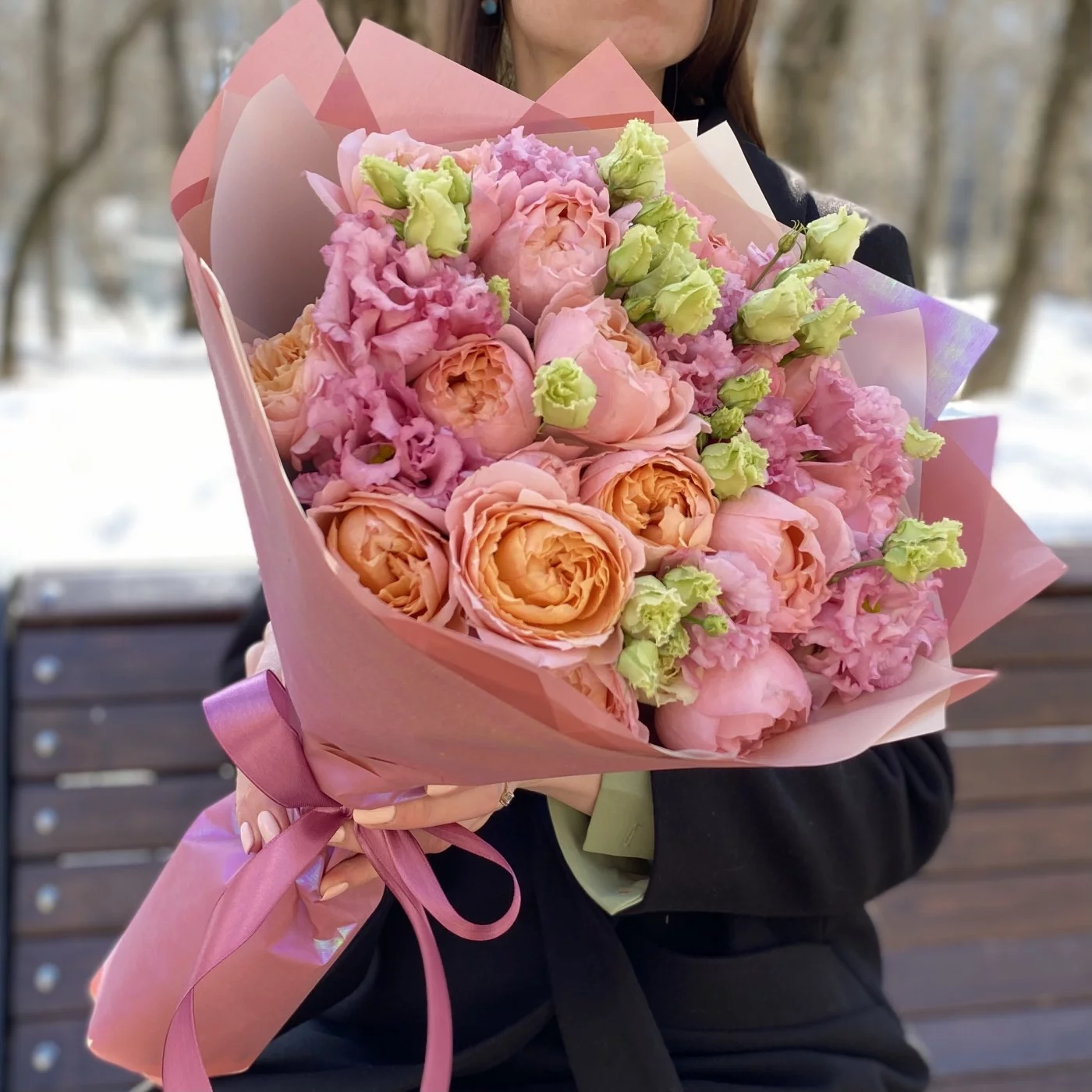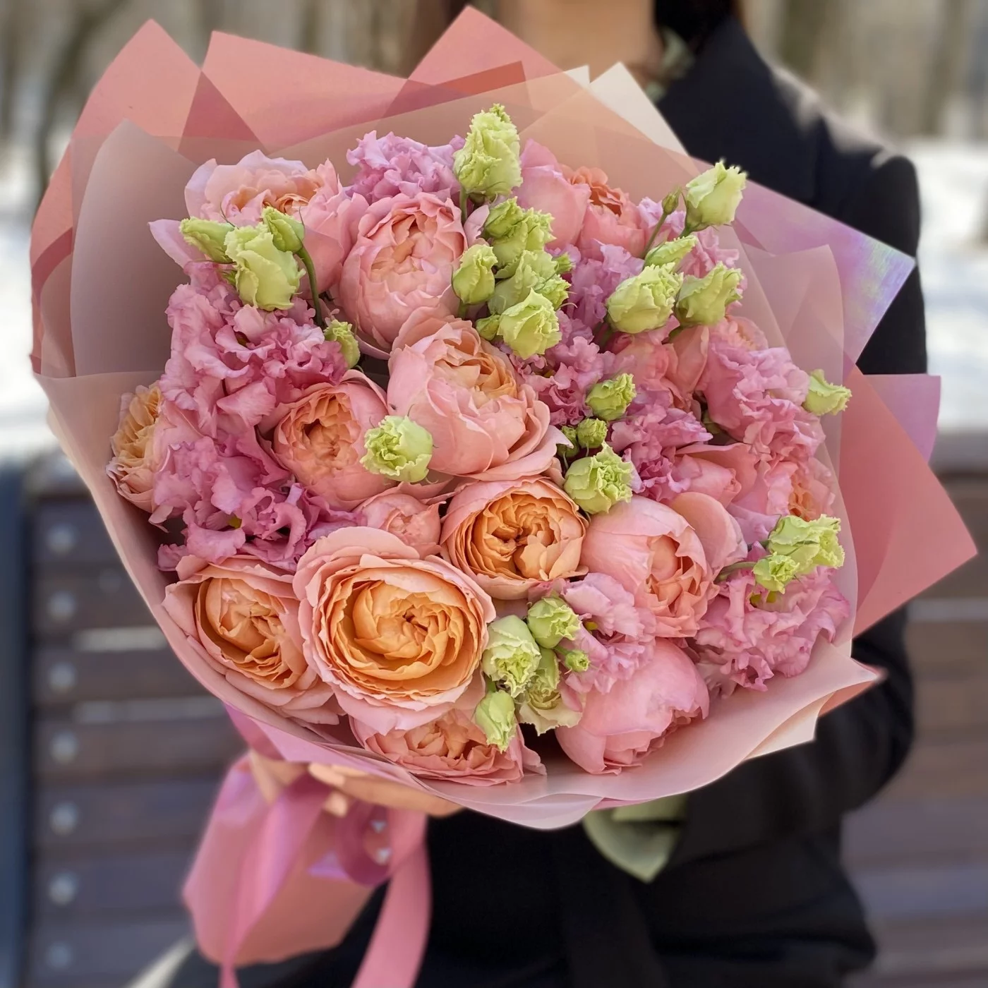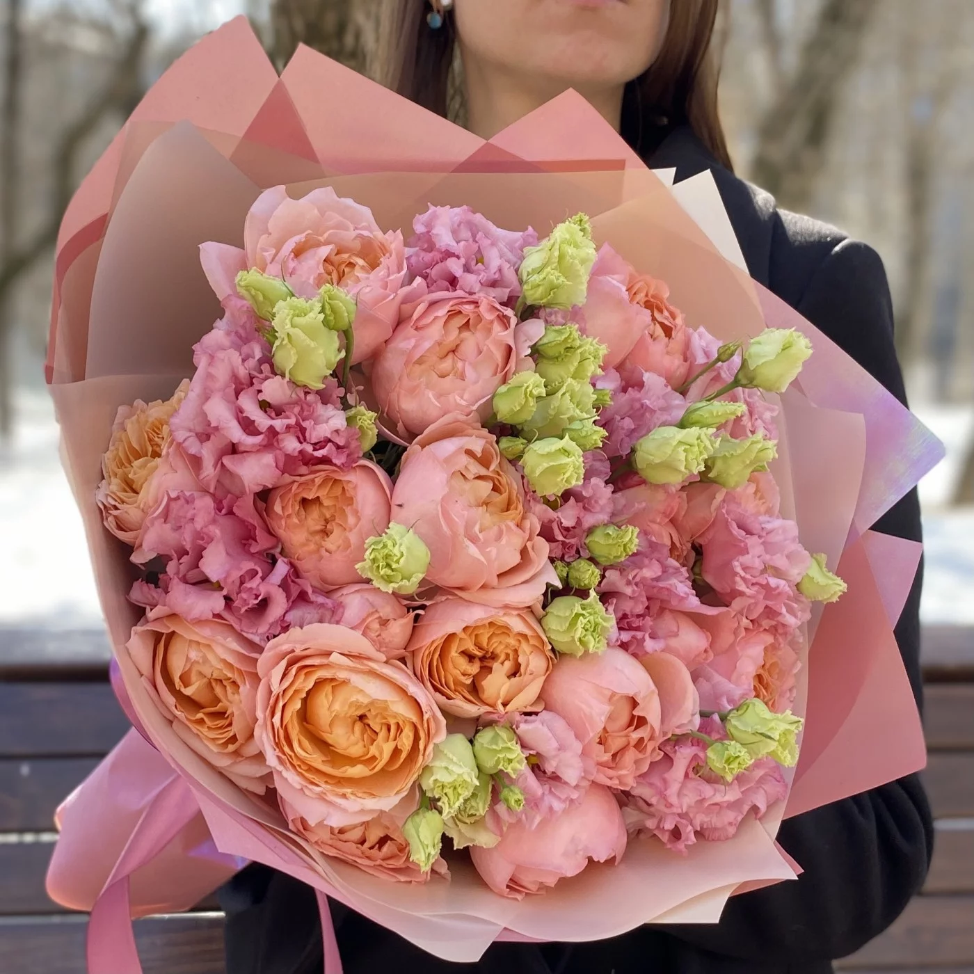 Букет пионовидных роз Джульетта и розовых Эустом. Стильный и красивый букет для любого мероприятия.