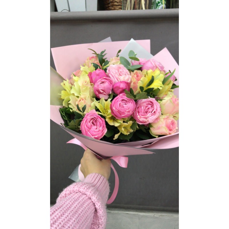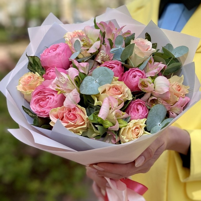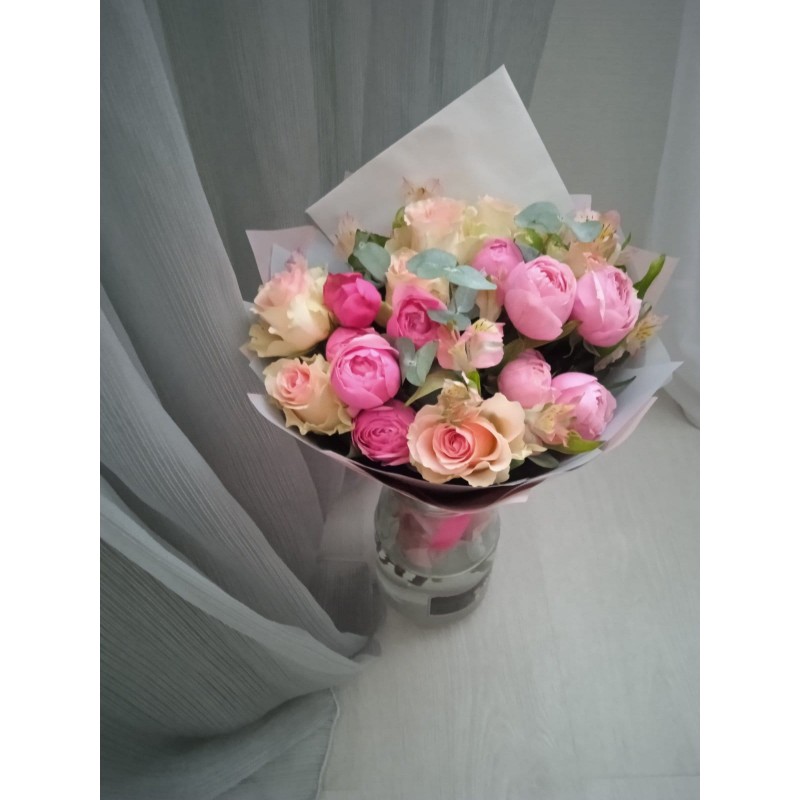 кустовая пионовидная роза – 2, роза Топ Гир – 7, альстромерия розовая – 3, эвкалипт – 1, писташ – 2, упаковка.