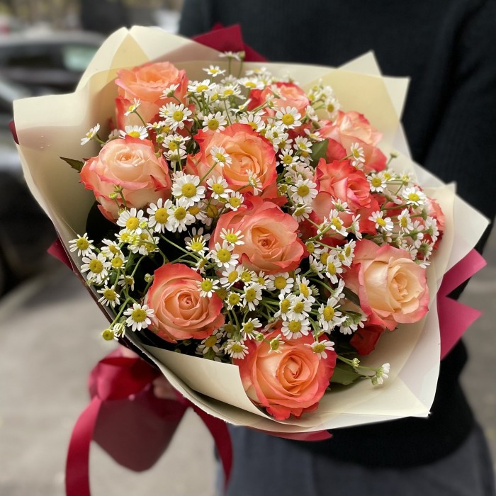 Букет роз сорта Кабаре с ароматными ромашками. Такой букет можно преподнести не только взрослому но и ребенку. Радостный букет для хорошего настроения.