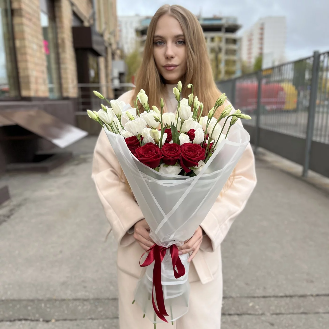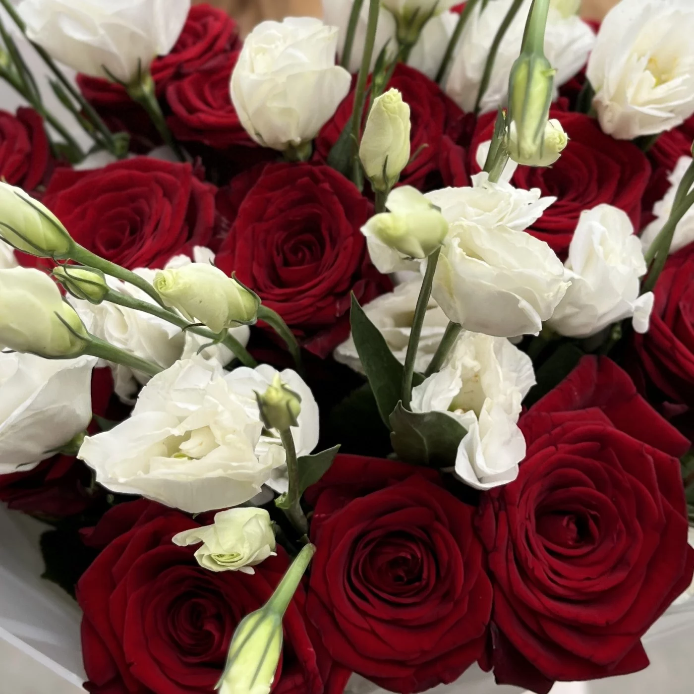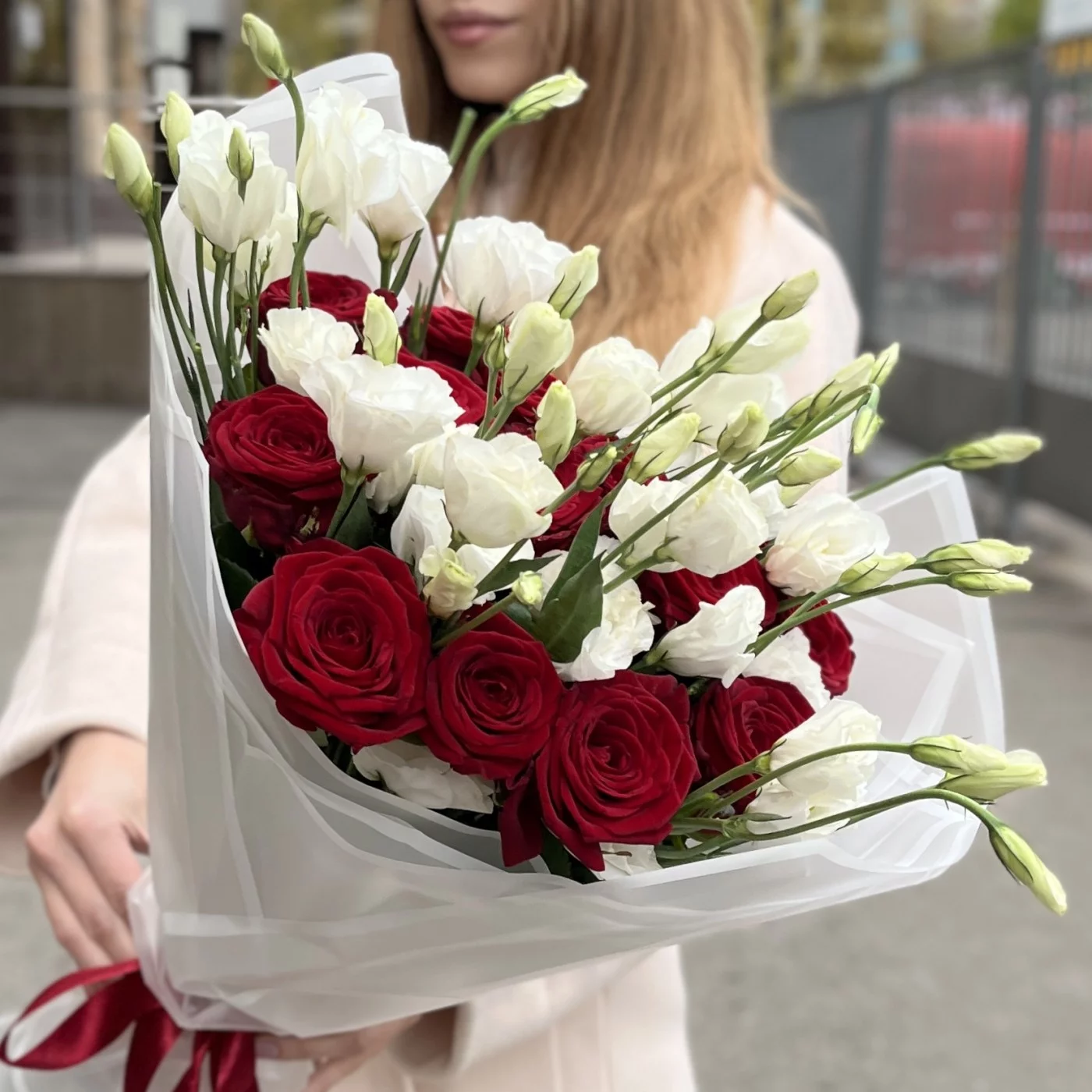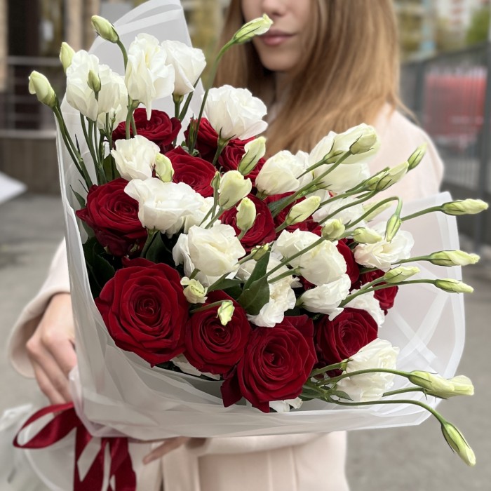 Букет роз и эустом Рубиновая свадьбаа состоит из яркой розы и эустомы, которые характеризуются, нежными бутонами и мягкими, бархатистыми лепестками.