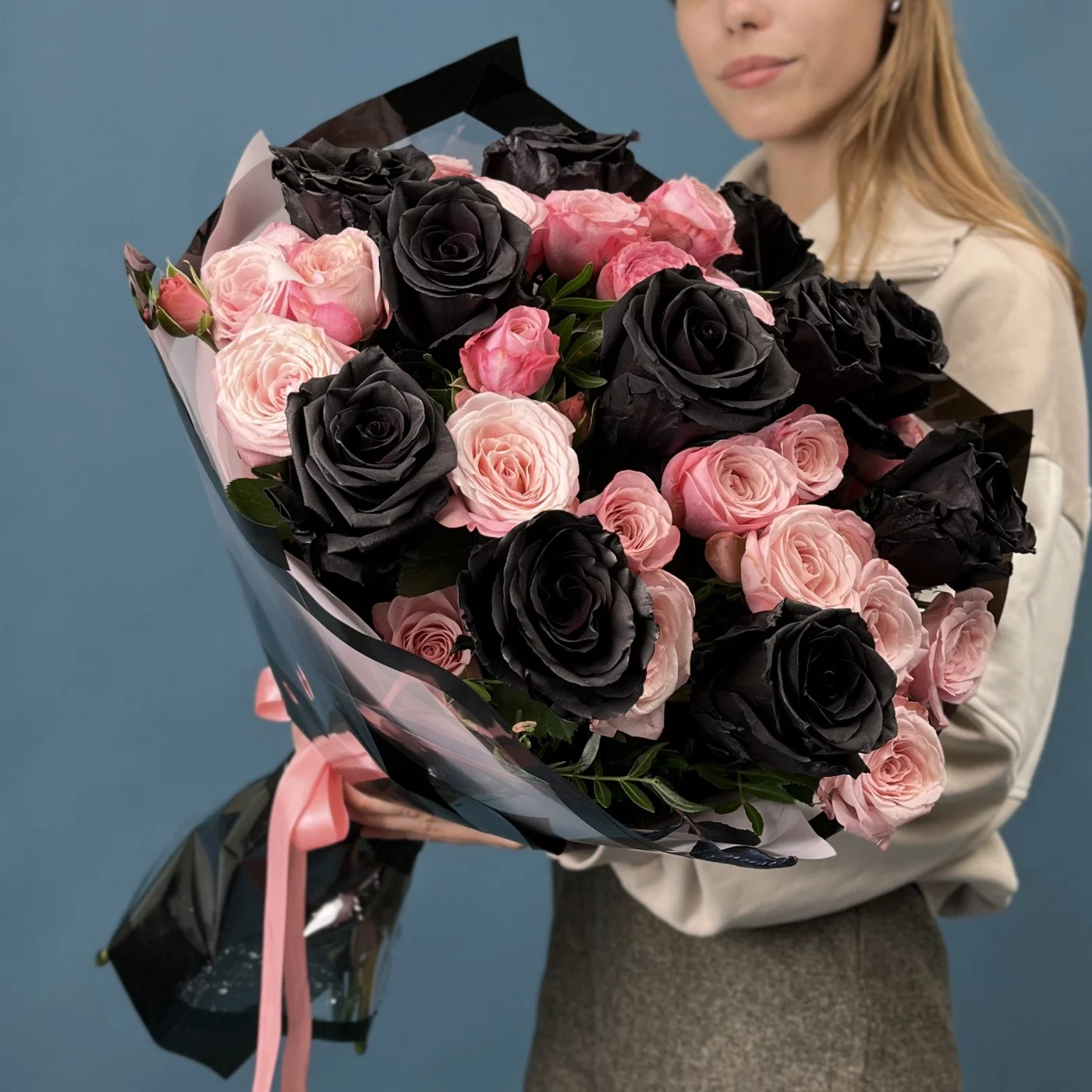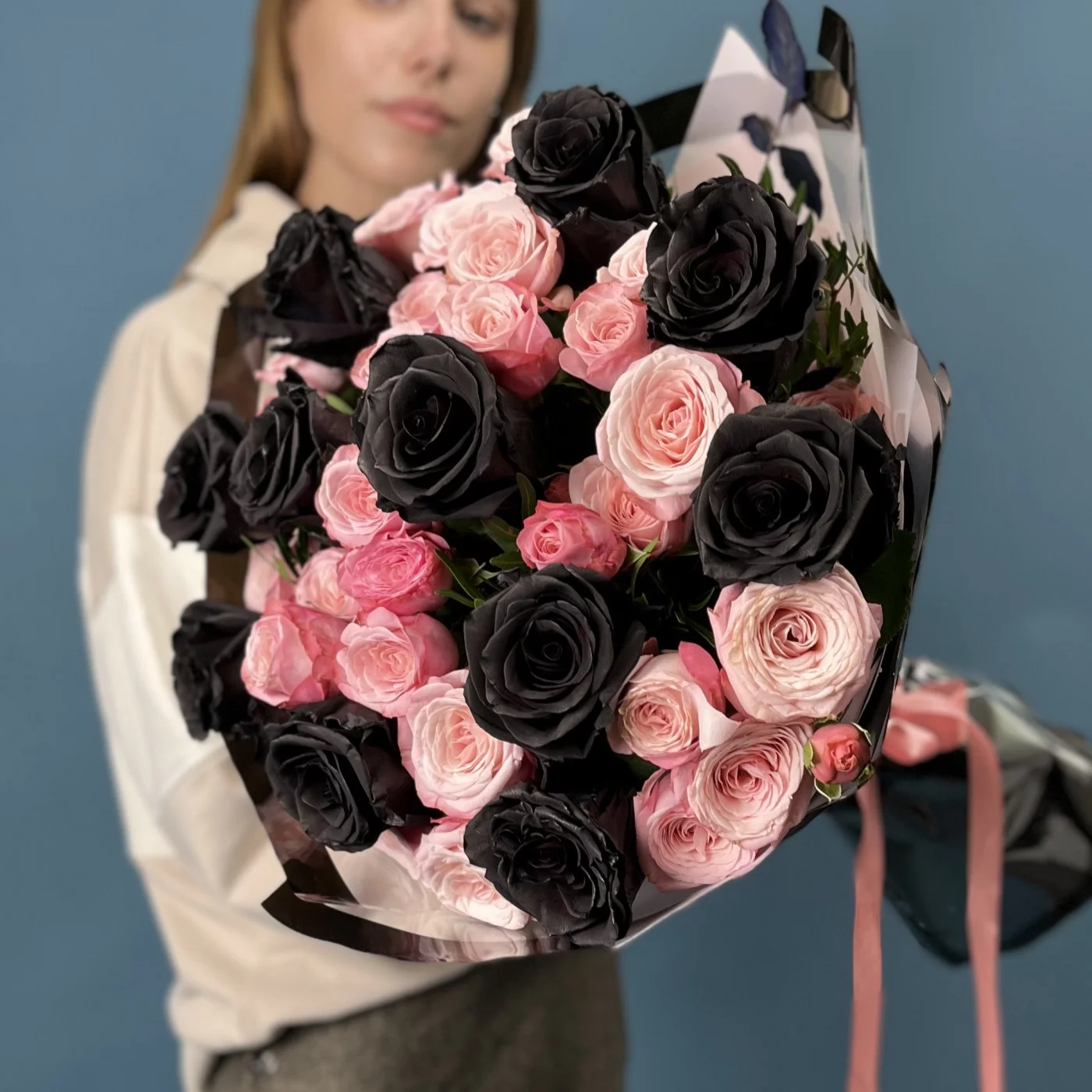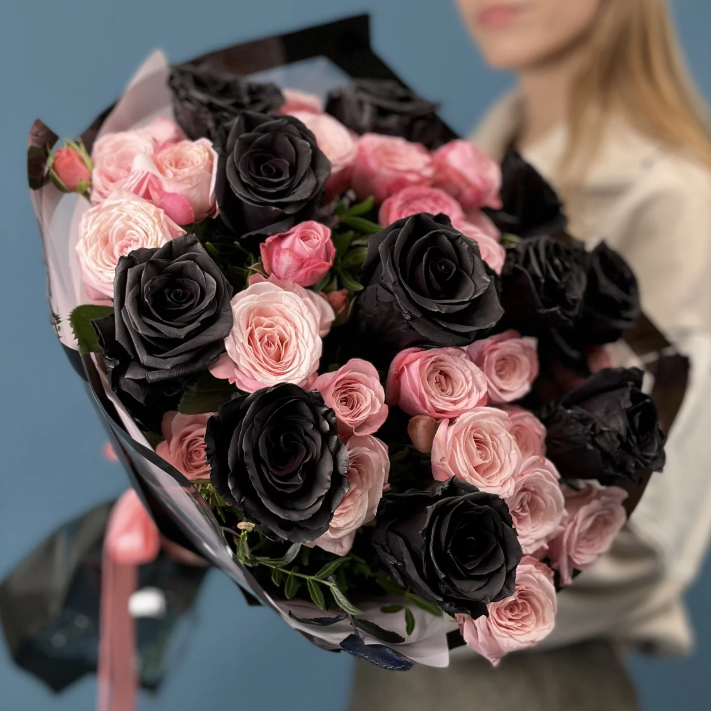 Насыщенные коралловые розы создают теплую атмосферу, а черные розы добавляют нотки загадочности и элегантности.