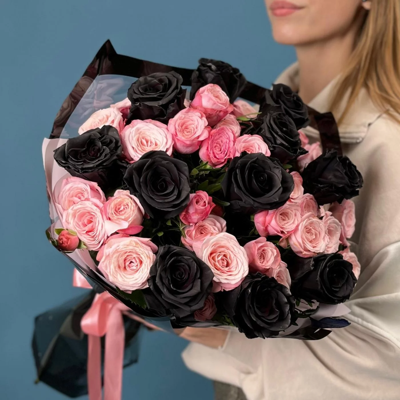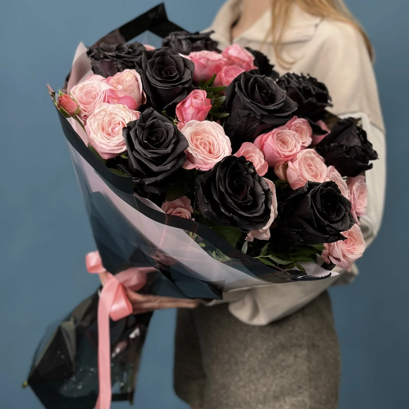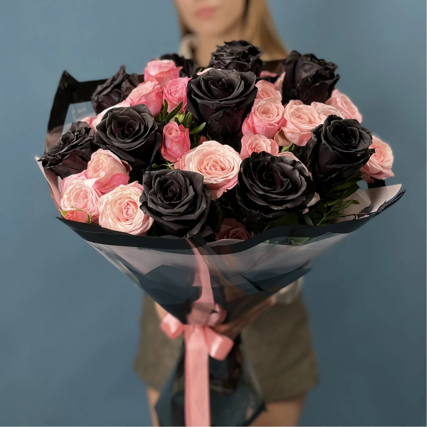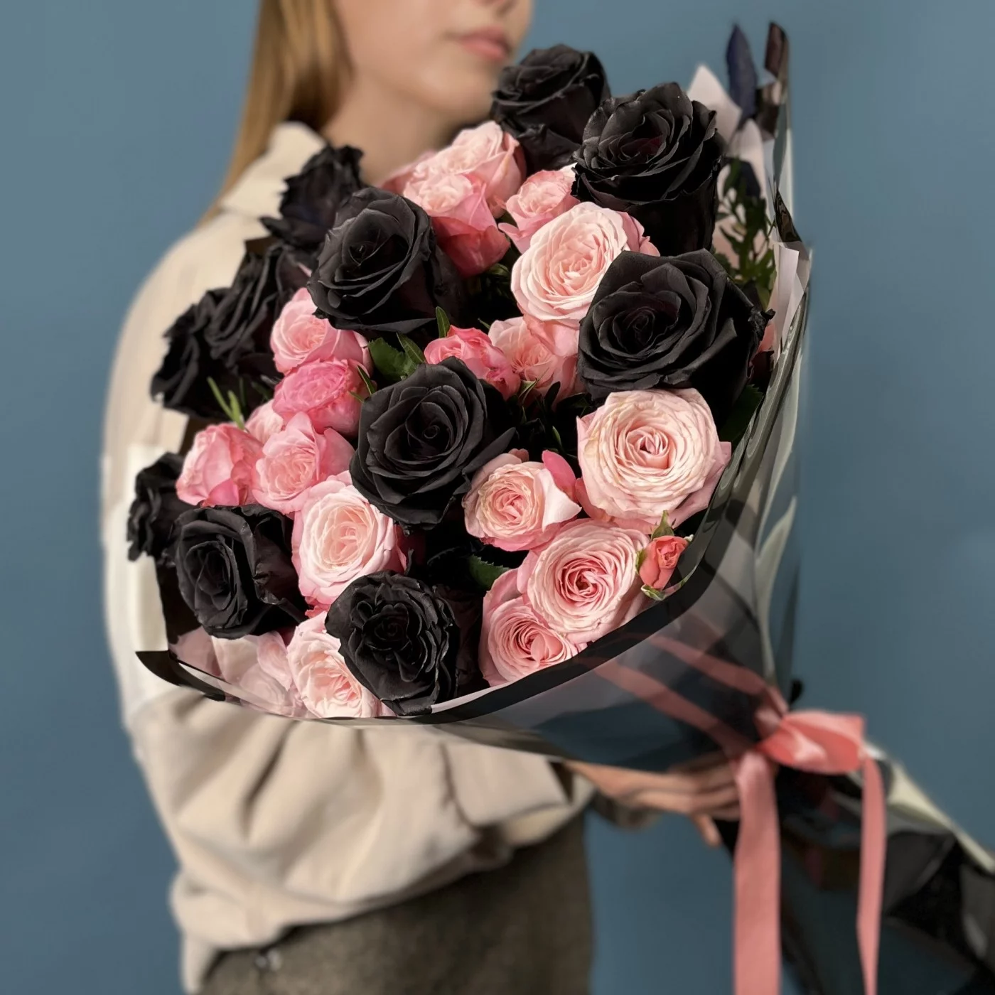 Насыщенные коралловые розы создают теплую атмосферу, а черные розы добавляют нотки загадочности и элегантности.