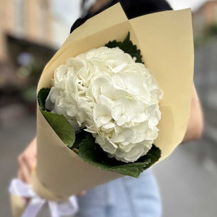 Легкий и свежий букет с гортензией — это настоящее воплощение утонченной простоты и элегантности. Одна крупная белая гортензия с множеством мелких цветков создает впечатление воздушного облака, наполненного легкостью и изяществом. Белоснежный оттенок гортензии символизирует чистоту и спокойствие, принося с собой ощущение свежести и весеннего обновления.