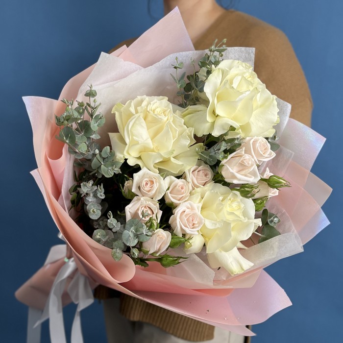 Букет с белыми французскими розами — это бесконечно красивый и универсальный вариант, который будет уместен в любой ситуации.