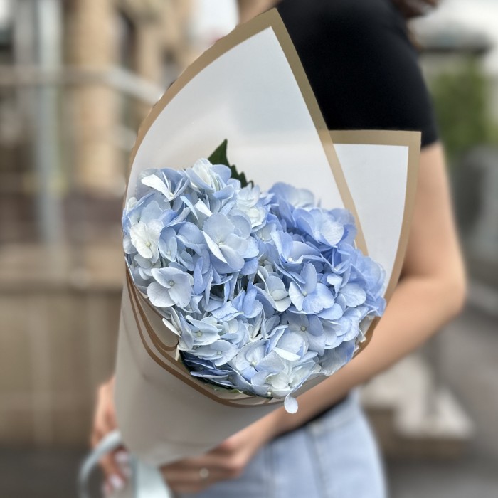 Легкий и свежий букет с гортензией — это настоящее воплощение утонченной простоты и элегантности. Одна крупная голубая гортензия с множеством мелких цветков создает впечатление воздушного облака, наполненного легкостью и изяществом. Нежный голубой оттенок гортензии символизирует чистоту и спокойствие, принося с собой ощущение свежести и весеннего обновления.