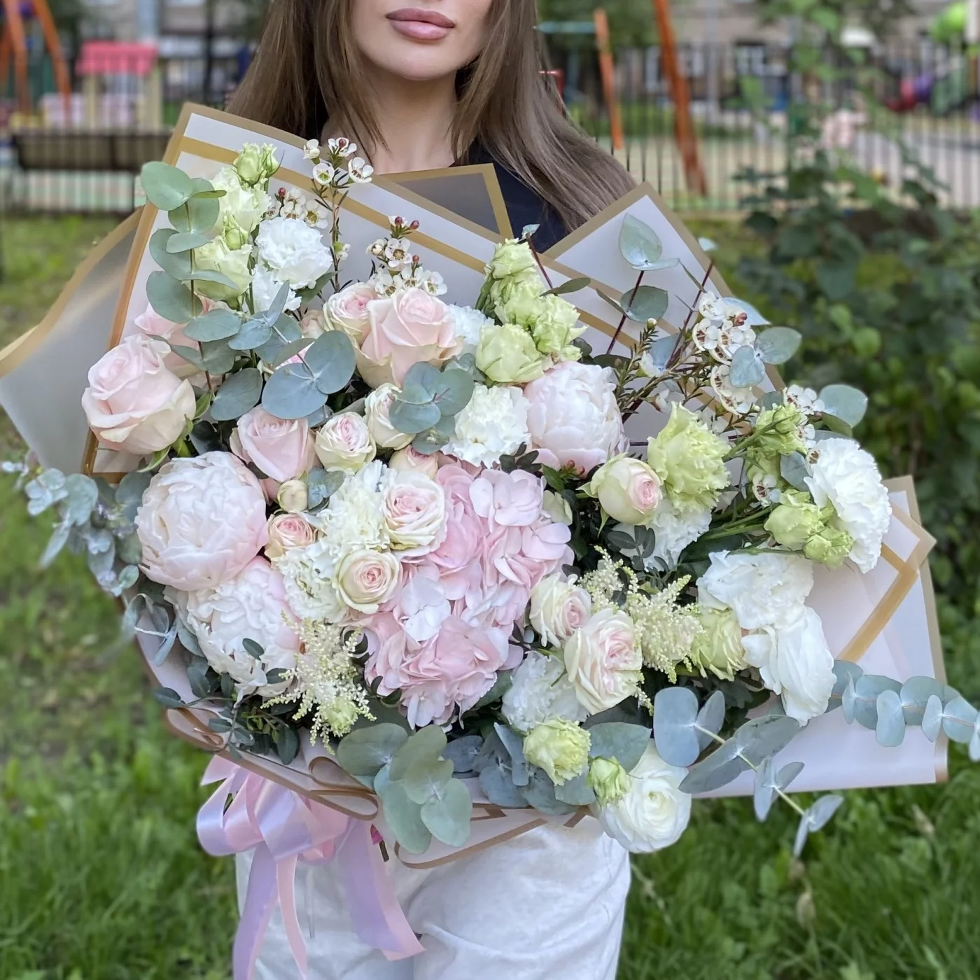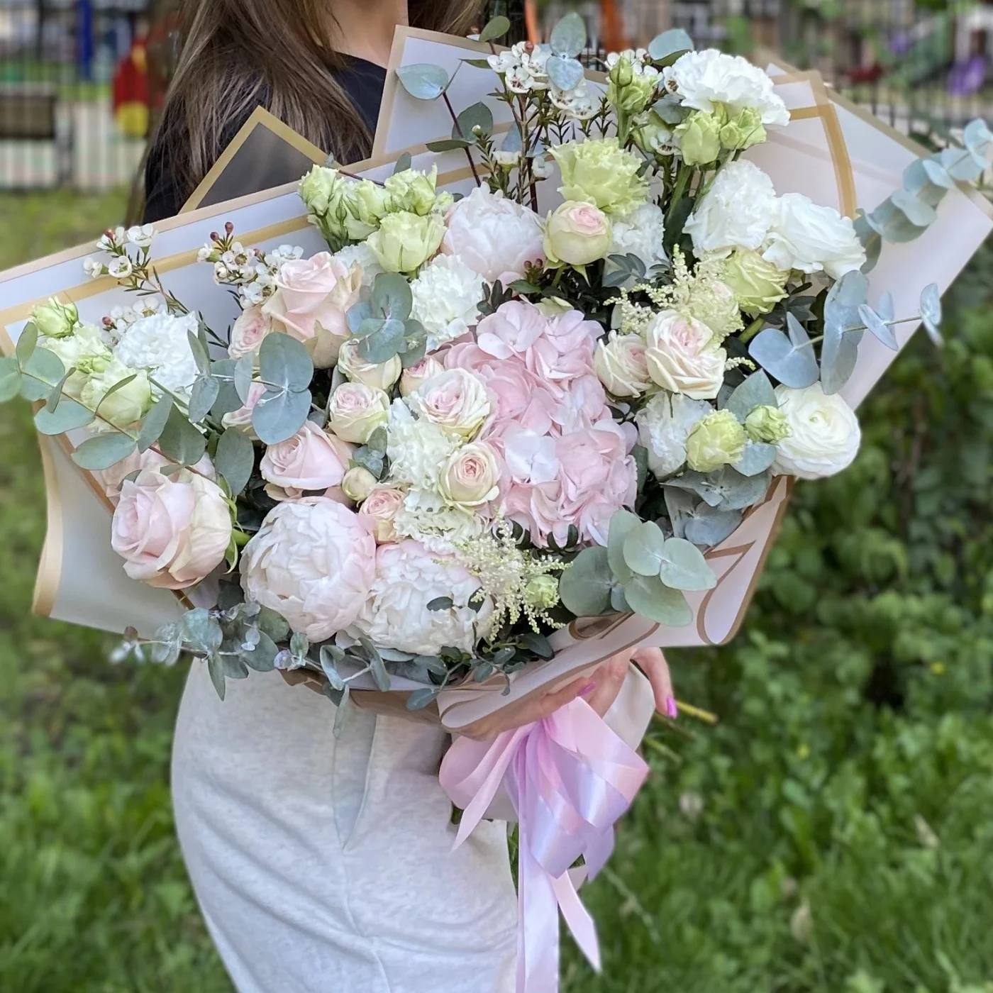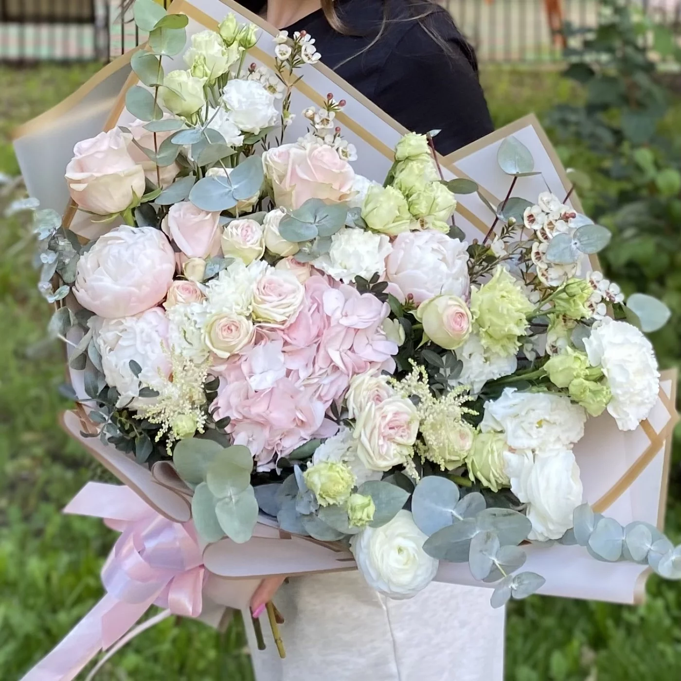 Нежный букет с пышной розовой гортензией и пионами. Такой букет можно подарить на любое торжество.