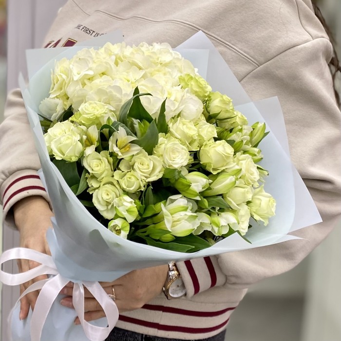 Букет из белой гортензии с кустовыми розами и альстромерией, создает романтическое и нежное настроение.