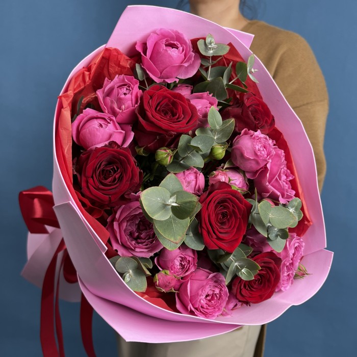 Букет с красными розами и Мисти Баблс — это идеальное сочетание страсти и нежности, которое подарит радость и станет настоящим украшением любого праздника.
