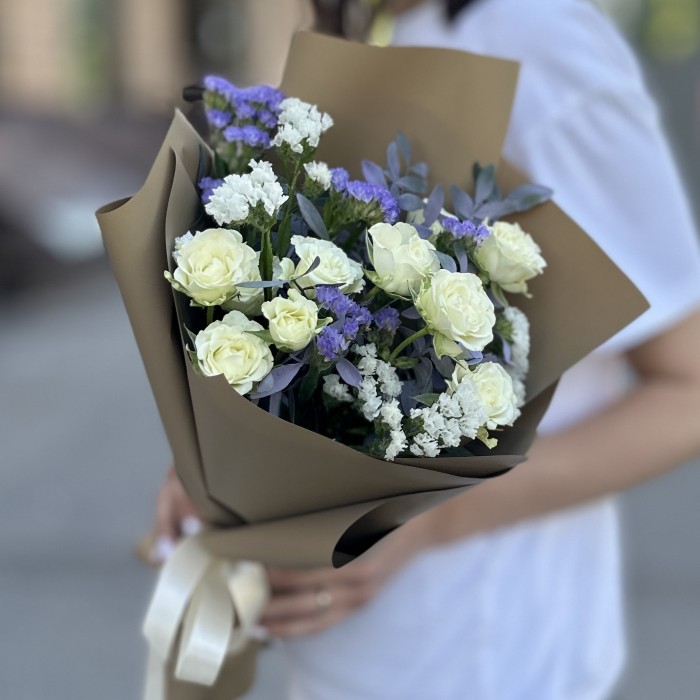Белая статица дополняет композицию своей воздушной и легкой структурой, создавая ощущение свежести и легкости. Сиреневая статица добавляет яркий акцент, который придает букету живости и глубины. Веточки писташа вносят зелёные нотки, создавая контраст и подчёркивая красоту основных цветов. Упаковка подчеркивает элегантность композиции и делает её идеальной для подарка.