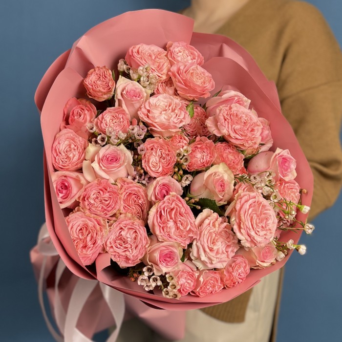 Букет с кустовыми пионовидными розами Мадам Бомбастик