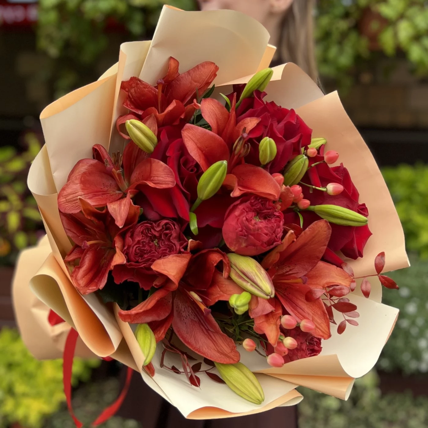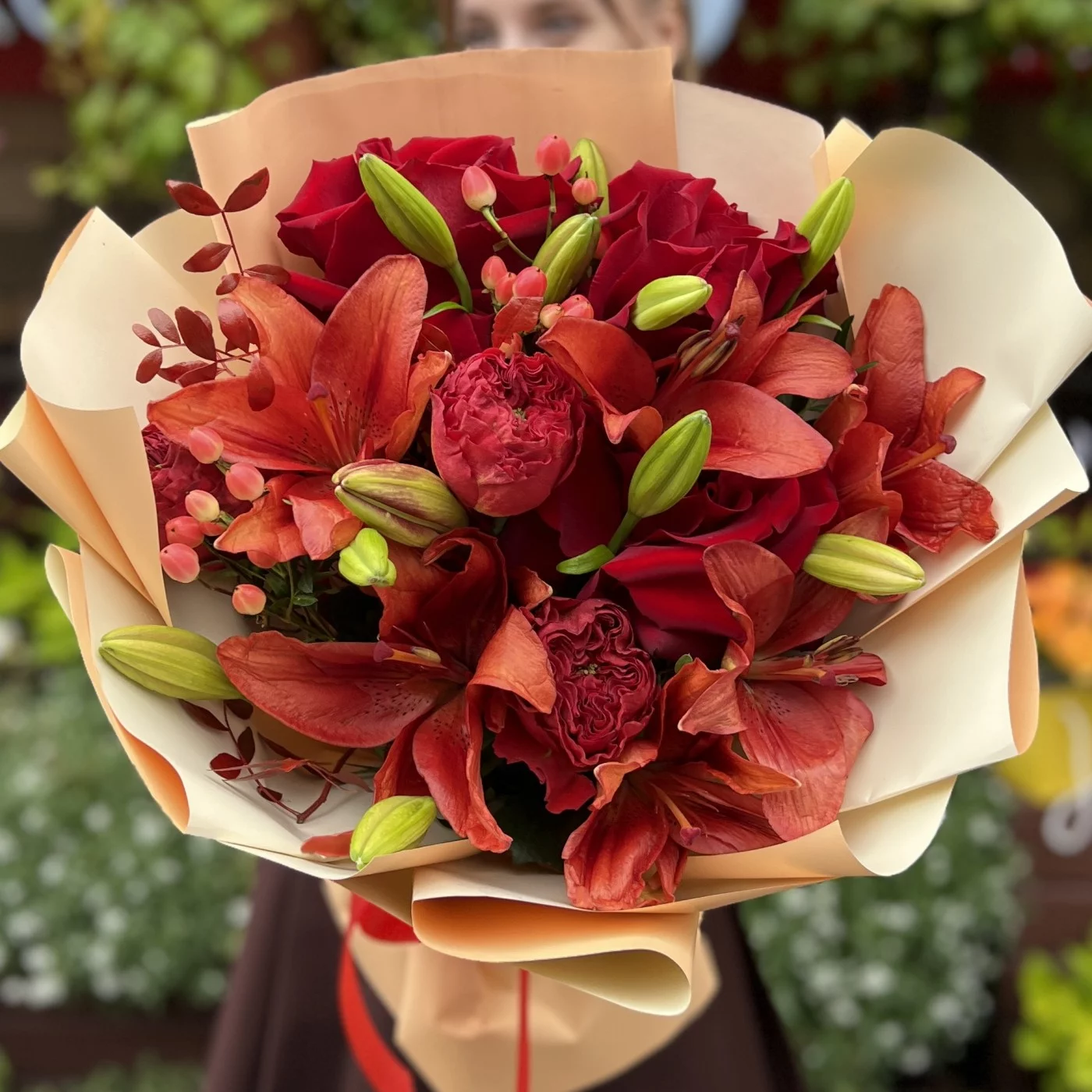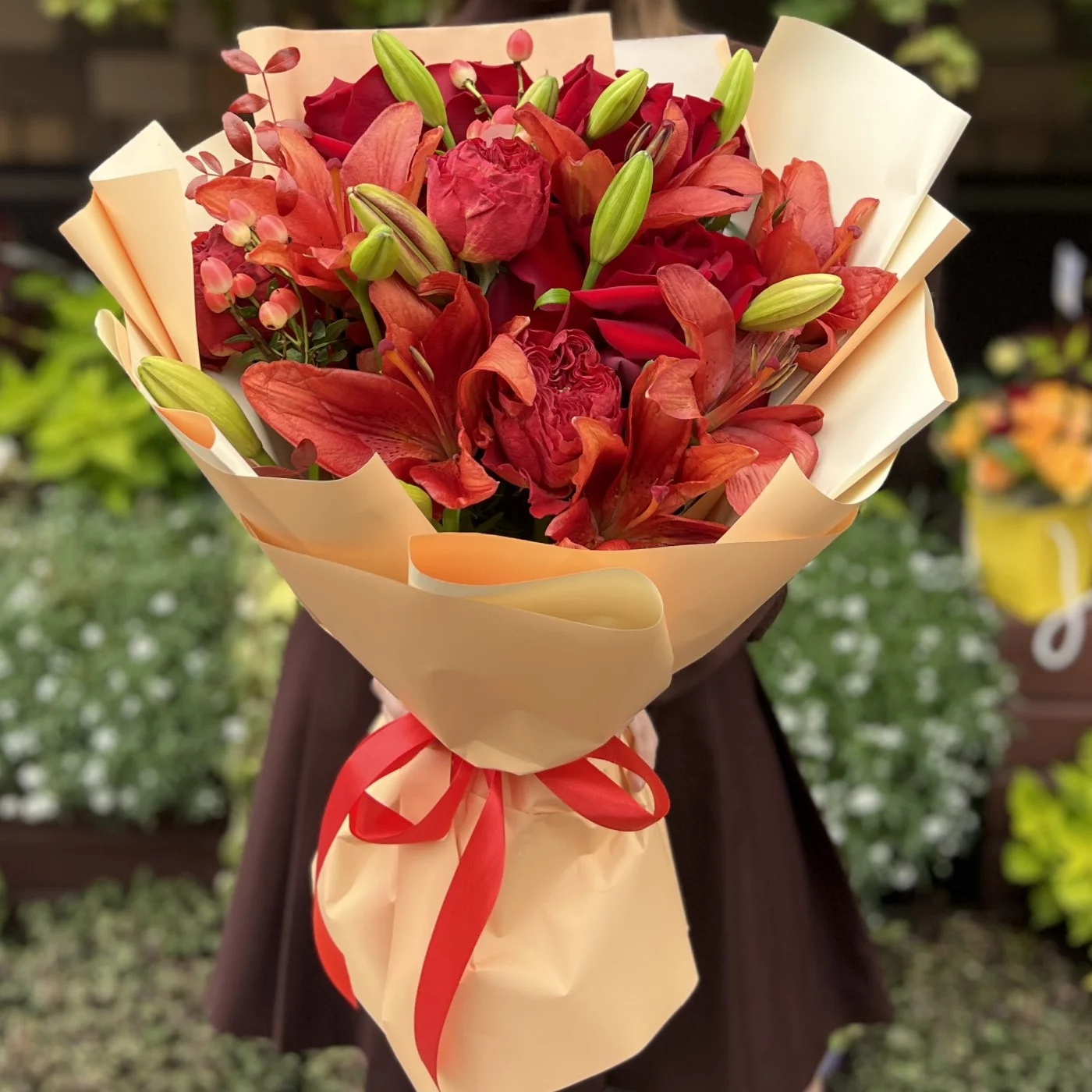 Букет с лилиями и красными розами, объединяет в себе яркие красные розы и утончённые лилии, символизируя гармонию между страстью и изяществом. Этот букет идеально подходит для особых случаев, когда нужно выразить глубокие чувства и восхищение.
