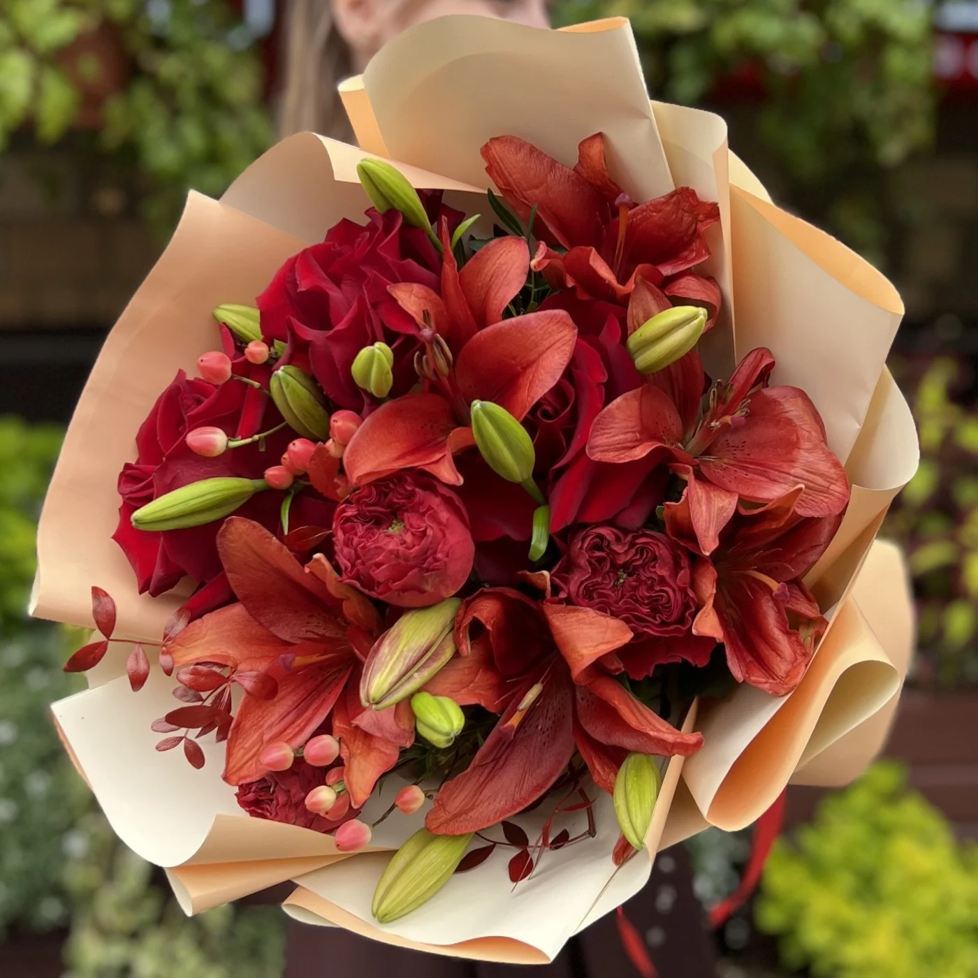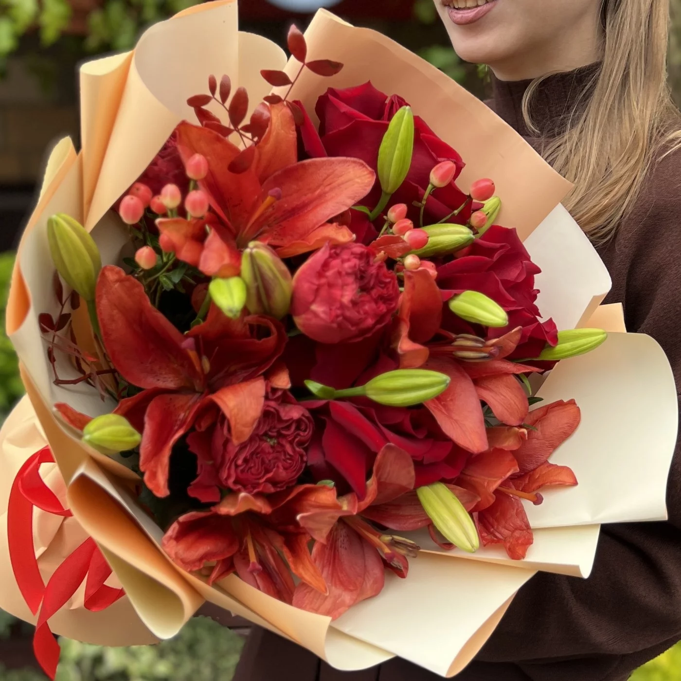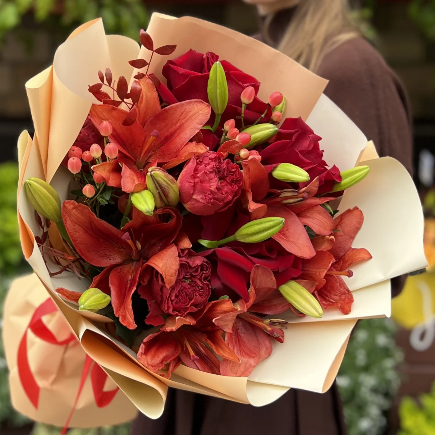 Букет с лилиями и красными розами, объединяет в себе яркие красные розы и утончённые лилии, символизируя гармонию между страстью и изяществом. Этот букет идеально подходит для особых случаев, когда нужно выразить глубокие чувства и восхищение.