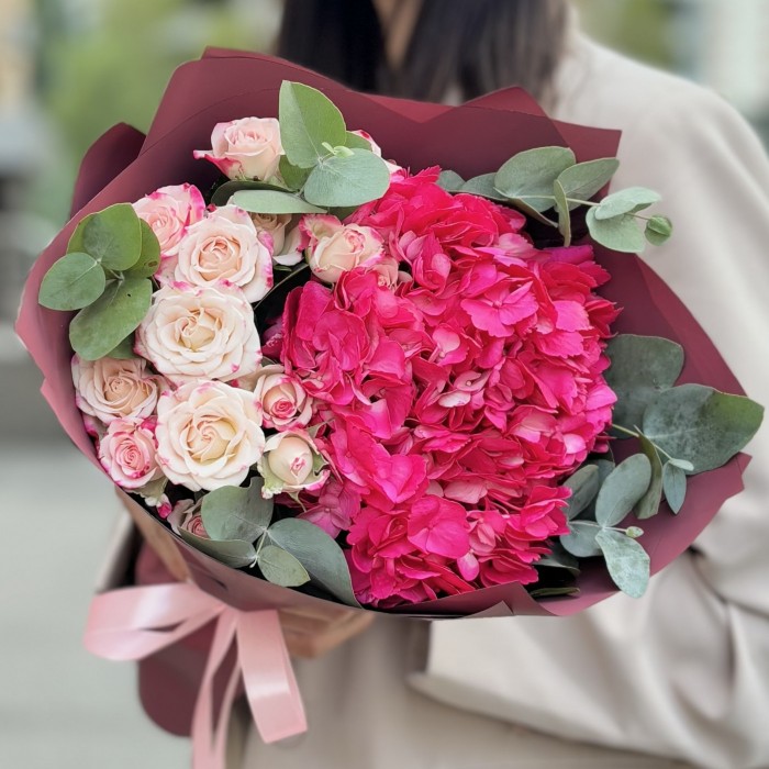 Букет с малиновой гортензией и кустовой розой Рефлекс — это яркая и стильная композиция, которая излучает элегантность и энергетику. Это сочетание цветов придаёт букету насыщенность и выразительность, что делает его отличным выбором для различных торжеств и особых мгновений.