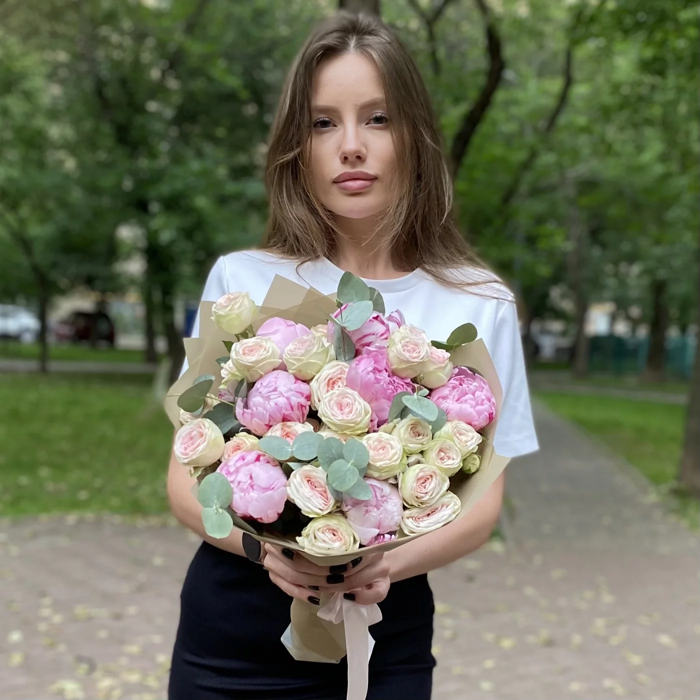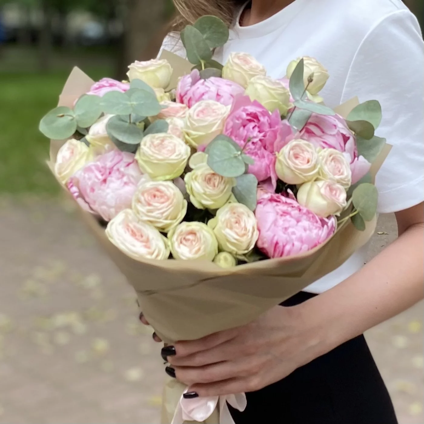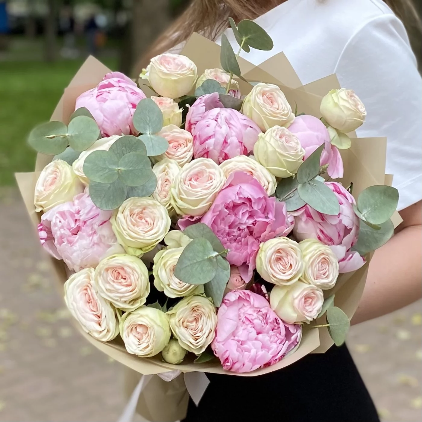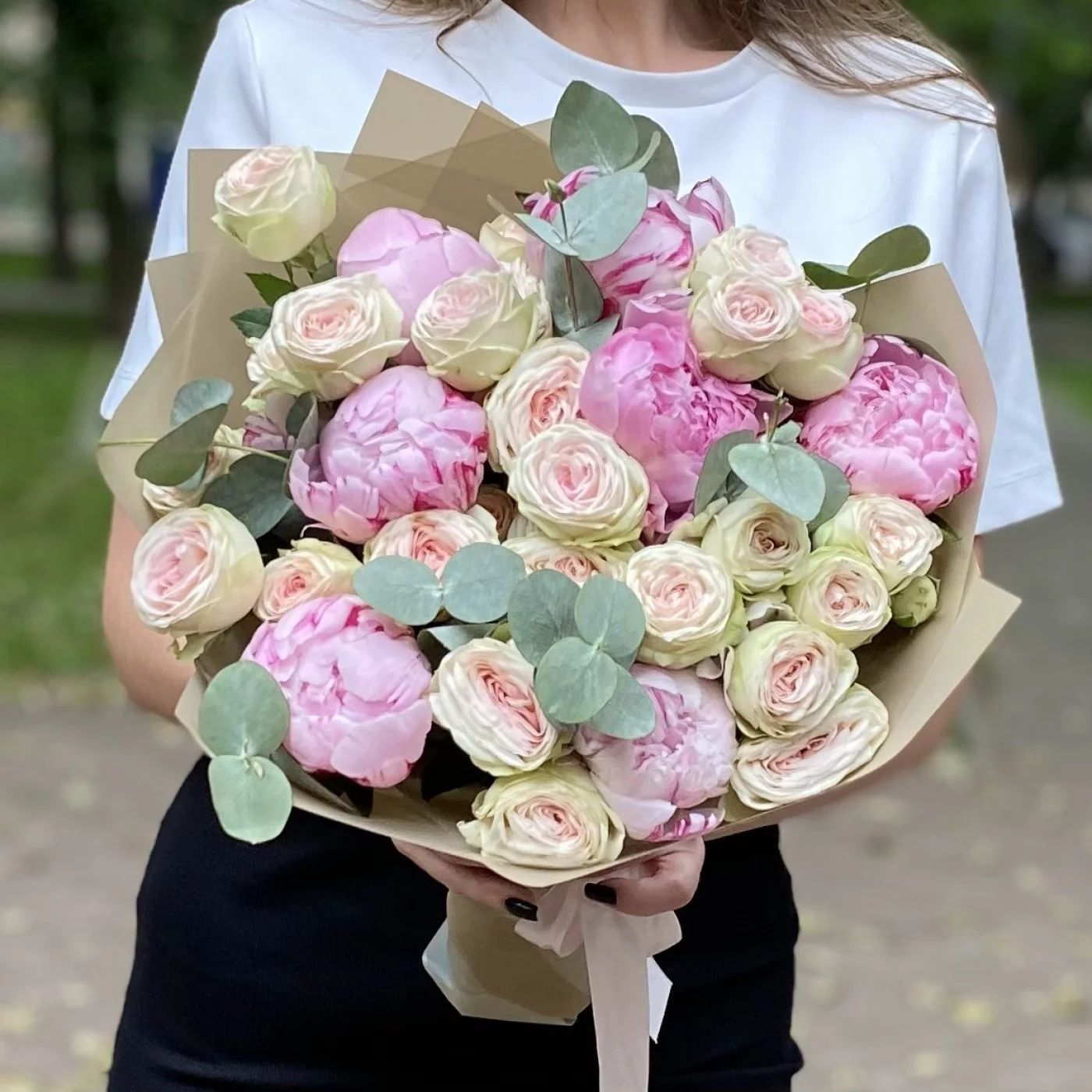 Сборный букет из нежно-розового пиона сорта Сара Бернар с кустовой пионовидной розой Свит Джелатто станет идеальным подарком для любимой женщины.