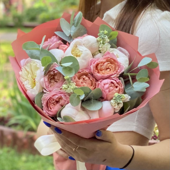 Сборный букет из ароматных пионов сорта Ангел Чикс, маттиолы и пионовидных кустовых роз Джульетта станет идеальным подарком для любимой женщины.