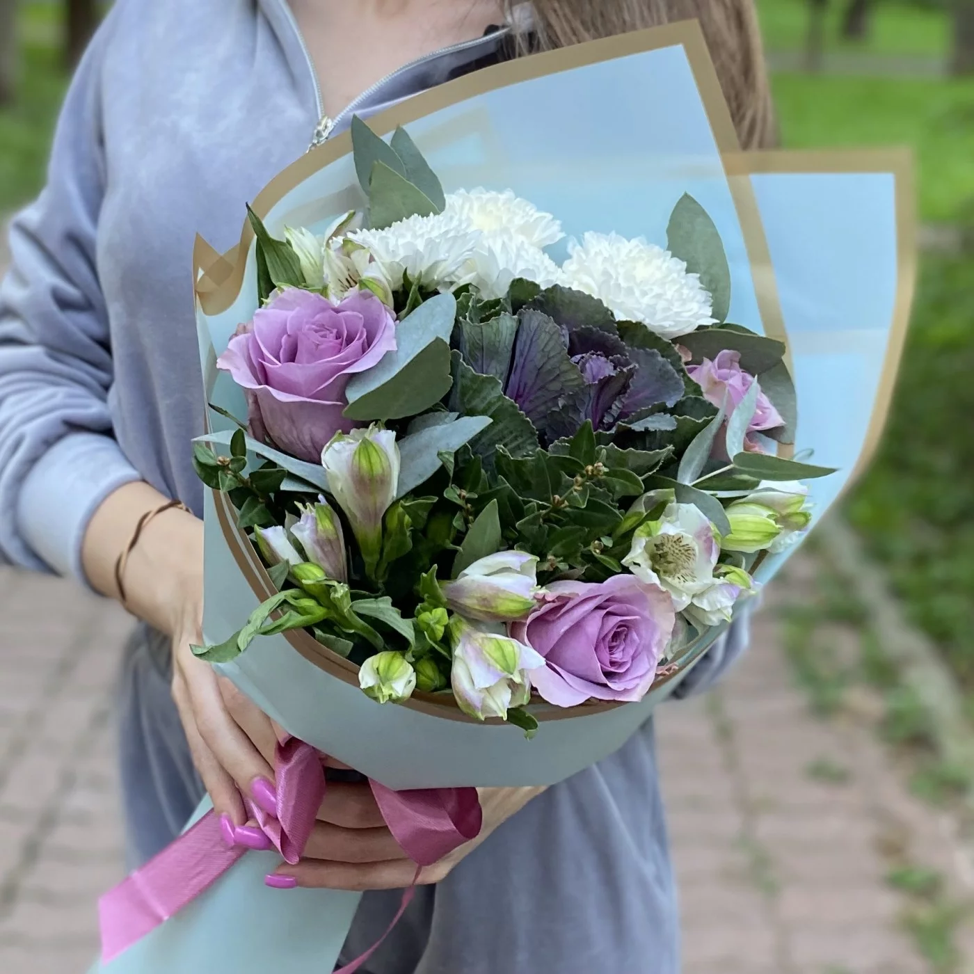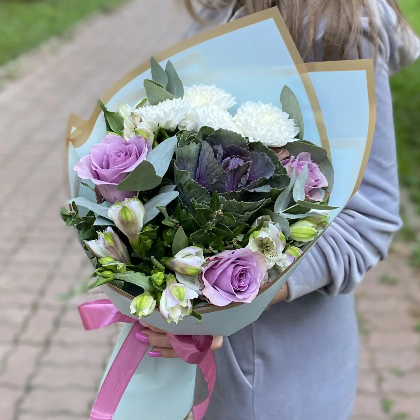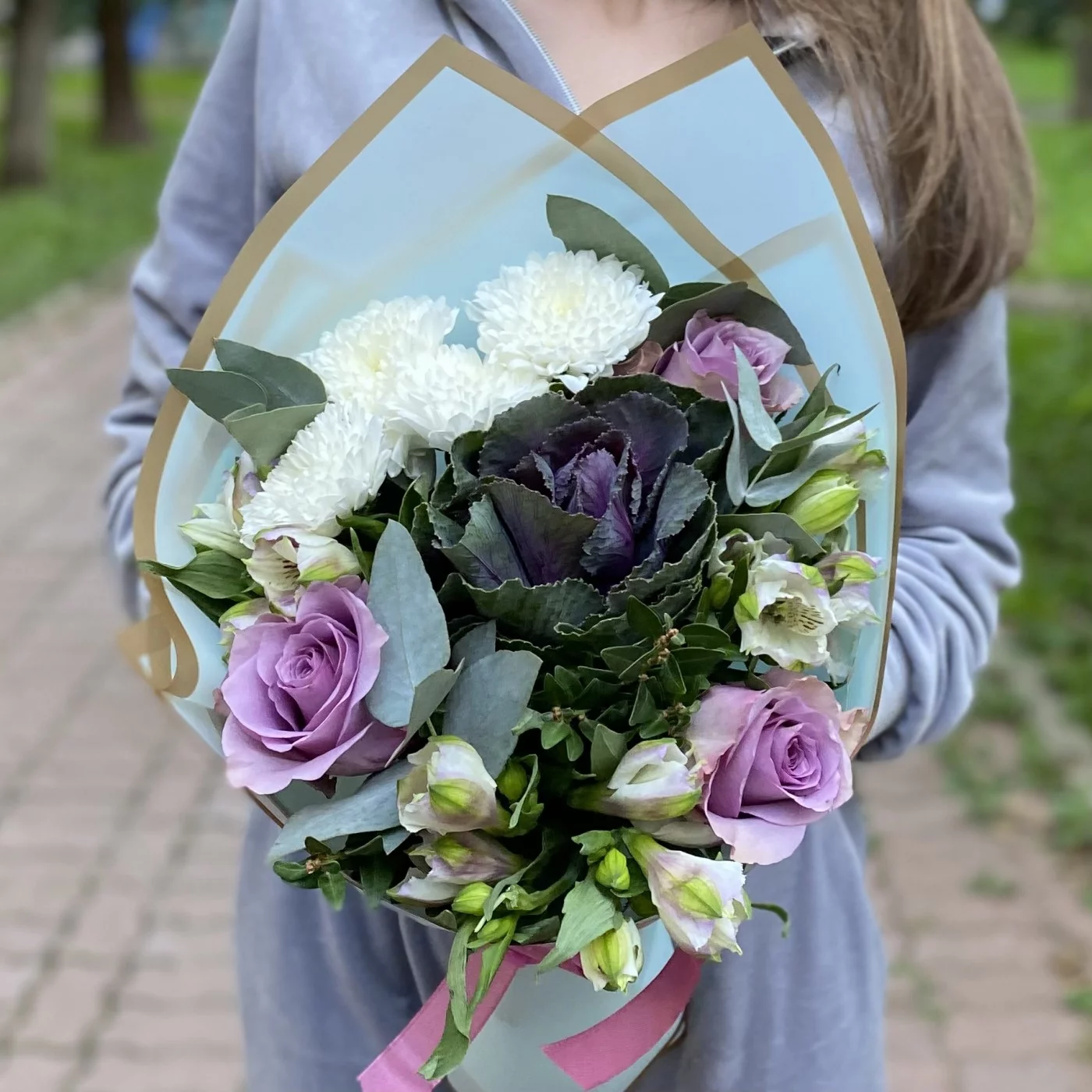 Нежный букет в бело-сиреневой цветовой гамме с необычным составом. Сиреневая роза в сочетании с брассикой и альстромерией - подойдет как подарок учителю, маме или подруге.