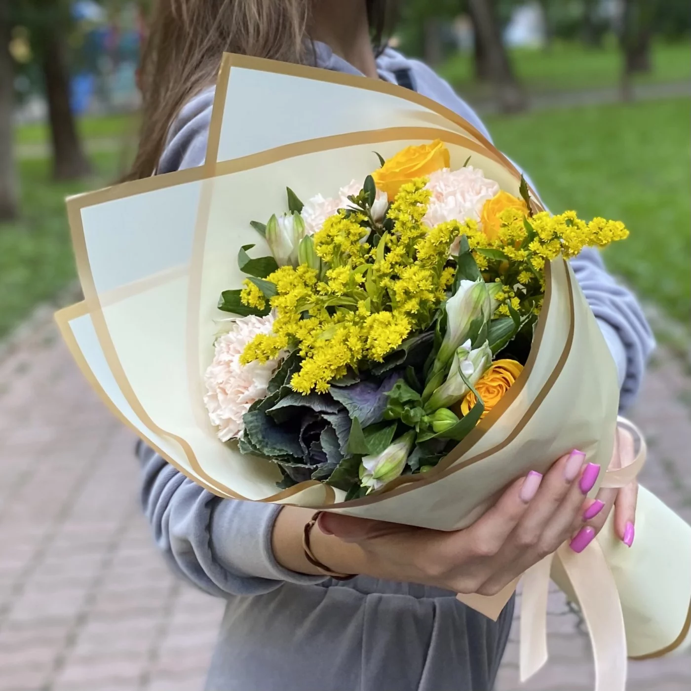 Яркий букет из желтых роз, солидаги и персиковой гвоздики - подойдет как подарок учителю, маме или подруге.