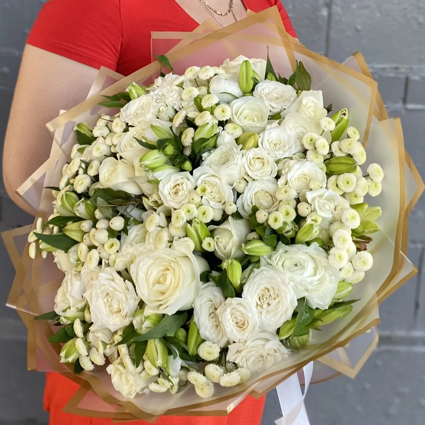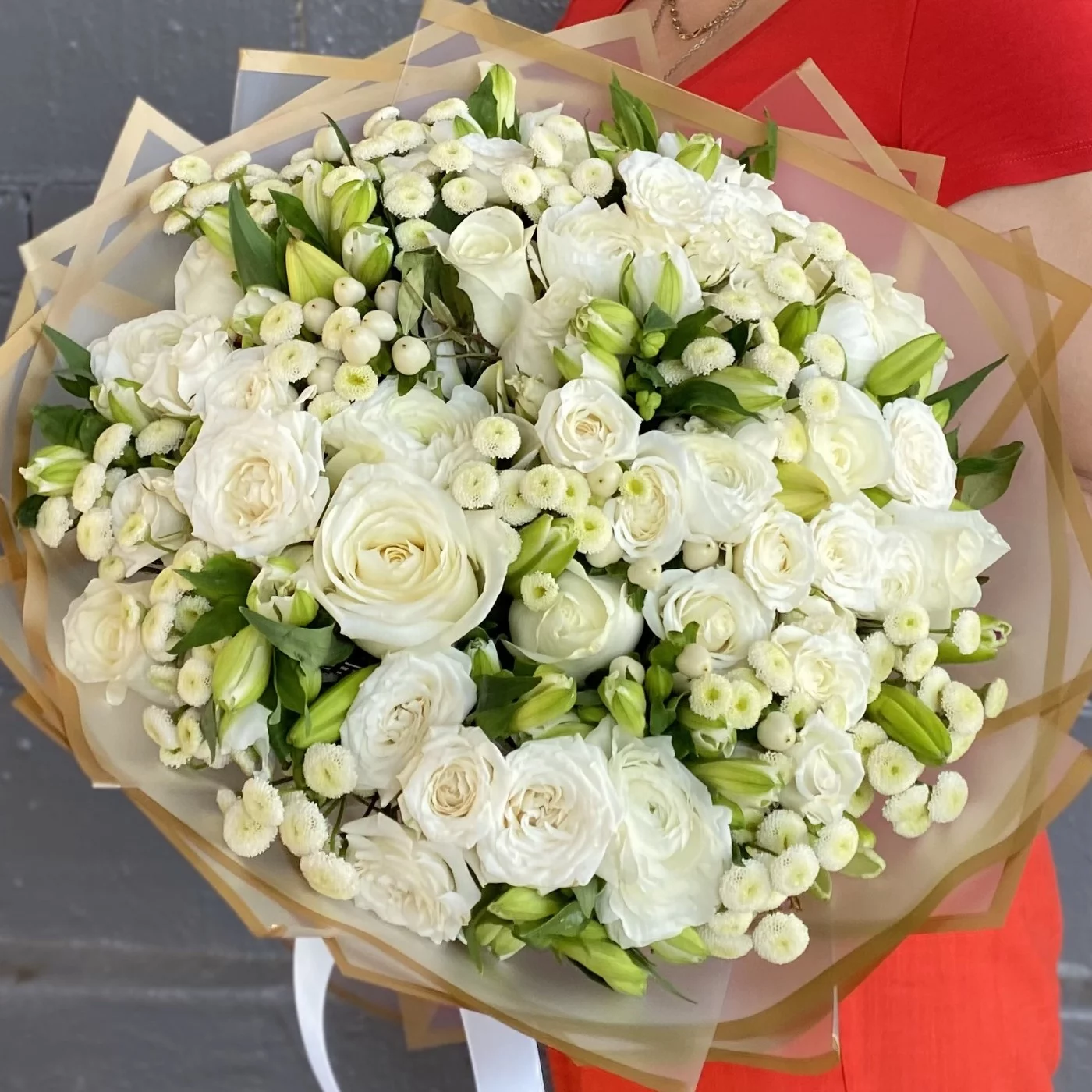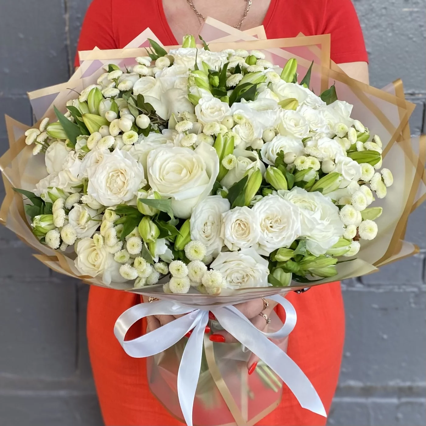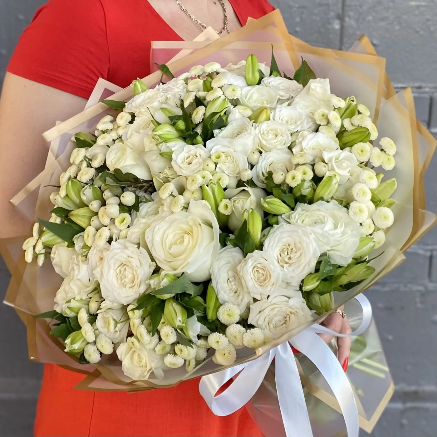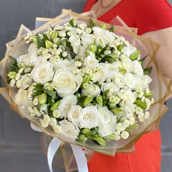 Вихрь изыска и элегантности, олицетворение природной естественности и лёгкости, танец истинной красоты и искренних чувств… Азиатская лилия, ранункулюс, кустовая роза Сноуфлейк, танацетум Па рио, альстромерия, гиперикум, зелень фисташки — всё это составляет столь завораживающую цветочную композицию, которая специально создана для особых жизненных моментов. Она заключит в объятия гармоничной элегантности, пробудит самые глубокие чувства и вдохновит на волшебство. Такой флористический ансамбль станет не просто подарком, а поможет продемонстрировать любовь и заботу и останется в памяти навсегда. Это прекрасный выбор для женщины любого возраста.