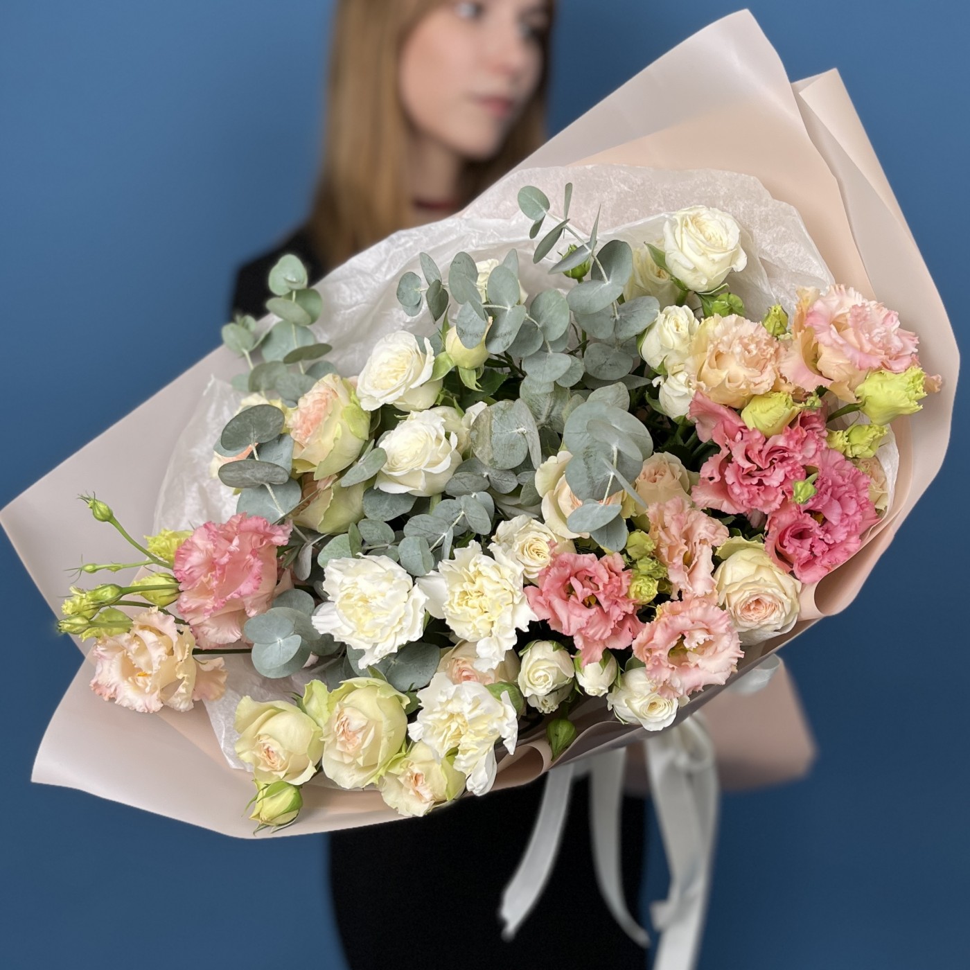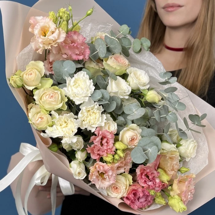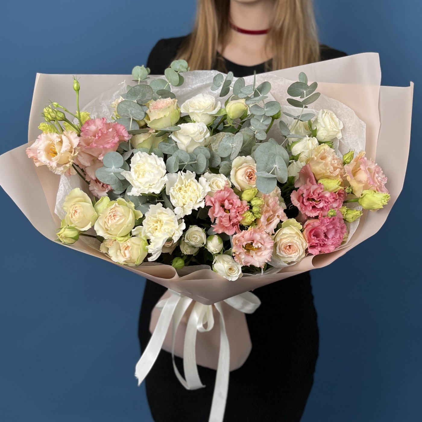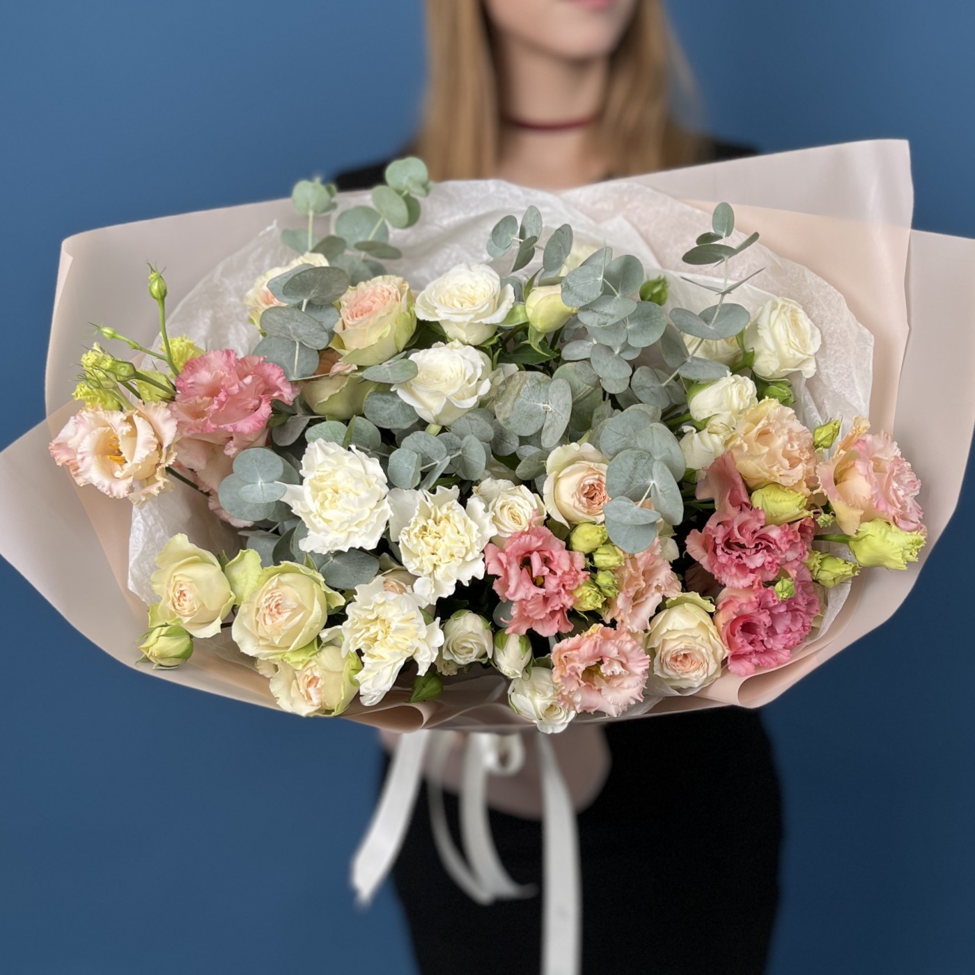 Изящный букет, объединяющий мягкие оттенки роз и утонченную красоту цветов. Эта композиция наполнена теплом и искренностью, дарит ощущение легкости и нежности, идеально подходит для выражения трепетных чувств и заботы.