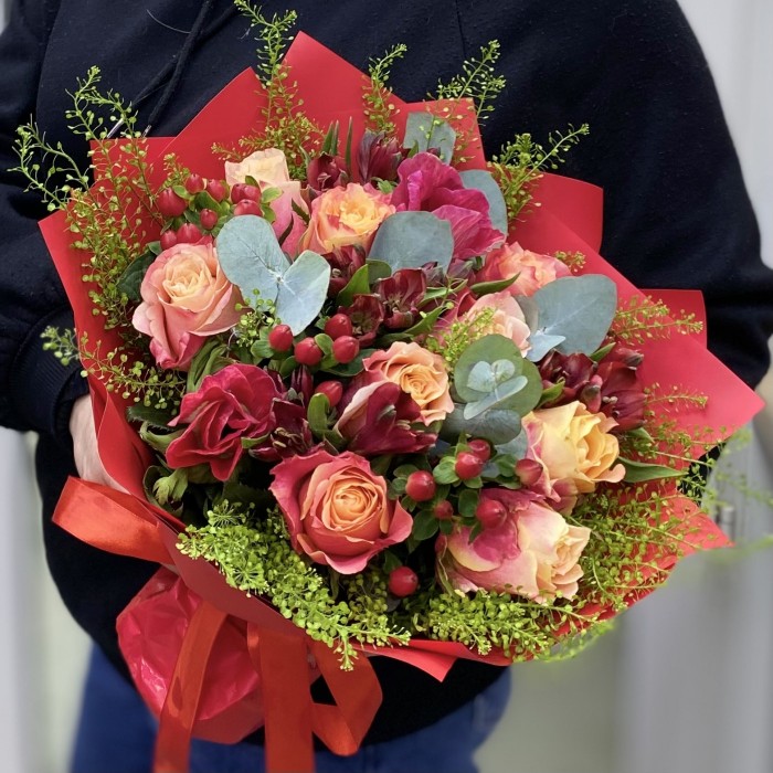 Состав: роза 3д - 9 шт, анемон красный - 3 шт, гиперикум красный - 3 шт, альстромерия красная - 4 шт, гринбел, эвкалипт, упаковка.