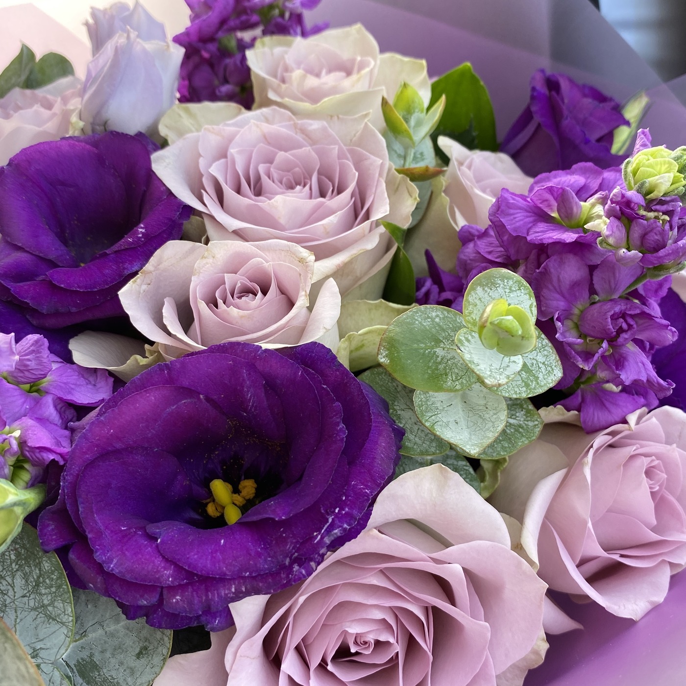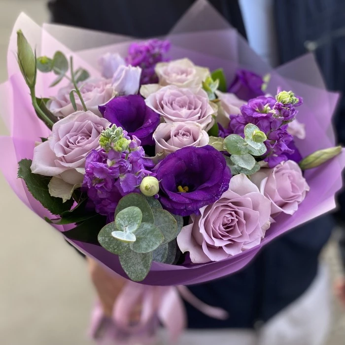 Букет из сиреневых роз и ароматной маттиолы