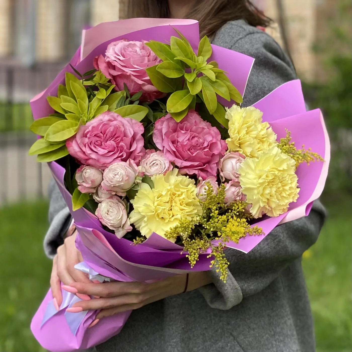 Яркий летний букет из ароматных пионовидных роз Кантри Блюз и желтых диантусов.