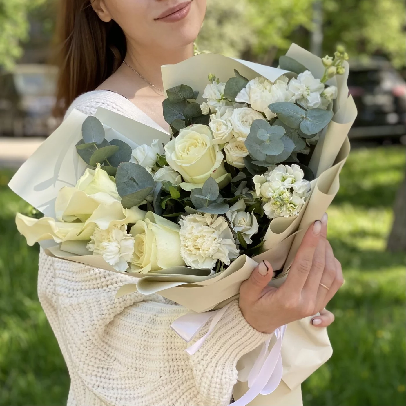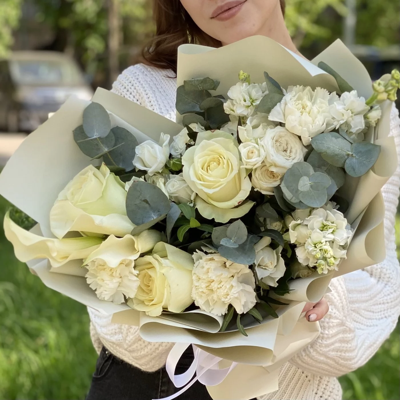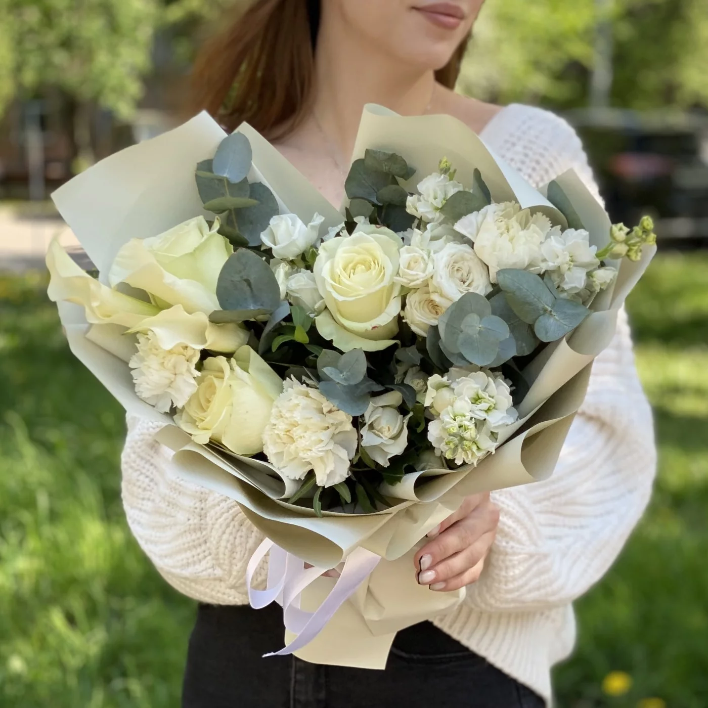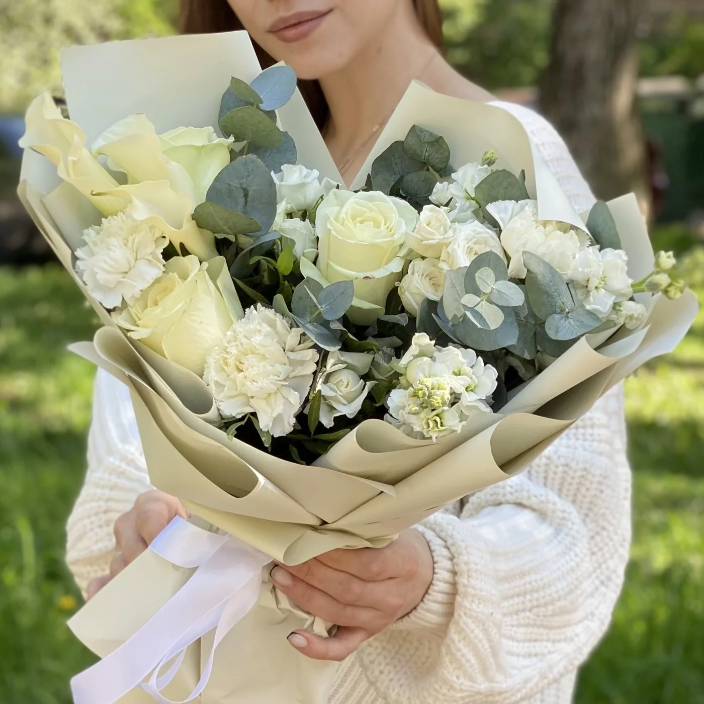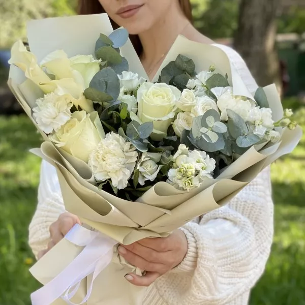 гвоздика белая - 3 шт, роза кустовая Сноу бабл - 3 шт, роза белая - 3 шт, эвкалипт - 1 шт, писташ - 2 шт, упаковка.