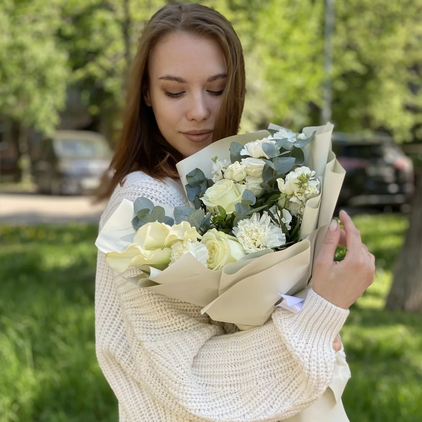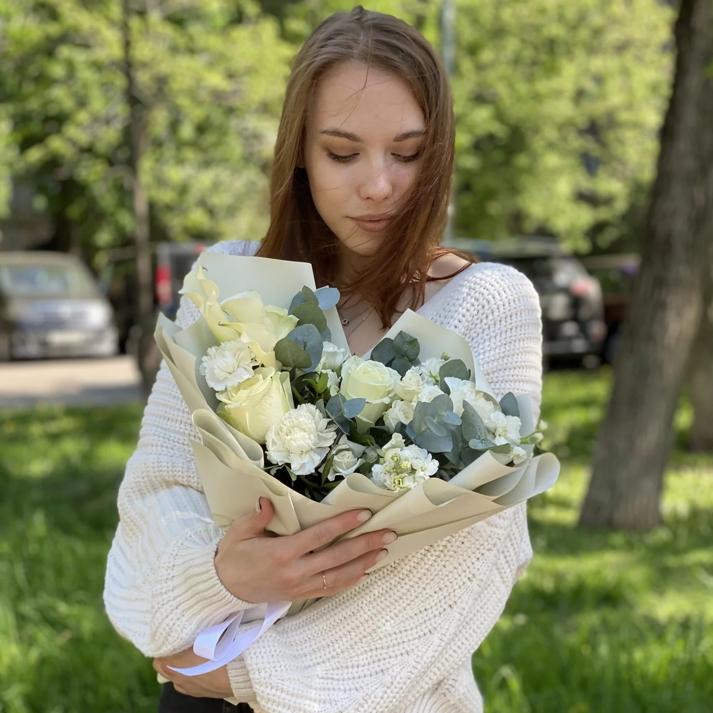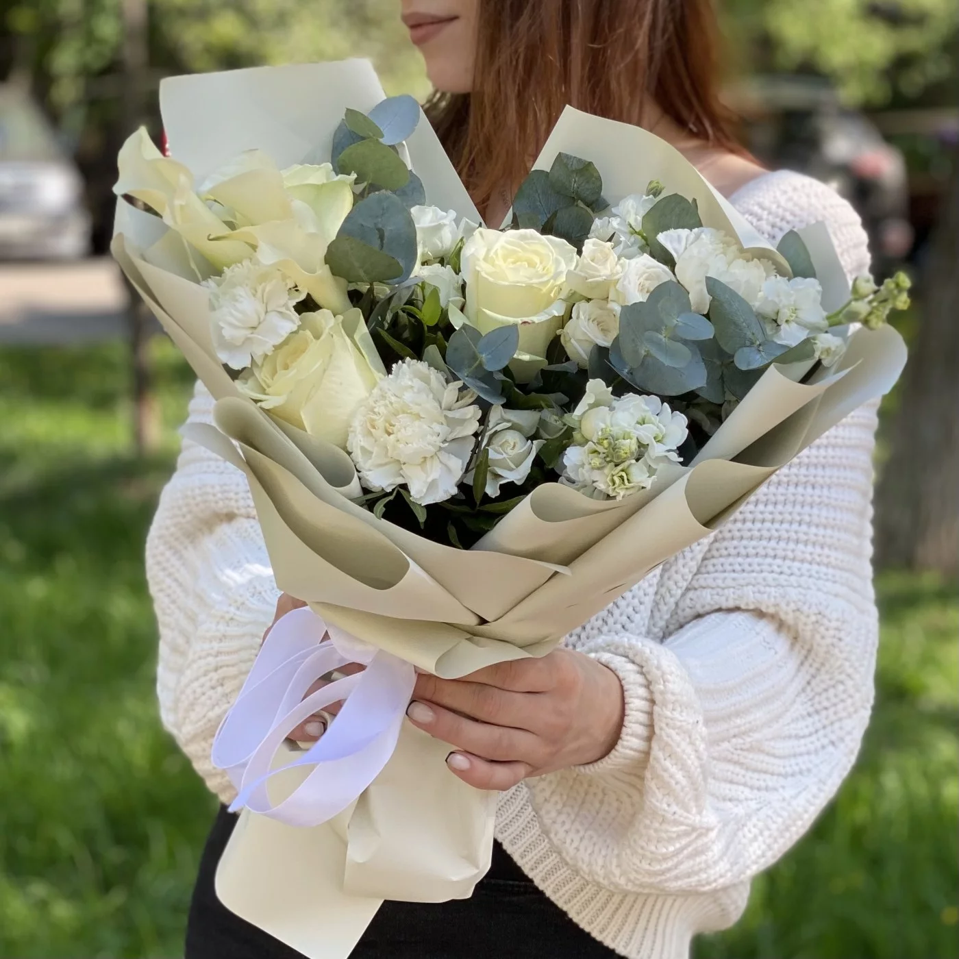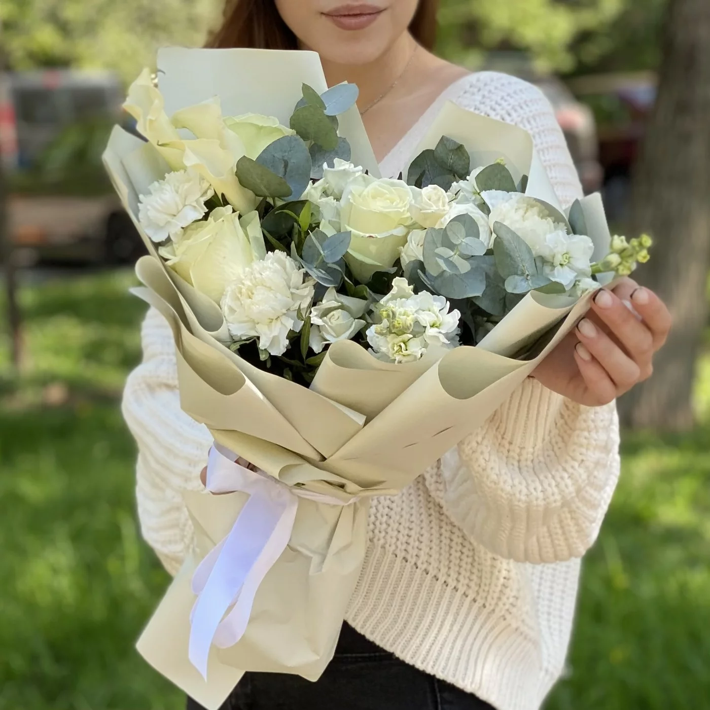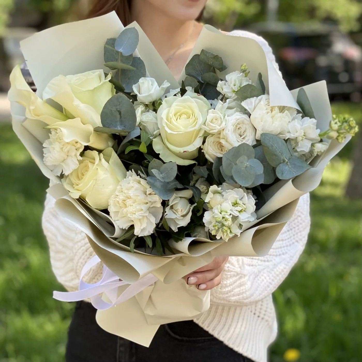 гвоздика белая - 3 шт, роза кустовая Сноу бабл - 3 шт, роза белая - 3 шт, эвкалипт - 1 шт, писташ - 2 шт, упаковка.