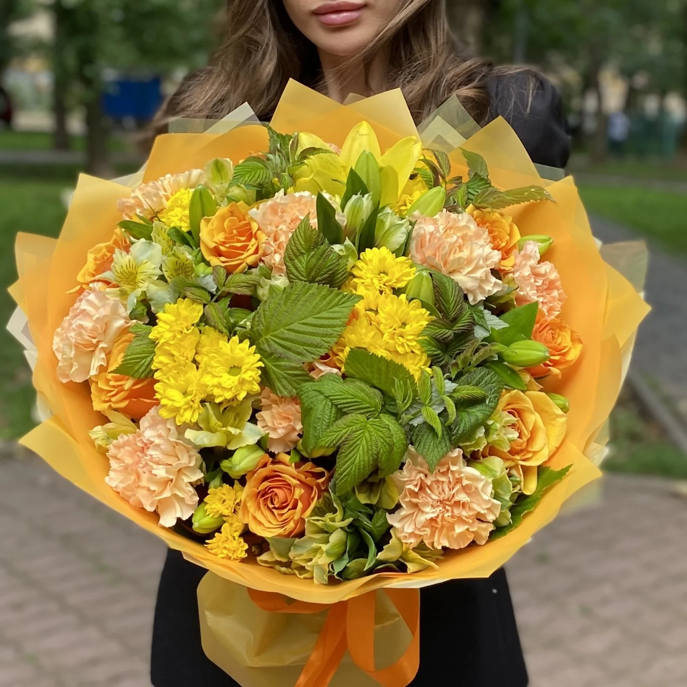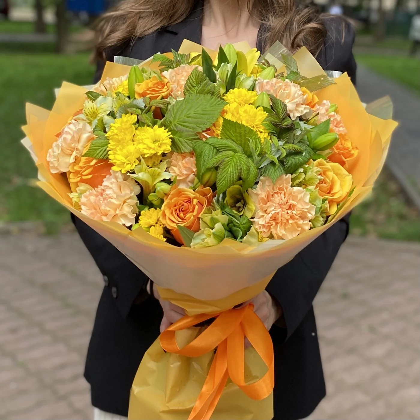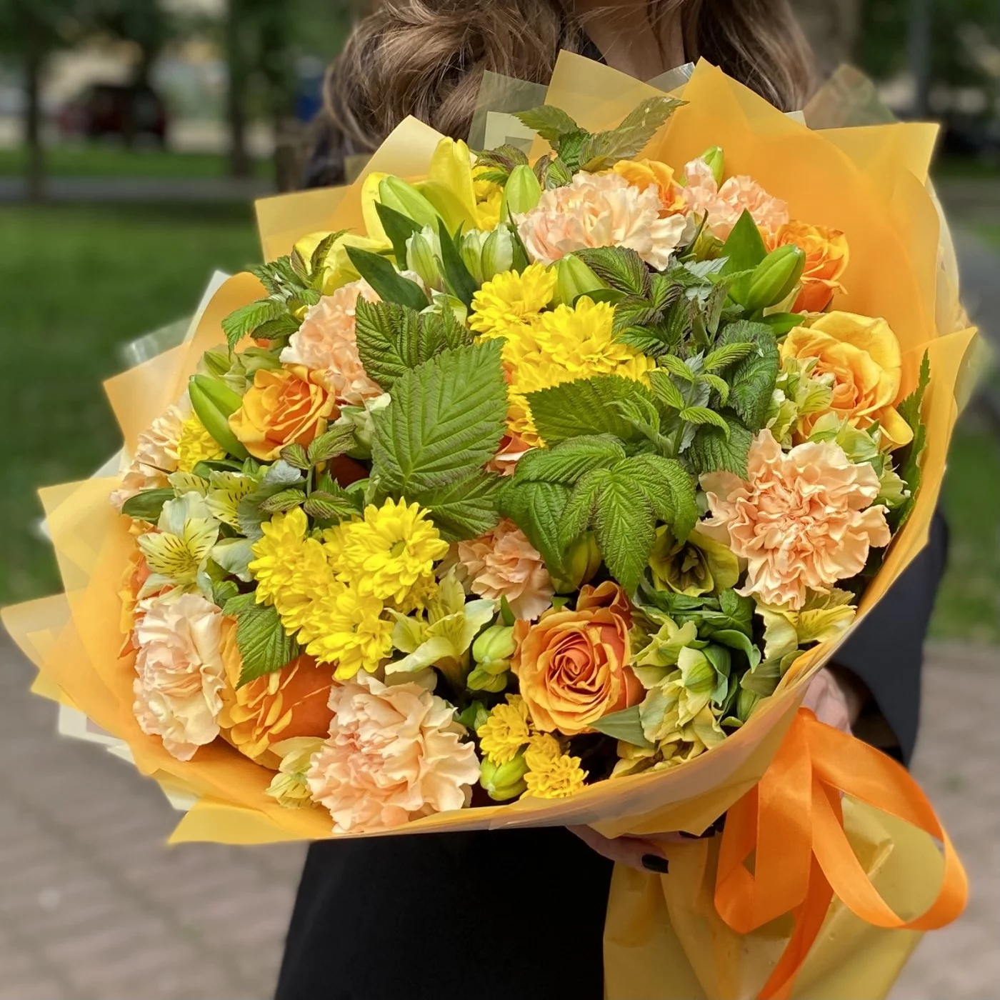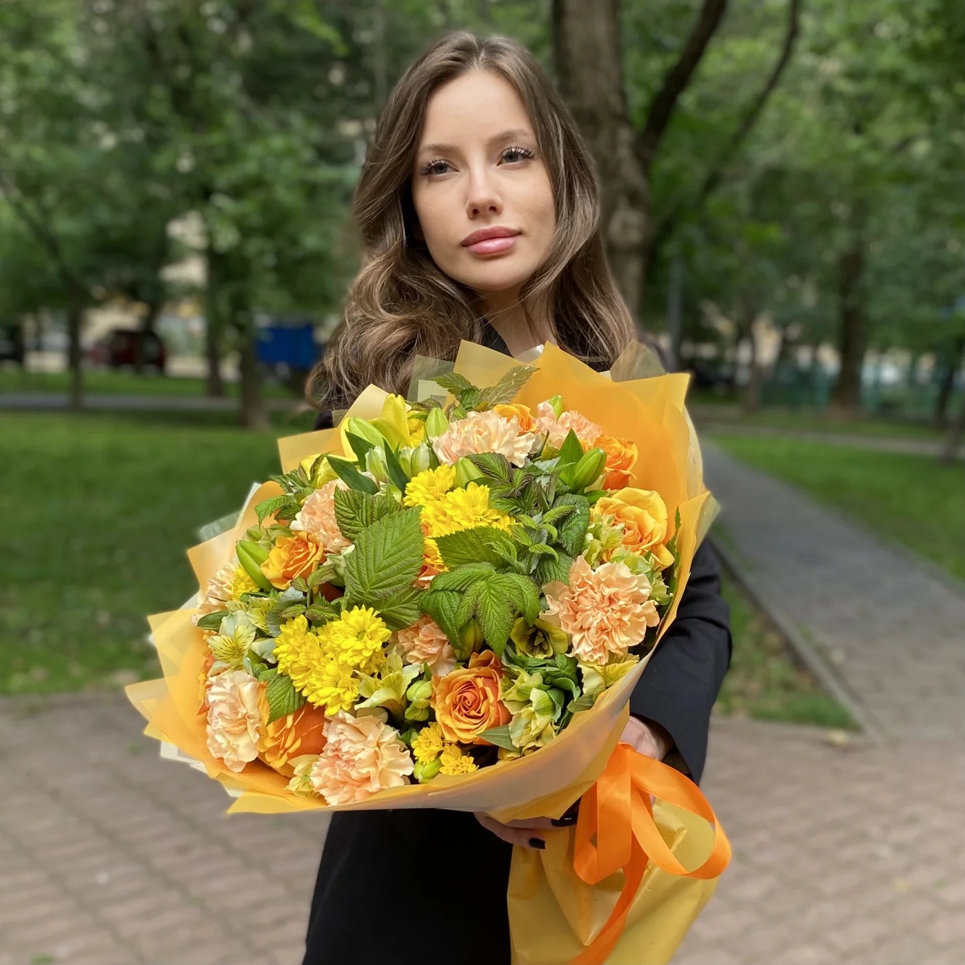 Яркий букет с хризантемами и оранжевыми розами с красивым крупным бутоном станет отличным подарком на юбилей или день рождения. Доставляем по Москве и Подмосковью.