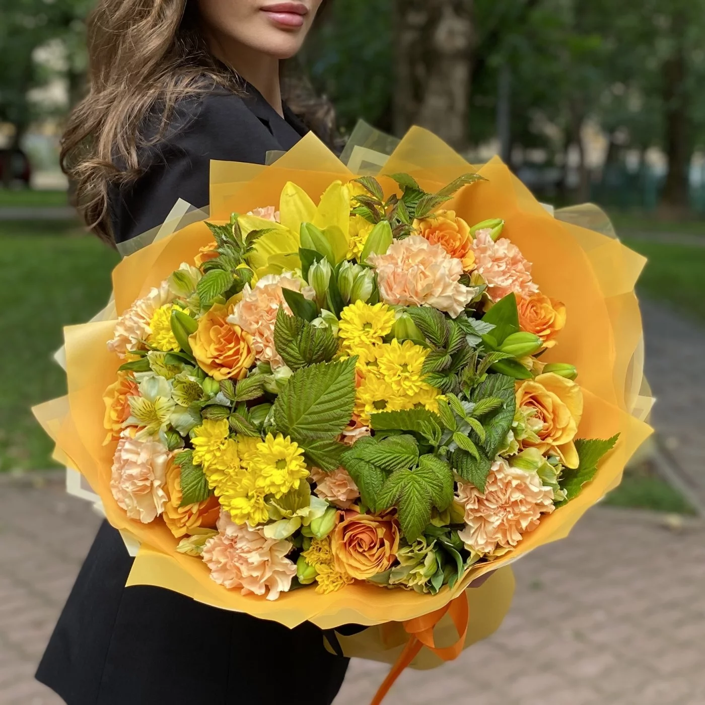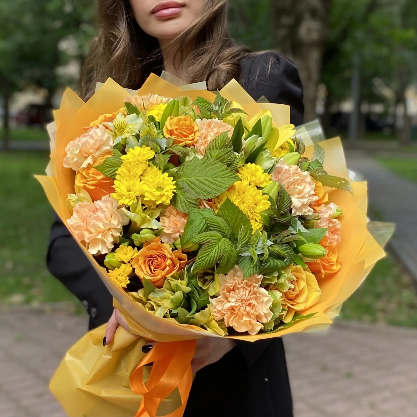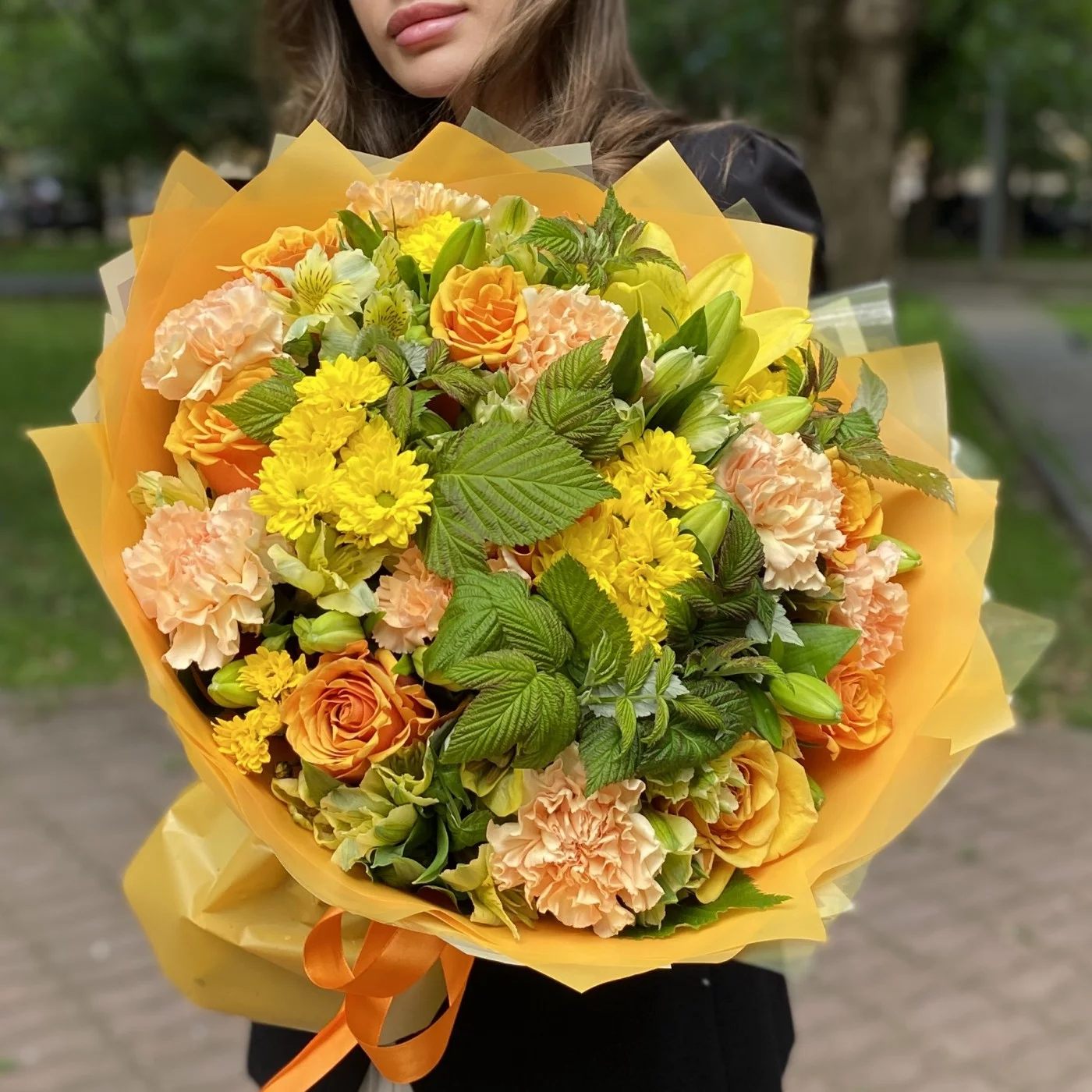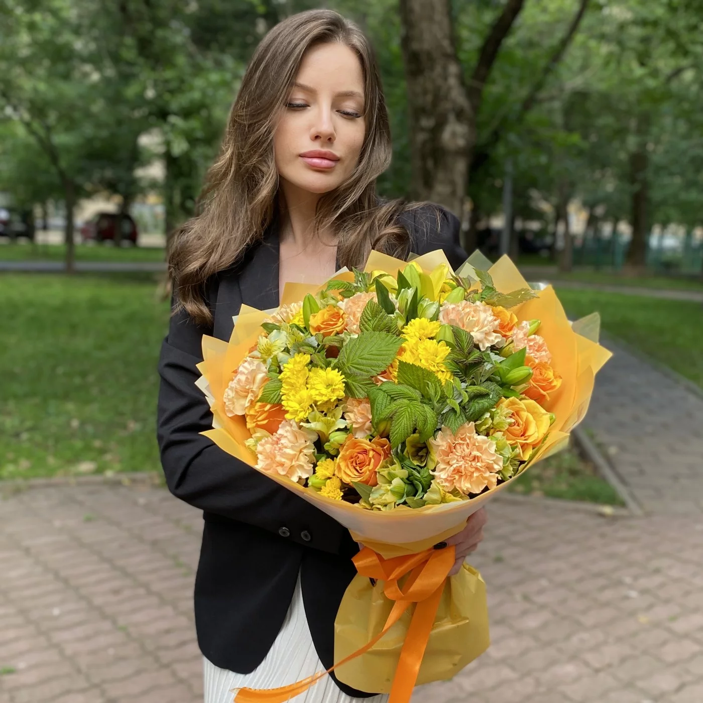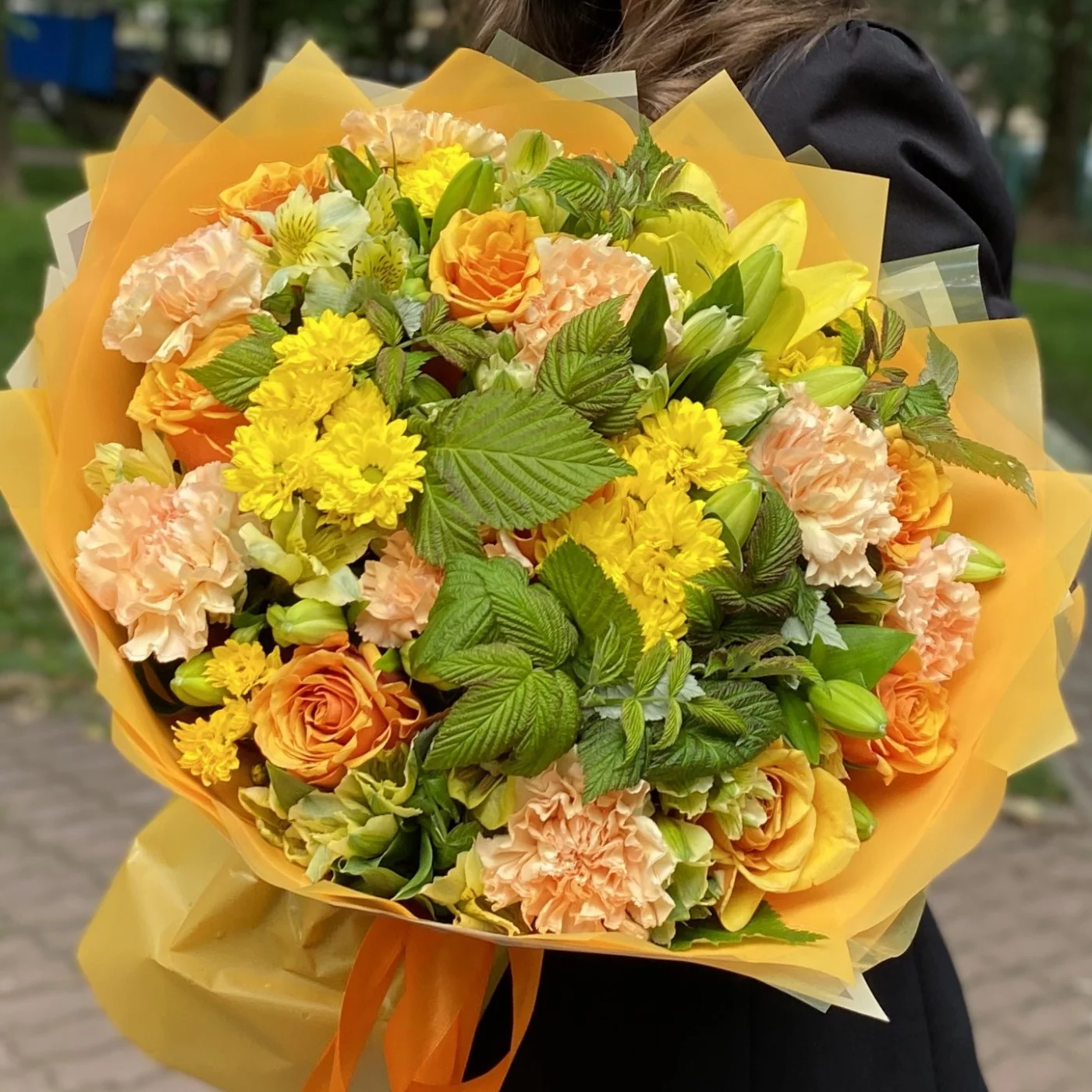 Яркий букет с хризантемами и оранжевыми розами с красивым крупным бутоном станет отличным подарком на юбилей или день рождения. Доставляем по Москве и Подмосковью.