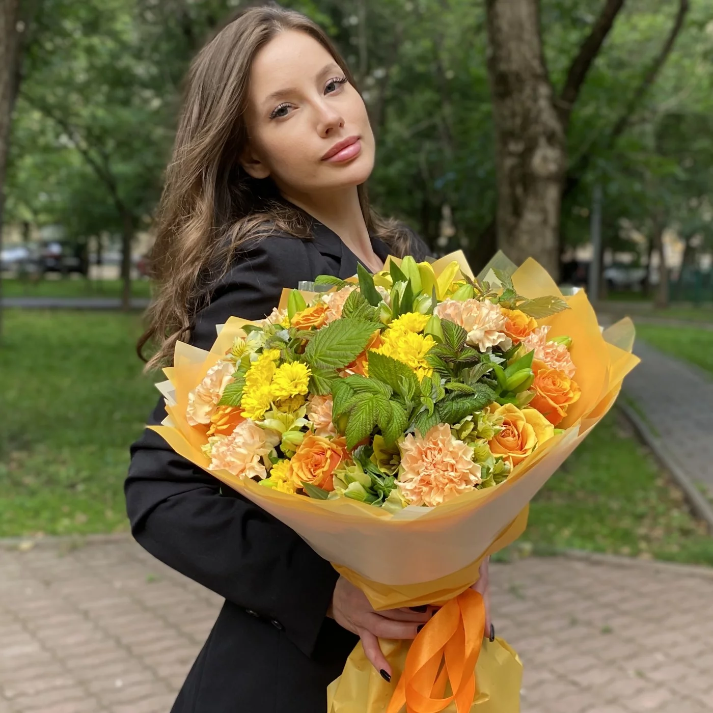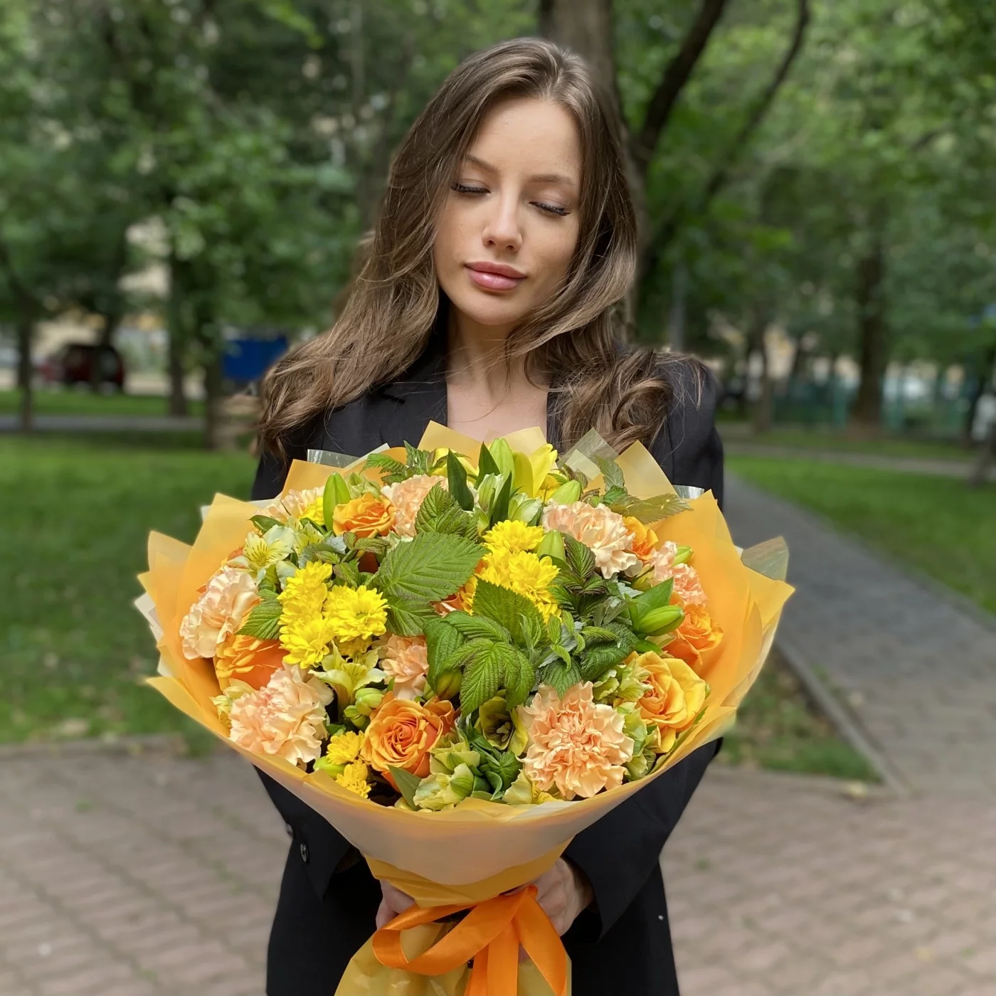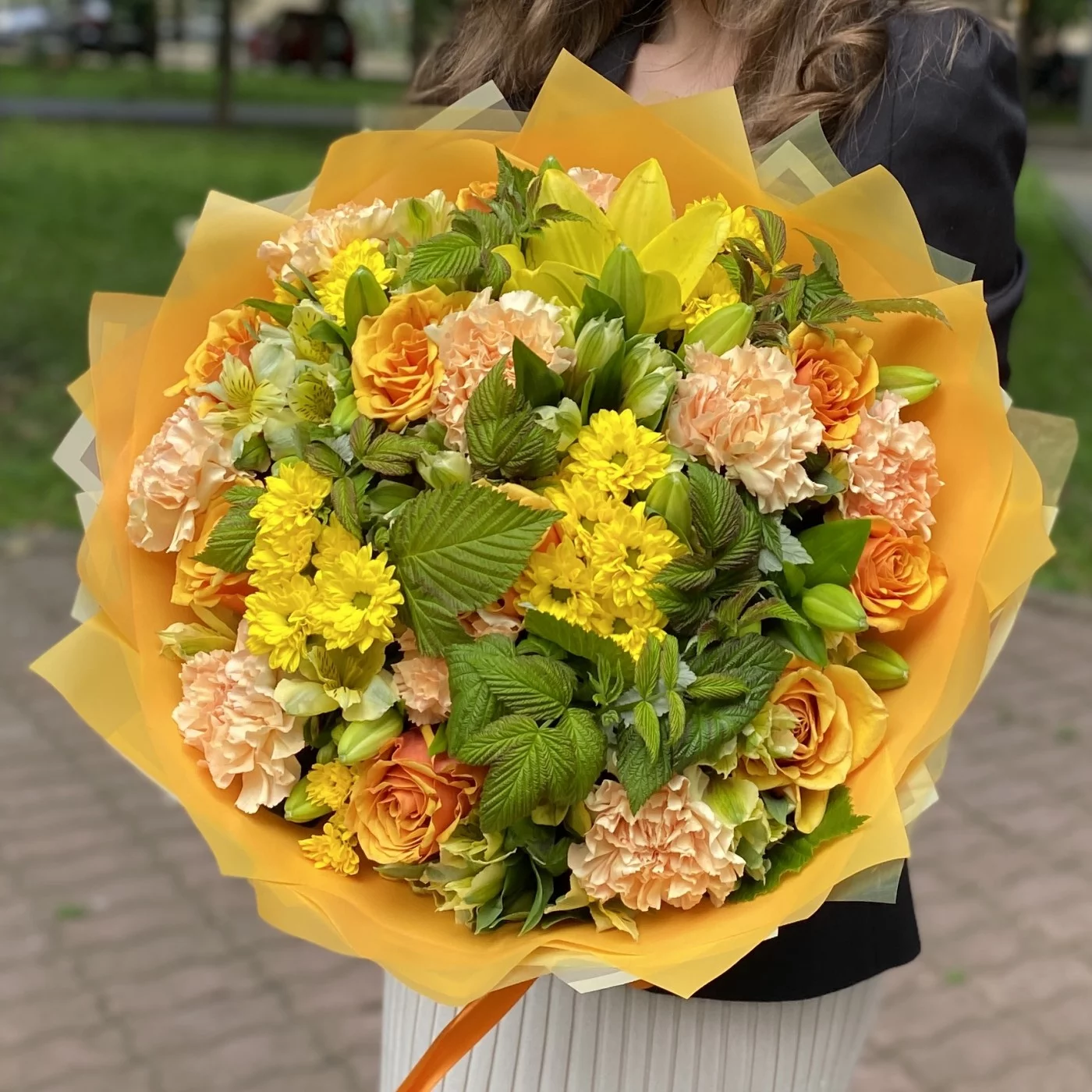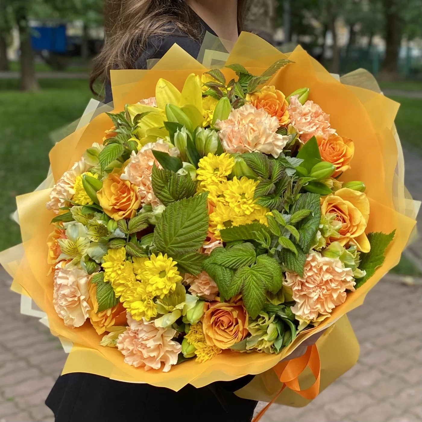 Яркий букет с хризантемами и оранжевыми розами с красивым крупным бутоном станет отличным подарком на юбилей или день рождения. Доставляем по Москве и Подмосковью.