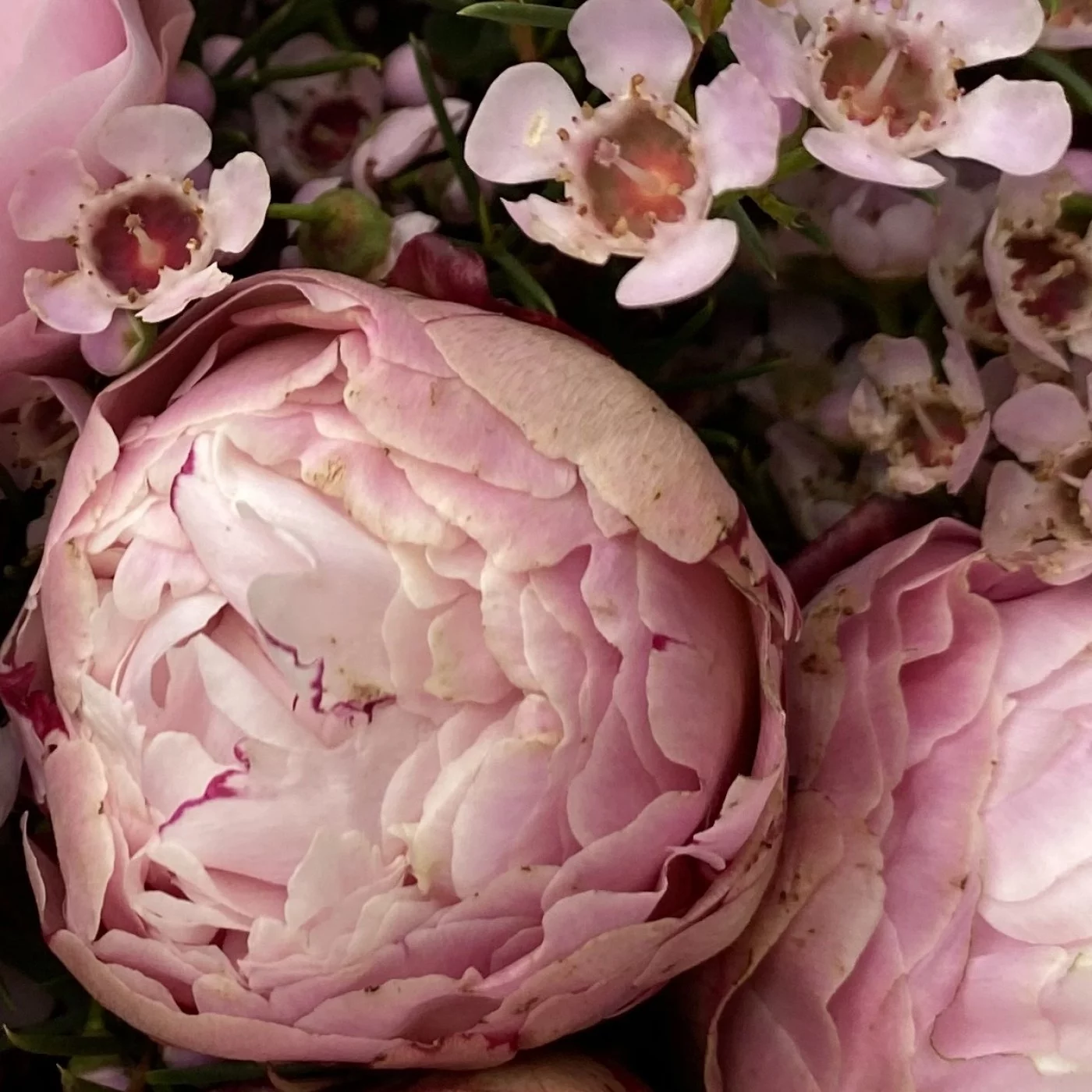Махровые розовые пионы в окружении розовых соцветий шамелациума.