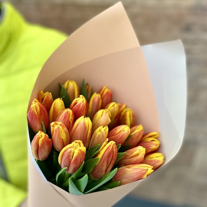 Весенний букет из 25 тюльпанов в упаковке. Букет из весенних, ярких, ароматных тюльпанов принесет массу удовольствия и восхищения. Его цветовая гамма напоминает вкусный и красивый фрукт маракуйя. Тюльпаны порадуют получателя легким ароматом и продолжительностью жизни.